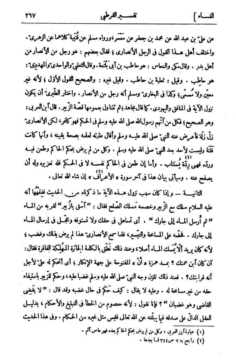 عَنْ عَلِيِّ بْنِ عَبْدِ اللَّهِ عَنْ مُحَمَّدِ بْنِ جَعْفَرٍ عَنْ مَعْمَرٍ، وَرَوَاهُ مُسْلِمٌ عَنْ قُتَيْبَةَ كِلَاهُمَا عَنِ الزُّهْرِيِّ. وَاخْتَلَفَ أَهْلُ هَذَا الْقَوْلِ فِي الرَّجُلِ الْأَنْصَارِيِّ، فَقَالَ بَعْضُهُمْ: هُوَ رَجُلٌ مِنَ الْأَنْصَارِ مِنْ أَهْلِ بَدْرٍ. وَقَالَ مَكِّيٌّ وَالنَّحَّاسُ: هُوَ حَاطِبُ بْنُ أَبِي بَلْتَعَةَ. وَقَالَ الثَّعْلَبِيُّ وَالْوَاحِدِيُّ وَالْمَهْدَوِيُّ: هُوَ حَاطِبٌ. وَقِيلَ: ثَعْلَبَةُ بْنُ حَاطِبٍ. وَقِيلَ غَيْرُهُ: وَالصَّحِيحُ الْقَوْلُ الْأَوَّلُ، لِأَنَّهُ غَيْرُ مُعَيَّنٍ وَلَا مُسَمًّى، وَكَذَا فِي الْبُخَارِيِّ وَمُسْلِمٍ أَنَّهُ رَجُلٌ مِنَ الْأَنْصَارِ. وَاخْتَارَ الطَّبَرِيُّ أَنْ يَكُونَ نُزُولُ الْآيَةِ فِي الْمُنَافِقِ وَالْيَهُودِيِّ. كَمَا قَالَ مُجَاهِدٌ، ثُمَّ تَتَنَاوَلُ بِعُمُومِهَا قِصَّةَ الزُّبَيْرِ. قَالَ ابْنُ الْعَرَبِيِّ: وَهُوَ الصَّحِيحُ، فَكُلُّ مَنِ اتَّهَمَ رَسُولَ اللَّهِ صَلَّى اللَّهُ عَلَيْهِ وَسَلَّمَ فِي الْحُكْمِ فَهُوَ كَافِرٌ، لَكِنَّ الْأَنْصَارِيَّ زَلَّ زَلَّةً فَأَعْرَضَ عَنْهُ النَّبِيُّ صَلَّى اللَّهُ عَلَيْهِ وَسَلَّمَ وَأَقَالَ عَثْرَتَهُ لِعِلْمِهِ بِصِحَّةِ يَقِينِهِ، وَأَنَّهَا كَانَتْ فَلْتَةٌ وَلَيْسَتْ لِأَحَدٍ بَعْدَ النَّبِيِّ صَلَّى اللَّهُ عَلَيْهِ وَسَلَّمَ. وَكُلُّ مَنْ لَمْ يَرْضَ بِحُكْمِ الْحَاكِمِ وَطَعَنَ فِيهِ ورده فهي ردة «١» يستتاب. وأما إِنْ طَعَنَ فِي الْحَاكِمِ نَفْسَهُ لَا فِي الْحُكْمِ فَلَهُ تَعْزِيرُهُ وَلَهُ أَنْ يَصْفَحَ عَنْهُ. وَسَيَأْتِي بَيَانُ هَذَا فِي آخِرِ سُورَةِ (الْأَعْرَافِ «٢») إِنْ شَاءَ اللَّهُ تَعَالَى. الثَّانِيةُ- وَإِذَا كَانَ سَبَبُ نُزُولِ هَذِهِ الْآيَةِ مَا ذَكَرْنَاهُ مِنَ الْحَدِيثِ فَفِقْهُهَا أَنَّهُ عَلَيْهِ السَّلَامُ سَلَكَ مَعَ الزُّبَيْرِ وَخَصْمِهِ مَسْلَكَ الصُّلْحِ فَقَالَ: (اسْقِ يَا زُبَيْرُ) لِقُرْبِهِ مِنَ الْمَاءِ (ثُمَّ أَرْسِلِ الْمَاءَ إِلَى جَارِكَ). أَيْ تَسَاهَلْ فِي حَقِّكَ وَلَا تَسْتَوْفِهِ وَعَجِّلْ فِي إِرْسَالِ الْمَاءِ إِلَى جَارِكَ. فَحَضَّهُ عَلَى الْمُسَامَحَةِ وَالتَّيْسِيرِ، فَلَمَّا سَمِعَ الْأَنْصَارِيُّ هَذَا لَمْ يَرْضَ بِذَلِكَ وَغَضِبَ، لِأَنَّهُ كَانَ يربد أَلَّا يُمْسِكَ الْمَاءَ أَصْلًا، وَعِنْدَ ذَلِكَ نَطَقَ بِالْكَلِمَةِ الْجَائِرَةِ الْمُهْلِكَةِ الْفَاقِرَةِ فَقَالَ: آنْ كَانَ ابْنَ عَمَّتِكَ؟ بِمَدِّ هَمْزَةِ (أَنْ) الْمَفْتُوحَةِ عَلَى جِهَةِ الْإِنْكَارِ، أَيْ أَتَحْكُمُ لَهُ عَلَيَّ لِأَجْلِ أَنَّهُ قَرَابَتُكَ؟. فَعِنْدَ ذَلِكَ تَلَوَّنَ وَجْهُ النَّبِيِّ صَلَّى اللَّهُ عَلَيْهِ وَسَلَّمَ غَضَبًا عَلَيْهِ، وَحَكَمَ لِلزُّبَيْرِ بِاسْتِيفَاءِ حَقِّهِ مِنْ غَيْرِ مُسَامَحَةٍ لَهُ. وَعَلَيْهِ لَا يُقَالُ: كَيْفَ حَكَمَ فِي حَالِ غَضَبِهِ وَقَدْ قَالَ: (لَا يَقْضِي الْقَاضِي وَهُوَ غَضْبَانُ)؟ فَإِنَّا نَقُولُ: لِأَنَّهُ مَعْصُومٌ مِنَ الْخَطَأِ فِي التَّبْلِيغِ وَالْأَحْكَامِ، بِدَلِيلِ الْعَقْلِ الدَّالِّ عَلَى صِدْقِهِ فِيمَا يُبَلِّغُهُ عَنِ اللَّهِ تَعَالَى فَلَيْسَ مِثْلَ غَيْرِهِ مِنَ الْحُكَّامِ. وَفِي هَذَا الْحَدِيثِ