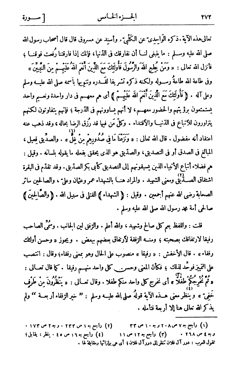 تَعَالَى هَذِهِ الْآيَةَ. ذَكَرَهُ الْوَاحِدِيُّ عَنِ الْكَلْبِيِّ. وَأَسْنَدَ عَنْ مَسْرُوقٍ قَالَ قَالَ أَصْحَابُ رَسُولِ اللَّهِ صَلَّى اللَّهُ عَلَيْهِ وَسَلَّمَ: مَا يَنْبَغِي لَنَا أَنْ نُفَارِقَكَ فِي الدُّنْيَا، فَإِنَّكَ إِذَا فَارَقْتَنَا رُفِعْتَ فَوْقَنَا، فَأَنْزَلَ اللَّهُ تَعَالَى: (وَمَنْ يُطِعِ اللَّهَ وَالرَّسُولَ فَأُولئِكَ مَعَ الَّذِينَ أَنْعَمَ اللَّهُ عَلَيْهِمْ مِنَ النَّبِيِّينَ). وَفِي طَاعَةِ اللَّهِ طَاعَةُ رَسُولِهِ وَلَكِنَّهُ ذَكَرَهُ تَشْرِيفًا لِقَدْرِهِ وَتَنْوِيهًا بِاسْمِهِ صَلَّى اللَّهُ عَلَيْهِ وَسَلَّمَ وَعَلَى آلِهِ. (فَأُولئِكَ مَعَ الَّذِينَ أَنْعَمَ اللَّهُ عَلَيْهِمْ) أَيْ هُمْ مَعَهُمْ فِي دَارٍ وَاحِدَةٍ وَنَعِيمٍ وَاحِدٍ يَسْتَمْتِعُونَ بِرُؤْيَتِهِمْ وَالْحُضُورِ مَعَهُمْ، لَا أَنَّهُمْ يُسَاوُونَهُمْ فِي الدَّرَجَةِ، فَإِنَّهُمْ يَتَفَاوَتُونَ لَكِنَّهُمْ يَتَزَاوَرُونَ لِلِاتِّبَاعِ فِي الدُّنْيَا وَالِاقْتِدَاءِ. وَكُلُّ مَنْ فِيهَا قَدْ رُزِقَ الرِّضَا بِحَالِهِ، وَقَدْ ذَهَبَ عَنْهُ اعْتِقَادُ أَنَّهُ مَفْضُولٌ. قَالَ اللَّهُ تَعَالَى: (وَنَزَعْنا مَا فِي صُدُورِهِمْ مِنْ غِلٍّ «١»). وَالصِّدِّيقُ فِعِّيلٌ، الْمُبَالِغُ فِي الصِّدْقِ أَوْ فِي التَّصْدِيقِ، وَالصِّدِّيقُ هُوَ الَّذِي يُحَقِّقُ بِفِعْلِهِ مَا يَقُولُ بِلِسَانِهِ. وَقِيلَ: هُمْ فُضَلَاءُ أَتْبَاعِ الْأَنْبِيَاءِ الَّذِينَ يَسْبِقُونَهُمْ إِلَى التَّصْدِيقِ كَأَبِي بَكْرٍ الصِّدِّيقِ. وَقَدْ تَقَدَّمَ فِي الْبَقَرَةِ اشْتِقَاقُ الصِّدِّيقِ «٢» وَمَعْنَى الشَّهِيدِ. وَالْمُرَادُ هُنَا بِالشُّهَدَاءِ عُمَرُ وَعُثْمَانُ وَعَلِيٌّ، وَالصَّالِحِينَ سَائِرُ الصَّحَابَةِ رضي الله عنهم أجمعين. وقيل: الشُّهَداءِ) القتلى في سبيل الله. (الصَّالِحِينَ) صَالِحِي أُمَّةِ مُحَمَّدٍ رَسُولِ اللَّهِ صَلَّى اللَّهُ عَلَيْهِ وَسَلَّمَ. قُلْتُ: وَاللَّفْظُ يَعُمُّ كُلَّ صَالِحٍ وَشَهِيدٍ، وَاللَّهُ أَعْلَمُ. وَالرِّفْقُ لِينُ الْجَانِبِ. وَسُمِّيَ الصَّاحِبُ رَفِيقًا لِارْتِفَاقِكَ بِصُحْبَتِهِ، وَمِنْهُ الرُّفْقَةُ لِارْتِفَاقِ بَعْضِهِمْ بِبَعْضٍ. وَيَجُوزُ (وَحَسُنَ أُولَئِكَ رُفَقَاءَ). قَالَ الْأَخْفَشُ: (رَفِيقاً) مَنْصُوبٌ عَلَى الْحَالِ وَهُوَ بِمَعْنَى رُفَقَاءَ، وَقَالَ: انْتَصَبَ عَلَى التَّمْيِيزِ فَوُحِّدَ لِذَلِكَ، فَكَأَنَّ الْمَعْنَى وَحَسُنَ كُلُّ وَاحِدٍ مِنْهُمْ رَفِيقًا. كَمَا قَالَ تَعَالَى: (ثُمَّ نُخْرِجُكُمْ طِفْلًا «٣») أَيْ نُخْرِجُ كُلَّ وَاحِدٍ مِنْكُمْ طِفْلًا. وَقَالَ تَعَالَى: (يَنْظُرُونَ مِنْ طَرْفٍ خَفِيٍّ) وَيُنْظَرُ «٤» مَعْنَى هَذِهِ الْآيَةِ قَوْلُهُ صَلَّى اللَّهُ عَلَيْهِ وَسَلَّمَ: (خَيْرُ الرُّفَقَاءِ أَرْبَعَةٌ) وَلَمْ يَذْكُرِ اللَّهُ تَعَالَى هُنَا إلا أربعة فتأمله.
