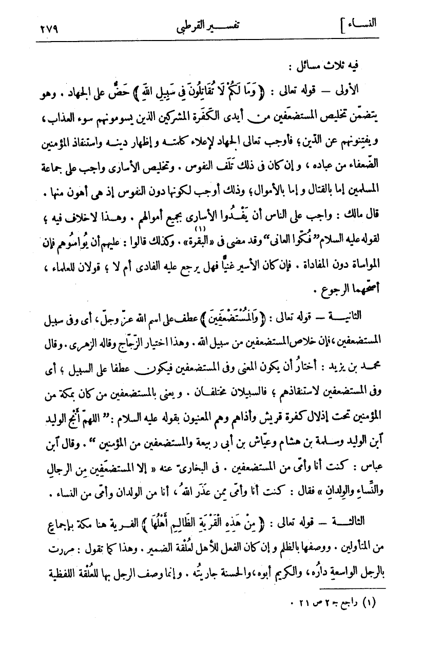 فِيهِ ثَلَاثُ مَسَائِلَ: الْأُولَى- قَوْلُهُ تَعَالَى: (وَما لَكُمْ لَا تُقاتِلُونَ فِي سَبِيلِ اللَّهِ) حَضٌّ عَلَى الْجِهَادِ. وَهُوَ يَتَضَمَّنُ تَخْلِيصَ الْمُسْتَضْعَفِينَ مِنْ أَيْدِي الْكَفَرَةِ الْمُشْرِكِينَ الَّذِينَ يَسُومُونَهُمْ سُوءَ الْعَذَابِ، وَيَفْتِنُونَهُمْ عَنِ الدِّينِ، فَأَوْجَبَ تَعَالَى الْجِهَادَ لِإِعْلَاءِ كَلِمَتِهِ وَإِظْهَارِ دِينِهِ وَاسْتِنْقَاذِ الْمُؤْمِنِينَ الضُّعَفَاءِ مِنْ عِبَادِهِ، وَإِنْ كَانَ فِي ذَلِكَ تَلَفُ النُّفُوسِ. وَتَخْلِيصُ الْأُسَارَى وَاجِبٌ عَلَى جَمَاعَةِ الْمُسْلِمِينَ إِمَّا بِالْقِتَالِ وَإِمَّا بِالْأَمْوَالِ، وَذَلِكَ أَوْجَبُ لِكَوْنِهَا دُونَ النُّفُوسِ إِذْ هِيَ أَهْوَنُ مِنْهَا. قَالَ مَالِكٌ: وَاجِبٌ عَلَى النَّاسِ أَنْ يَفْدُوا الْأُسَارَى بِجَمِيعِ أَمْوَالِهِمْ. وَهَذَا لَا خِلَافَ فِيهِ، لِقَوْلِهِ عَلَيْهِ السَّلَامُ (فُكُّوا الْعَانِيَ) وَقَدْ مَضَى فِي (الْبَقَرَةِ «١»). وَكَذَلِكَ قَالُوا: عَلَيْهِمْ أَنْ يُوَاسُوهُمْ فَإِنَّ الْمُوَاسَاةَ دُونَ الْمُفَادَاةِ. فَإِنْ كَانَ الْأَسِيرُ غَنِيًّا فَهَلْ يَرْجِعُ عَلَيْهِ الْفَادِي أَمْ لَا، قَوْلَانِ لِلْعُلَمَاءِ، أَصَحُّهُمَا الرُّجُوعُ. الثَّانِيةُ- قَوْلُهُ تَعَالَى: (وَالْمُسْتَضْعَفِينَ) عَطْفٌ عَلَى اسْمِ اللَّهِ عَزَّ وَجَلَّ، أَيْ وَفِي سَبِيلِ الْمُسْتَضْعَفِينَ، فَإِنَّ خَلَاصَ الْمُسْتَضْعَفِينَ مِنْ سَبِيلِ اللَّهِ. وَهَذَا اخْتِيَارُ الزَّجَّاجِ وَقَالَهُ الزُّهْرِيُّ. وَقَالَ مُحَمَّدُ بْنُ يَزِيدَ: أَخْتَارُ أَنْ يَكُونَ الْمَعْنَى وَفِي الْمُسْتَضْعَفِينَ فَيَكُونُ عَطْفًا عَلَى السَّبِيلِ، أَيْ وَفِي الْمُسْتَضْعَفِينَ لِاسْتِنْقَاذِهِمْ، فَالسَّبِيلَانِ مُخْتَلِفَانِ. وَيَعْنِي بِالْمُسْتَضْعَفِينَ مَنْ كَانَ بِمَكَّةَ مِنَ الْمُؤْمِنِينَ تَحْتَ إِذْلَالِ كَفَرَةِ قُرَيْشٍ وَأَذَاهُمْ وَهُمُ الْمَعْنِيُّونَ بِقَوْلِهِ عَلَيْهِ السلام: (اللهم أنج الوليد ابن الْوَلِيدِ وَسَلَمَةَ بْنَ هِشَامٍ وَعَيَّاشَ بْنَ أَبِي رَبِيعَةَ وَالْمُسْتَضْعَفِينَ مِنَ الْمُؤْمِنِينَ (. وَقَالَ ابْنُ عَبَّاسٍ: كُنْتُ أَنَا وَأُمِّي مِنَ الْمُسْتَضْعَفِينَ. فِي الْبُخَارِيِّ عَنْهُ (إِلَّا الْمُسْتَضْعَفِينَ مِنَ الرِّجَالِ وَالنِّسَاءِ وَالْوِلْدَانِ) فَقَالَ: كُنْتُ أَنَا وَأُمِّي مِمَّنْ عَذَرَ اللَّهُ، أَنَا مِنَ الْوِلْدَانِ وَأُمِّي مِنَ النِّسَاءِ. الثَّالِثَةُ- قَوْلُهُ تَعَالَى: (مِنْ هذِهِ الْقَرْيَةِ الظَّالِمِ أَهْلُها) الْقَرْيَةُ هُنَا مَكَّةُ بِإِجْمَاعٍ مِنَ الْمُتَأَوِّلِينَ. وَوَصْفُهَا بِالظُّلْمِ وَإِنْ كَانَ الْفِعْلُ لِلْأَهْلِ لِعُلْقَةِ الضَّمِيرِ. وَهَذَا كَمَا تَقُولُ: مَرَرْتُ بِالرَّجُلِ الْوَاسِعَةِ دَارُهُ، وَالْكَرِيمِ أَبُوهُ، وَالْحَسَنَةِ جَارِيَتُهُ. وَإِنَّمَا وَصَفَ الرَّجُلَ بها للعلقة اللفظية