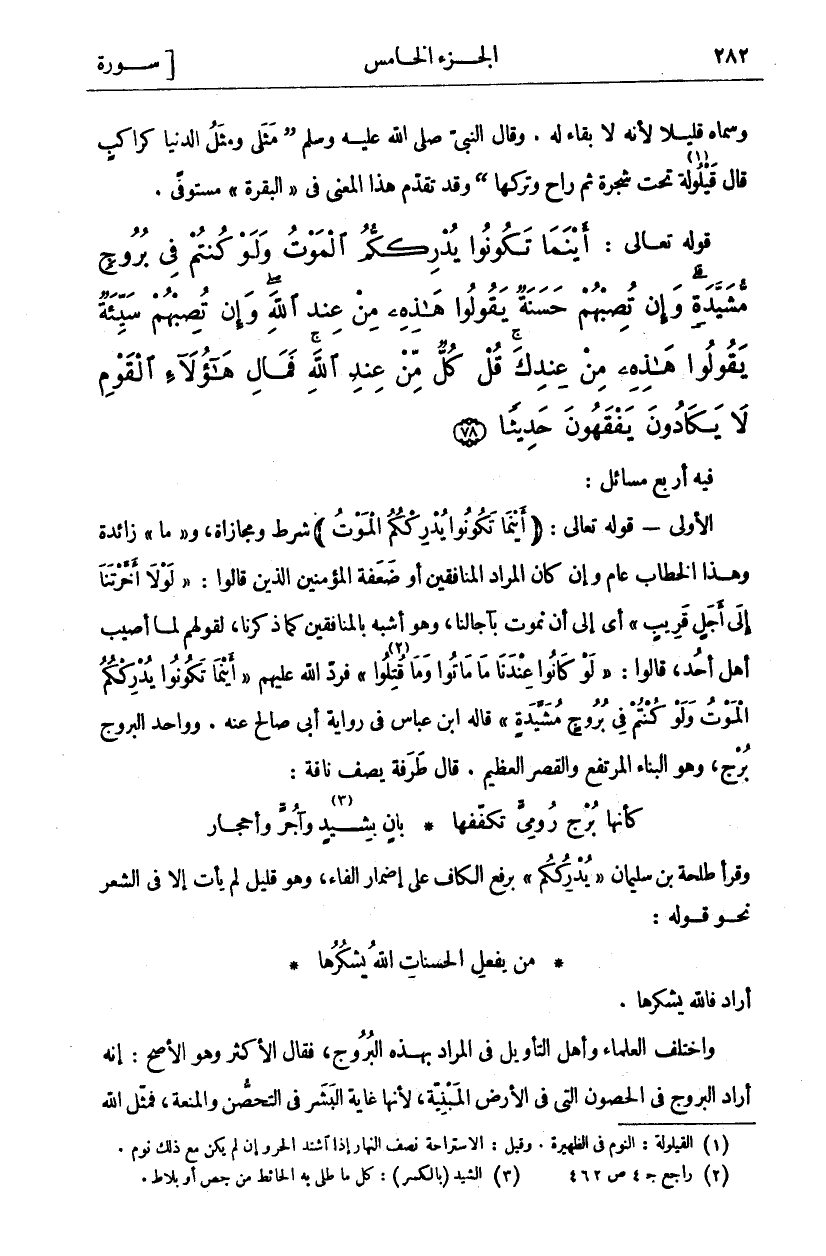 فِيهِ أَرْبَعُ مَسَائِلَ: الْأُولَى- قَوْلُهُ تَعَالَى: (أَيْنَما تَكُونُوا يُدْرِكْكُمُ الْمَوْتُ) شَرْطٌ وَمُجَازَاةٌ، وَ (مَا) زَائِدَةٌ وَهَذَا الْخِطَابُ عَامٌّ وَإِنْ كَانَ الْمُرَادُ الْمُنَافِقِينَ أَوْ ضَعَفَةَ الْمُؤْمِنِينَ الَّذِينَ قَالُوا: (لَوْلا أَخَّرْتَنا إِلى أَجَلٍ قَرِيبٍ) أَيْ إِلَى أَنْ نموت بآجالنا، وهو أشبه بالمنافقين كَمَا ذَكَرْنَا، لِقَوْلِهِمْ لَمَّا أُصِيبَ أَهْلُ أُحُدٍ، قَالُوا: (لَوْ كانُوا عِنْدَنا مَا ماتُوا وَما قُتِلُوا «٢») فَرَدَّ اللَّهُ عَلَيْهِمْ (أَيْنَما تَكُونُوا يُدْرِكْكُمُ الْمَوْتُ وَلَوْ كُنْتُمْ فِي بُرُوجٍ مُشَيَّدَةٍ) قَالَهُ ابْنُ عَبَّاسٍ فِي رِوَايَةِ أَبِي صَالِحٍ عَنْهُ. وَوَاحِدُ الْبُرُوجِ بُرْجٌ، وَهُوَ الْبِنَاءُ الْمُرْتَفِعُ وَالْقَصْرُ الْعَظِيمُ. قَالَ طَرَفَةُ يَصِفُ نَاقَةً:
