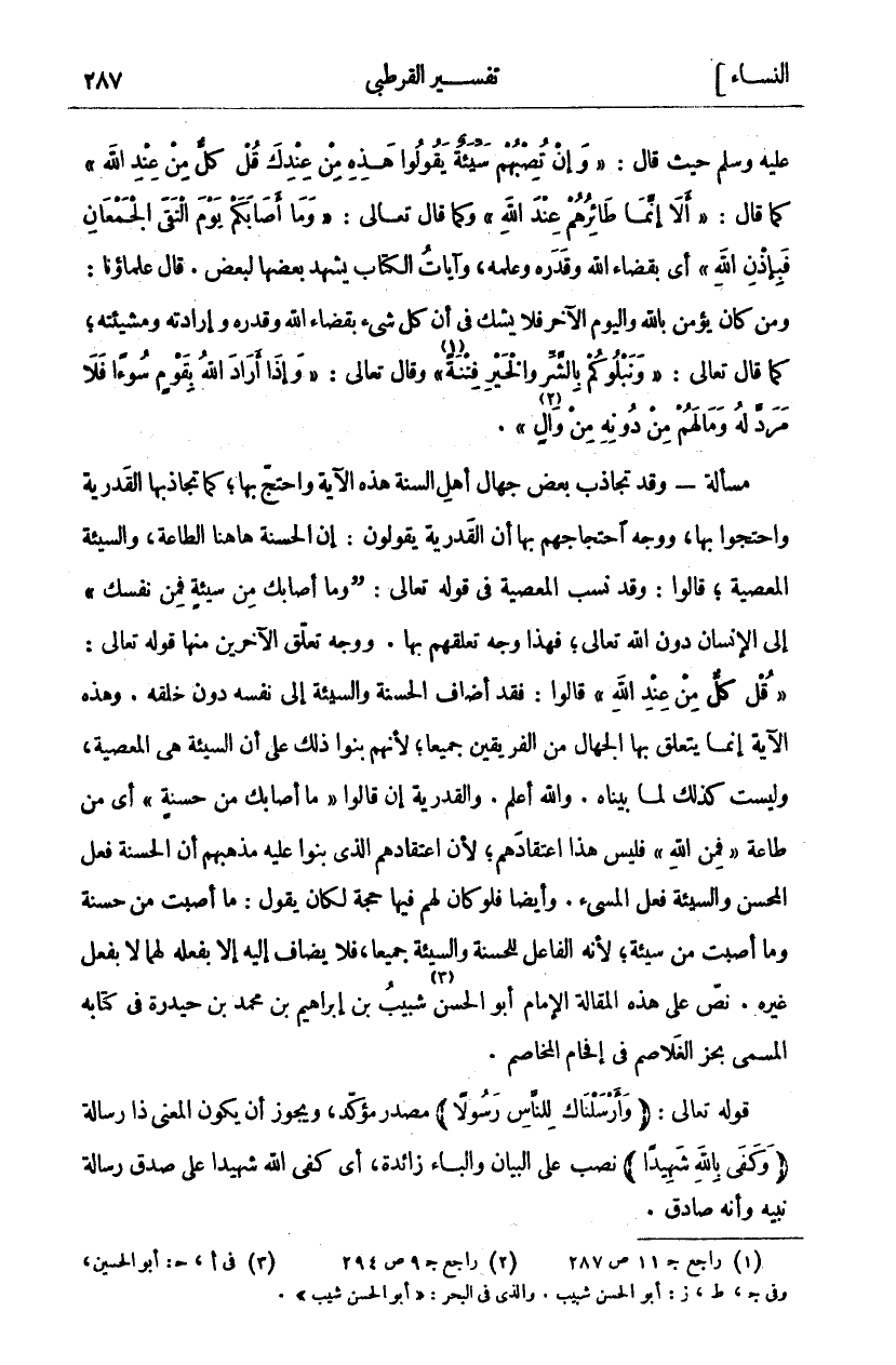 عَلَيْهِ وَسَلَّمَ حَيْثُ قَالَ: (وَإِنْ تُصِبْهُمْ سَيِّئَةٌ يَقُولُوا هذِهِ مِنْ عِنْدِكَ قُلْ كُلٌّ مِنْ عِنْدِ اللَّهِ) كَمَا قَالَ: (أَلا إِنَّما طائِرُهُمْ عِنْدَ اللَّهِ) وَكَمَا قَالَ تَعَالَى: (وَما أَصابَكُمْ يَوْمَ الْتَقَى الْجَمْعانِ فَبِإِذْنِ اللَّهِ) أَيْ بِقَضَاءِ اللَّهِ وَقَدَرِهِ وَعِلْمِهِ، وَآيَاتُ الْكِتَابِ يَشْهَدُ بَعْضُهَا لِبَعْضٍ. قَالَ عُلَمَاؤُنَا: وَمَنْ كَانَ يُؤْمِنُ بِاللَّهِ وَالْيَوْمِ الْآخِرِ فَلَا يَشُكُّ فِي أَنَّ كُلَّ شي بِقَضَاءِ اللَّهِ وَقَدَرِهِ وَإِرَادَتِهِ وَمَشِيئَتِهِ، كَمَا قَالَ تَعَالَى: (وَنَبْلُوكُمْ بِالشَّرِّ وَالْخَيْرِ فِتْنَةً «١») وَقَالَ تَعَالَى: (وَإِذا أَرادَ اللَّهُ بِقَوْمٍ سُوْءاً فَلا مَرَدَّ لَهُ وَما لَهُمْ مِنْ دُونِهِ مِنْ والٍ «٢»). مَسْأَلَةٌ- وَقَدْ تَجَاذَبَ بَعْضُ جُهَّالِ أَهْلِ السُّنَّةِ هَذِهِ الْآيَةَ وَاحْتَجَّ بِهَا، كَمَا تَجَاذَبَهَا الْقَدَرِيَّةُ وَاحْتَجُّوا بِهَا، وَوَجْهُ احْتِجَاجِهِمْ بِهَا أَنَّ الْقَدَرِيَّةَ يَقُولُونَ: إِنَّ الْحَسَنَةَ هَا هُنَا الطَّاعَةُ، وَالسَّيِّئَةَ الْمَعْصِيَةُ، قَالُوا: وَقَدْ نَسَبَ الْمَعْصِيَةَ فِي قَوْلِهِ تَعَالَى: (وَما أَصابَكَ مِنْ سَيِّئَةٍ فَمِنْ نَفْسِكَ) إِلَى الْإِنْسَانِ دُونَ اللَّهِ تَعَالَى، فَهَذَا وَجْهُ تَعَلُّقِهِمْ بِهَا. وَوَجْهُ تَعَلُّقِ الْآخَرِينَ مِنْهَا قَوْلُهُ تَعَالَى: (قُلْ كُلٌّ مِنْ عِنْدِ اللَّهِ) قَالُوا: فَقَدْ أَضَافَ الْحَسَنَةَ وَالسَّيِّئَةَ إِلَى نَفْسِهِ دُونَ خَلْقِهِ. وَهَذِهِ الْآيَةُ إِنَّمَا يَتَعَلَّقُ بِهَا الْجُهَّالُ مِنَ الْفَرِيقَيْنِ جَمِيعًا، لِأَنَّهُمْ بَنَوْا ذَلِكَ عَلَى أَنَّ السَّيِّئَةَ هِيَ الْمَعْصِيَةُ، وَلَيْسَتْ كَذَلِكَ لِمَا بَيَّنَّاهُ. وَاللَّهُ أَعْلَمُ. وَالْقَدَرِيَّةُ إِنْ قَالُوا (مَا أَصابَكَ مِنْ حَسَنَةٍ) أَيْ مِنْ طَاعَةٍ (فَمِنَ اللَّهِ) فَلَيْسَ هَذَا اعْتِقَادَهُمْ، لِأَنَّ اعْتِقَادَهُمُ الَّذِي بَنَوْا عَلَيْهِ مَذْهَبَهُمْ أَنَّ الْحَسَنَةَ فِعْلُ الْمُحْسِنِ وَالسَّيِّئَةَ فِعْلُ الْمُسِيءِ. وَأَيْضًا فَلَوْ كَانَ لَهُمْ فِيهَا حُجَّةٌ لَكَانَ يَقُولُ: مَا أَصَبْتَ مِنْ حَسَنَةٍ وَمَا أَصَبْتَ مِنْ سَيِّئَةٍ، لِأَنَّهُ الْفَاعِلُ لِلْحَسَنَةِ وَالسَّيِّئَةِ جَمِيعًا، فَلَا يُضَافُ إِلَيْهِ إِلَّا بِفِعْلِهِ لَهُمَا لَا بِفِعْلِ غَيْرِهِ. نَصَّ عَلَى هَذِهِ الْمَقَالَةِ الْإِمَامُ أَبُو الْحَسَنِ «٣» شَبِيبُ بْنُ إِبْرَاهِيمَ بْنِ مُحَمَّدِ بْنِ حَيْدَرَةَ فِي كِتَابِهِ الْمُسَمَّى بِحَزِّ الْغَلَاصِمِ فِي إِفْحَامِ الْمُخَاصِمِ. قَوْلُهُ تَعَالَى: (وَأَرْسَلْناكَ لِلنَّاسِ رَسُولًا) مَصْدَرٌ مُؤَكَّدٌ، وَيَجُوزُ أَنْ يَكُونَ الْمَعْنَى ذَا رِسَالَةٍ (وَكَفى بِاللَّهِ شَهِيداً) نَصْبٌ عَلَى الْبَيَانِ وَالْبَاءُ زَائِدَةٌ، أَيْ كَفَى اللَّهُ شَهِيدًا عَلَى صِدْقِ رِسَالَةِ نَبِيِّهِ وأنه صادق.