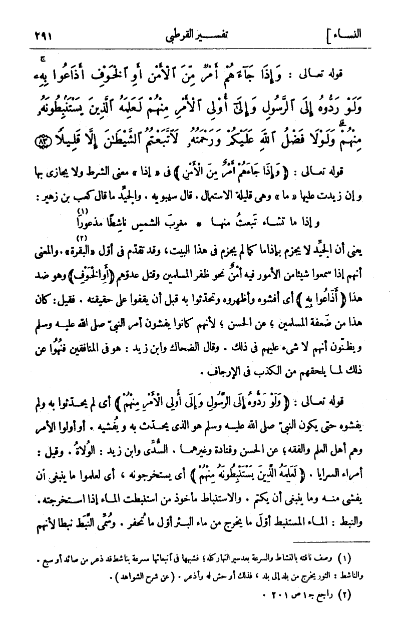 يَعْنِي أَنَّ الْجَيِّدَ لَا يُجْزَمُ بِإِذَا مَا كَمَا لَمْ يُجْزَمْ فِي هَذَا الْبَيْتِ، وَقَدْ تَقَدَّمَ فِي أَوَّلِ (الْبَقَرَةِ «٢»). وَالْمَعْنَى أَنَّهُمْ إِذَا سَمِعُوا شَيْئًا مِنَ الْأُمُورِ فِيهِ أَمْنٌ نَحْوَ ظَفَرِ الْمُسْلِمِينَ وَقَتْلِ عَدُوِّهِمْ (أَوِ الْخَوْفِ) وَهُوَ ضِدُّ هَذَا (أَذاعُوا بِهِ) أَيْ أَفْشَوْهُ وَأَظْهَرُوهُ وَتَحَدَّثُوا بِهِ قَبْلَ أَنْ يَقِفُوا عَلَى حَقِيقَتِهِ. فَقِيلَ: كَانَ هَذَا مِنْ ضَعَفَةِ الْمُسْلِمِينَ، عَنِ الْحَسَنِ، لِأَنَّهُمْ كَانُوا يُفْشُونَ أَمْرَ النَّبِيِّ صَلَّى اللَّهُ عَلَيْهِ وَسَلَّمَ ويظنون أنهم لا شي عَلَيْهِمْ فِي ذَلِكَ. وَقَالَ الضَّحَّاكُ وَابْنُ زَيْدٍ: هو فِي الْمُنَافِقِينَ فَنُهُوا عَنْ ذَلِكَ لِمَا يَلْحَقُهُمْ مِنَ الْكَذِبِ فِي الْإِرْجَافِ. قَوْلُهُ تَعَالَى: (وَلَوْ رَدُّوهُ إِلَى الرَّسُولِ وَإِلى أُولِي الْأَمْرِ مِنْهُمْ) أَيْ لَمْ يُحَدِّثُوا بِهِ وَلَمْ يُفْشُوهُ حَتَّى يَكُونَ النَّبِيُّ صَلَّى اللَّهُ عَلَيْهِ وَسَلَّمَ هُوَ الَّذِي يُحَدِّثُ بِهِ وَيُفْشِيهِ. أَوْ أُولُوا الْأَمْرِ وَهُمْ أَهْلُ الْعِلْمِ وَالْفِقْهِ، عَنِ الْحَسَنِ وَقَتَادَةَ وَغَيْرِهِمَا. السُّدِّيُّ وَابْنُ زَيْدٍ: الْوُلَاةُ. وَقِيلَ: أُمَرَاءُ السَّرَايَا. (لَعَلِمَهُ الَّذِينَ يَسْتَنْبِطُونَهُ مِنْهُمْ) أَيْ يَسْتَخْرِجُونَهُ، أَيْ لَعَلِمُوا مَا يَنْبَغِي أَنْ يُفْشَى مِنْهُ وَمَا يَنْبَغِي أَنْ يُكْتَمَ. وَالِاسْتِنْبَاطُ مَأْخُوذٌ مِنَ اسْتَنْبَطْتُ الْمَاءَ إِذَا اسْتَخْرَجْتُهُ. وَالنَّبَطُ: الْمَاءُ الْمُسْتَنْبَطُ أَوَّلَ مَا يَخْرُجُ مِنْ مَاءِ الْبِئْرِ أَوَّلَ ما تحفر. وسمي النبط نبطا لأنهم