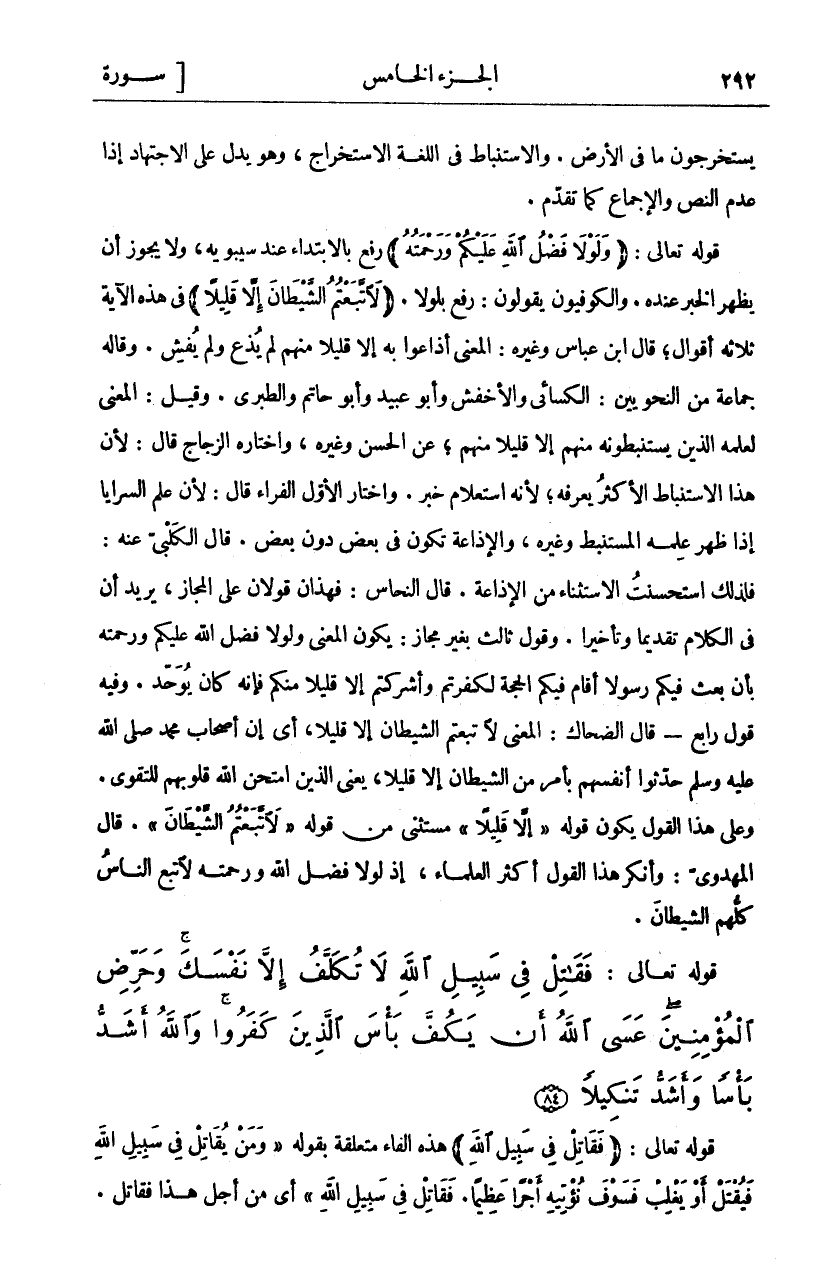 يَسْتَخْرِجُونَ مَا فِي الْأَرْضِ. وَالِاسْتِنْبَاطُ فِي اللُّغَةِ الِاسْتِخْرَاجُ، وَهُوَ يَدُلُّ عَلَى الِاجْتِهَادِ إِذَا عُدِمَ النص والإجماع كما تقدم. قوله تعالى: (وَلَوْلا فَضْلُ اللَّهِ عَلَيْكُمْ وَرَحْمَتُهُ) رُفِعَ بِالِابْتِدَاءِ عِنْدَ سِيبَوَيْهِ، وَلَا يَجُوزُ أَنْ يُظْهَرَ الْخَبَرُ عِنْدَهُ. وَالْكُوفِيُّونَ يَقُولُونَ: رُفِعَ بِلَوْلَا. (لَاتَّبَعْتُمُ الشَّيْطانَ إِلَّا قَلِيلًا) فِي هَذِهِ الْآيَةِ ثَلَاثَةُ أَقْوَالٍ، قَالَ ابْنُ عَبَّاسٍ وَغَيْرُهُ: الْمَعْنَى أَذَاعُوا بِهِ إِلَّا قَلِيلًا مِنْهُمْ لَمْ يَذِعْ وَلَمْ يُفْشِ. وَقَالَهُ جَمَاعَةٌ مِنَ النَّحْوِيِّينَ: الْكِسَائِيُّ وَالْأَخْفَشُ وَأَبُو عُبَيْدٍ وَأَبُو حَاتِمٍ وَالطَّبَرِيُّ. وَقِيلَ: الْمَعْنَى لَعَلِمَهُ الَّذِينَ يَسْتَنْبِطُونَهُ مِنْهُمْ إِلَّا قَلِيلًا مِنْهُمْ، عَنِ الْحَسَنِ وَغَيْرِهِ، وَاخْتَارَهُ الزَّجَّاجُ قَالَ: لِأَنَّ هَذَا الِاسْتِنْبَاطَ الْأَكْثَرُ يَعْرِفُهُ، لِأَنَّهُ اسْتِعْلَامُ خَبَرٍ. وَاخْتَارَ الْأَوَّلَ الْفَرَّاءُ قَالَ: لِأَنَّ عِلْمَ السَّرَايَا إِذَا ظَهَرَ عَلِمَهُ الْمُسْتَنْبِطُ وَغَيْرُهُ، وَالْإِذَاعَةُ تَكُونُ فِي بَعْضٍ دُونَ بَعْضٍ. قَالَ الْكَلْبِيُّ عَنْهُ: فَلِذَلِكَ اسْتَحْسَنْتُ الِاسْتِثْنَاءُ مِنَ الْإِذَاعَةِ. قَالَ النَّحَّاسُ: فَهَذَانَ قَوْلَانِ عَلَى الْمَجَازِ، يُرِيدُ أَنَّ فِي الْكَلَامِ تَقْدِيمًا وَتَأْخِيرًا. وَقَوْلٌ ثَالِثٌ بِغَيْرِ مَجَازٍ: يَكُونُ الْمَعْنَى وَلَوْلَا فَضْلُ اللَّهِ عَلَيْكُمْ وَرَحْمَتُهُ بِأَنْ بَعَثَ فِيكُمْ رَسُولًا أَقَامَ فِيكُمُ الْحُجَّةَ لَكَفَرْتُمْ وَأَشْرَكْتُمْ إِلَّا قَلِيلًا مِنْكُمْ فَإِنَّهُ كَانَ يُوَحِّدُ. وَفِيهِ قَوْلٌ رَابِعٌ- قَالَ الضَّحَّاكُ: الْمَعْنَى لَاتَّبَعْتُمُ الشَّيْطَانَ إِلَّا قَلِيلًا، أَيْ إِنَّ أَصْحَابَ مُحَمَّدٍ صَلَّى اللَّهُ عَلَيْهِ وَسَلَّمَ حَدَّثُوا أَنْفُسَهُمْ بِأَمْرٍ مِنَ الشَّيْطَانِ إِلَّا قَلِيلًا، يَعْنِي الَّذِينَ امْتَحَنَ اللَّهُ قُلُوبَهُمْ لِلتَّقْوَى. وَعَلَى هَذَا الْقَوْلِ يَكُونُ قَوْلُهُ (إِلَّا قَلِيلًا) مُسْتَثْنًى مِنْ قَوْلِهِ (لَاتَّبَعْتُمُ الشَّيْطانَ). قَالَ الْمَهْدَوِيُّ: وَأَنْكَرَ هَذَا الْقَوْلَ أَكْثَرُ الْعُلَمَاءِ، إِذْ لَوْلَا فَضْلُ اللَّهِ وَرَحْمَتُهُ لَاتَّبَعَ النَّاسُ كلهم الشيطان.