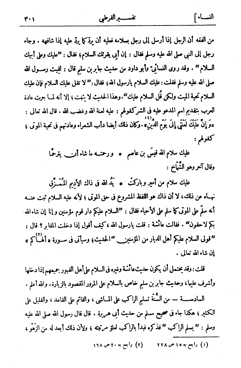 مِنَ الْفِقْهِ أَنَّ الرَّجُلَ إِذَا أَرْسَلَ إِلَى رَجُلٍ بِسَلَامِهِ فَعَلَيْهِ أَنْ يَرُدَّ كَمَا يَرُدُّ عَلَيْهِ إِذَا شَافَهَهُ. وَجَاءَ رَجُلٌ إِلَى النَّبِيِّ صَلَّى اللَّهُ عَلَيْهِ وَسَلَّمَ فَقَالَ: إِنَّ أَبِي يُقْرِئُكَ السَّلَامَ، فَقَالَ: (عَلَيْكَ وَعَلَى أَبِيكَ السَّلَامُ). وَقَدْ رَوَى النَّسَائِيُّ وَأَبُو دَاوُدَ مِنْ حَدِيثِ جَابِرِ بْنِ سُلَيْمٍ قَالَ: لَقِيتُ رَسُولَ اللَّهِ صَلَّى اللَّهُ عَلَيْهِ وَسَلَّمَ فَقُلْتُ: عَلَيْكَ السَّلَامُ يَا رَسُولَ اللَّهِ، فَقَالَ: (لَا تَقُلْ عَلَيْكَ السَّلَامُ فَإِنَّ عَلَيْكَ السَّلَامُ تَحِيَّةُ الْمَيِّتِ وَلَكِنْ قُلِ السَّلَامُ عَلَيْكَ). وَهَذَا الْحَدِيثُ لَا يَثْبُتُ، إِلَّا أَنَّهُ لَمَّا جَرَتْ عَادَةُ الْعَرَبِ بِتَقْدِيمِ اسْمِ الْمَدْعُوِّ عَلَيْهِ فِي الشَّرِّ كَقَوْلِهِمْ: عَلَيْهِ لَعْنَةُ اللَّهِ وَغَضَبُ اللَّهِ. قَالَ اللَّهُ تَعَالَى: (وَإِنَّ عَلَيْكَ لَعْنَتِي إِلَى يَوْمِ الدِّينِ «١»). وَكَانَ ذَلِكَ أَيْضًا دَأْبُ الشُّعَرَاءِ وَعَادَتُهُمْ فِي تَحِيَّةِ الْمَوْتَى، كَقَوْلِهِمْ: