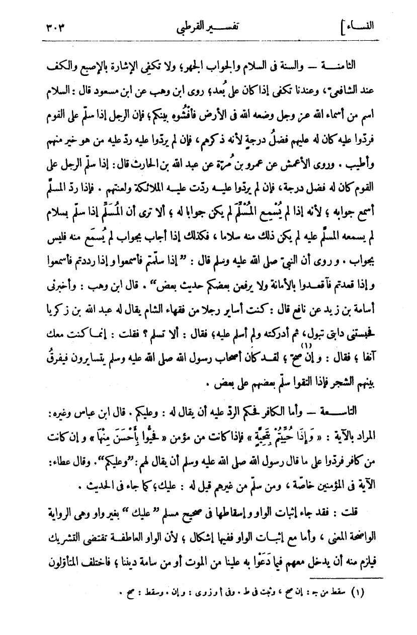الثَّامِنَةُ وَالسُّنَّةُ فِي السَّلَامِ وَالْجَوَابِ الْجَهْرُ، وَلَا تَكْفِي الْإِشَارَةُ بِالْإِصْبَعِ وَالْكَفِّ عِنْدَ الشَّافِعِيِّ، وَعِنْدَنَا تَكْفِي إِذَا كَانَ عَلَى بُعْدٍ، رَوَى ابْنُ وَهْبٍ عَنِ ابْنِ مَسْعُودٍ قَالَ: السَّلَامُ اسْمٌ مِنْ أَسْمَاءِ اللَّهِ عَزَّ وَجَلَّ وَضَعَهُ اللَّهُ فِي الْأَرْضِ فَأَفْشُوهُ بَيْنَكُمْ، فَإِنَّ الرَّجُلَ إِذَا سَلَّمَ عَلَى الْقَوْمِ فَرَدُّوا عَلَيْهِ كَانَ لَهُ عَلَيْهِمْ فَضْلُ دَرَجَةٍ لِأَنَّهُ ذَكَّرَهُمْ، فَإِنْ لَمْ يَرُدُّوا عَلَيْهِ رَدَّ عَلَيْهِ مَنْ هُوَ خَيْرٌ مِنْهُمْ وَأَطْيَبُ. وَرَوَى الْأَعْمَشُ عَنْ عَمْرِو بْنِ مُرَّةَ عَنْ عَبْدِ اللَّهِ بْنِ الْحَارِثِ قَالَ: إِذَا سَلَّمَ الرَّجُلُ عَلَى الْقَوْمِ كَانَ لَهُ فَضْلُ دَرَجَةٍ، فَإِنْ لَمْ يَرُدُّوا عَلَيْهِ رَدَّتْ عَلَيْهِ الْمَلَائِكَةُ وَلَعَنَتْهُمْ. فَإِذَا رَدَّ الْمُسَلَّمُ عَلَيْهِ أَسْمَعَ جَوَابَهُ، لِأَنَّهُ إِذَا لَمْ يُسْمِعِ الْمُسَلِّمَ لَمْ يَكُنْ جَوَابًا لَهُ، أَلَا تَرَى أَنَّ الْمُسَلِّمَ إِذَا سَلَّمَ بِسَلَامٍ لَمْ يَسْمَعْهُ الْمُسَلَّمُ عَلَيْهِ لَمْ يَكُنْ ذَلِكَ مِنْهُ سَلَامًا، فَكَذَلِكَ إِذَا أَجَابَ بِجَوَابٍ لَمْ يُسْمَعْ مِنْهُ فَلَيْسَ بِجَوَابٍ. وَرُوِيَ أَنَّ النَّبِيَّ صَلَّى اللَّهُ عَلَيْهِ وَسَلَّمَ قَالَ: (إِذَا سَلَّمْتُمْ فَأَسْمِعُوا وَإِذَا رَدَدْتُمْ فَأَسْمِعُوا وَإِذَا قَعَدْتُمْ فَاقْعُدُوا بِالْأَمَانَةِ وَلَا يَرْفَعَنَّ بَعْضُكُمْ حَدِيثَ بَعْضٍ). قَالَ ابْنُ وَهْبٍ: وَأَخْبَرَنِي أُسَامَةُ بْنُ زَيْدٍ عَنْ نَافِعٍ قَالَ: كُنْتُ أُسَايِرُ رَجُلًا مِنْ فُقَهَاءِ الشَّامِ يُقَالُ لَهُ عَبْدُ اللَّهِ بْنُ زَكَرِيَّا فَحَبَسَتْنِي دَابَّتِي تَبُولُ، ثُمَّ أَدْرَكْتُهُ وَلَمْ أُسَلِّمْ عَلَيْهِ، فَقَالَ: أَلَا تُسَلِّمُ؟ فَقُلْتُ: إِنَّمَا كُنْتُ مَعَكَ آنِفًا، فَقَالَ: وَإِنْ «١» صَحَّ، لَقَدْ كَانَ أَصْحَابُ رَسُولِ اللَّهِ صَلَّى اللَّهُ عَلَيْهِ وَسَلَّمَ يَتَسَايَرُونَ فَيُفَرِّقُ بَيْنَهُمُ الشَّجَرُ فَإِذَا الْتَقَوْا سَلَّمَ بَعْضُهُمْ عَلَى بَعْضٍ. التَّاسِعَةُ- وَأَمَّا الْكَافِرُ فَحُكْمُ الرَّدِّ عَلَيْهِ أَنْ يُقَالَ لَهُ: وَعَلَيْكُمْ. قَالَ ابْنُ عَبَّاسٍ وَغَيْرُهُ: الْمُرَادُ بِالْآيَةِ: (وَإِذا حُيِّيتُمْ بِتَحِيَّةٍ) فَإِذَا كَانَتْ مِنْ مُؤْمِنٍ (فَحَيُّوا بِأَحْسَنَ مِنْها) وَإِنْ كَانَتْ مِنْ كَافِرٍ فَرُدُّوا عَلَى مَا قَالَ رَسُولُ اللَّهِ صَلَّى اللَّهُ عَلَيْهِ وَسَلَّمَ أَنْ يُقَالَ لَهُمْ: (وَعَلَيْكُمْ). وَقَالَ عَطَاءٌ: الْآيَةُ فِي الْمُؤْمِنِينَ خَاصَّةً، وَمَنْ سَلَّمَ مِنْ غَيْرِهِمْ قِيلَ لَهُ: عَلَيْكَ، كَمَا جَاءَ فِي الْحَدِيثِ. قُلْتُ: فَقَدْ جَاءَ إِثْبَاتُ الْوَاوِ وَإِسْقَاطُهَا فِي صَحِيحِ مُسْلِمٍ (عَلَيْكَ) بِغَيْرِ وَاوٍ وَهِيَ الرِّوَايَةُ الْوَاضِحَةُ الْمَعْنَى، وَأَمَّا مَعَ إِثْبَاتِ الْوَاوِ فَفِيهَا إِشْكَالٌ، لِأَنَّ الْوَاوَ الْعَاطِفَةَ تَقْتَضِي التَّشْرِيكَ فَيَلْزَمُ مِنْهُ أَنْ يَدْخُلَ مَعَهُمْ فِيمَا دَعَوْا بِهِ عَلَيْنَا مِنَ الْمَوْتِ أَوْ مِنْ سَآمَةِ دِينِنَا، فَاخْتَلَفَ الْمُتَأَوِّلُونَ