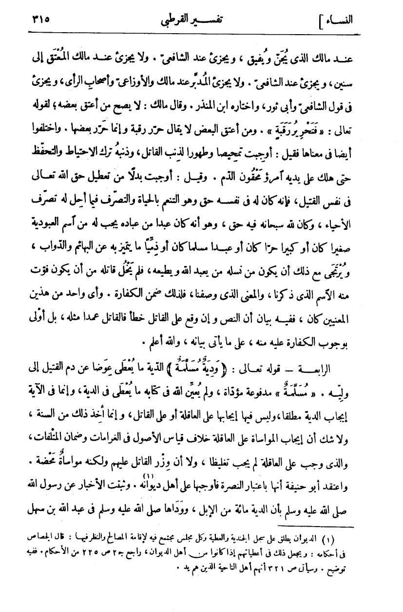 عِنْدَ مَالِكٍ الَّذِي يُجَنُّ وَيُفِيقُ، وَيُجْزِئُ عِنْدَ الشَّافِعِيِّ. وَلَا يُجْزِئُ عِنْدَ مَالِكٍ الْمُعْتَقُ إِلَى سِنِينَ، وَيُجْزِئُ عِنْدَ الشَّافِعِيِّ. وَلَا يُجْزِئُ الْمُدَبَّرُ عِنْدَ مَالِكٍ وَالْأَوْزَاعِيِّ وَأَصْحَابِ الرَّأْيِ، وَيُجْزِئُ فِي قَوْلِ الشَّافِعِيِّ وَأَبِي ثَوْرٍ، وَاخْتَارَهُ ابْنُ الْمُنْذِرِ. وَقَالَ مَالِكٌ: لَا يَصِحُّ مَنْ أُعْتِقَ بَعْضُهُ، لِقَوْلِهِ تَعَالَى: (فَتَحْرِيرُ رَقَبَةٍ). وَمَنْ أَعْتَقَ الْبَعْضَ لَا يُقَالُ حَرَّرَ رَقَبَةً وَإِنَّمَا حَرَّرَ بَعْضَهَا. وَاخْتَلَفُوا أَيْضًا فِي مَعْنَاهَا فَقِيلَ: أُوجِبَتْ تَمْحِيصًا وَطَهُورًا لِذَنْبِ الْقَاتِلِ، وَذَنْبُهُ تَرْكُ الِاحْتِيَاطِ وَالتَّحَفُّظِ حَتَّى هَلَكَ عَلَى يَدَيْهِ امْرُؤٌ مَحْقُونُ الدَّمِ. وَقِيلَ: أُوجِبَتْ بَدَلًا مِنْ تَعْطِيلِ حَقِّ اللَّهِ تَعَالَى فِي نَفْسِ الْقَتِيلِ، فَإِنَّهُ كَانَ لَهُ فِي نَفْسِهِ حَقٌّ وَهُوَ التَّنَعُّمُ بِالْحَيَاةِ وَالتَّصَرُّفُ فِيمَا أَحَلَّ لَهُ تَصَرُّفَ الْأَحْيَاءِ. وَكَانَ لِلَّهِ سُبْحَانَهُ فِيهِ حَقٌّ، وَهُوَ أَنَّهُ كَانَ عَبْدًا مِنْ عِبَادِهِ يَجِبُ لَهُ مِنْ أَمْرِ الْعُبُودِيَّةِ صَغِيرًا كَانَ أَوْ كَبِيرًا حُرًّا كَانَ أَوْ عَبْدًا مُسْلِمًا كَانَ أَوْ ذِمِّيًّا مَا يَتَمَيَّزُ بِهِ عَنِ الْبَهَائِمِ وَالدَّوَابِّ، وَيُرْتَجَى مَعَ ذَلِكَ أَنْ يَكُونَ مِنْ نَسْلِهِ مَنْ يَعْبُدُ اللَّهَ وَيُطِيعُهُ، فَلَمْ يَخْلُ قَاتِلُهُ مِنْ أَنْ يَكُونَ فَوَّتَ مِنْهُ الِاسْمَ الَّذِي ذَكَرْنَا، وَالْمَعْنَى الَّذِي وَصَفْنَا، فَلِذَلِكَ ضَمِنَ الْكَفَّارَةَ. وَأَيُّ وَاحِدٍ مِنْ هَذَيْنَ الْمَعْنَيَيْنِ كَانَ، فَفِيهِ بَيَانٌ أَنَّ النَّصَّ وَإِنْ وَقَعَ عَلَى الْقَاتِلِ خَطَأً فَالْقَاتِلُ عَمْدًا مِثْلَهُ، بَلْ أَوْلَى بِوُجُوبِ الْكَفَّارَةِ عَلَيْهِ مِنْهُ، عَلَى مَا يَأْتِي بَيَانُهُ، وَاللَّهُ أَعْلَمُ. الرَّابِعَةُ- قَوْلُهُ تَعَالَى: (وَدِيَةٌ مُسَلَّمَةٌ) الدِّيَةُ مَا يُعْطَى عِوَضًا عَنْ دَمِ الْقَتِيلِ إِلَى وَلِيِّهِ. (مُسَلَّمَةٌ) مَدْفُوعَةٌ مُؤَدَّاةٌ، وَلَمْ يُعَيِّنِ اللَّهُ فِي كِتَابِهِ مَا يُعْطَى فِي الدِّيَةِ، وَإِنَّمَا فِي الْآيَةِ إِيجَابُ الدِّيَةِ مُطْلَقًا، وَلَيْسَ فِيهَا إِيجَابُهَا عَلَى الْعَاقِلَةِ أَوْ عَلَى الْقَاتِلِ، وَإِنَّمَا أُخِذَ ذَلِكَ مِنَ السُّنَّةِ، وَلَا شَكَّ أَنَّ إِيجَابَ الْمُوَاسَاةِ عَلَى الْعَاقِلَةِ خِلَافُ قِيَاسِ الْأُصُولِ فِي الْغَرَامَاتِ وَضَمَانِ الْمُتْلَفَاتِ، وَالَّذِي وَجَبَ عَلَى الْعَاقِلَةِ لَمْ يَجِبْ تَغْلِيظًا، وَلَا أَنَّ وِزْرَ الْقَاتِلِ عَلَيْهِمْ وَلَكِنَّهُ مُوَاسَاةٌ مَحْضَةٌ. وَاعْتَقَدَ أَبُو حَنِيفَةَ أَنَّهَا بِاعْتِبَارِ النُّصْرَةِ فَأَوْجَبَهَا عَلَى أَهْلِ دِيوَانِهِ «١». وَثَبَتَتِ الْأَخْبَارُ عَنْ رَسُولِ اللَّهِ صَلَّى اللَّهُ عَلَيْهِ وَسَلَّمَ بِأَنَّ الدِّيَةَ مِائَةٌ مِنَ الْإِبِلِ، وَوَدَاهَا صَلَّى اللَّهُ عَلَيْهِ وَسَلَّمَ فِي عَبْدِ اللَّهِ بن سهل