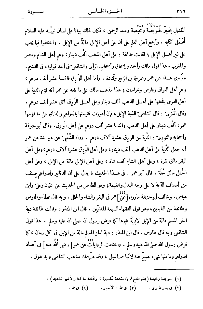الْمَقْتُولِ بِخَيْبَرَ لِحُوَيِّصَةَ «١» وَمُحَيِّصَةَ وَعَبْدِ الرَّحْمَنِ، فَكَانَ ذَلِكَ بَيَانًا عَلَى لِسَانِ نَبِيِّهِ عَلَيْهِ السَّلَامُ لمجمل كتابه. وأجمع أهل العلم عل أَنَّ عَلَى أَهْلِ الْإِبِلِ مِائَةً مِنَ الْإِبِلِ. وَاخْتَلَفُوا فِيمَا يَجِبُ عَلَى غَيْرِ أَهْلِ الْإِبِلِ، فَقَالَتْ طَائِفَةٌ: عَلَى أَهْلِ الذَّهَبِ أَلْفُ دِينَارٍ، وَهُمْ أَهْلُ الشَّامِ وَمِصْرَ وَالْمَغْرِبِ، هَذَا قَوْلُ مَالِكٍ وَأَحْمَدَ وَإِسْحَاقَ وَأَصْحَابِ الرَّأْيِ وَالشَّافِعِيِّ فِي أَحَدِ قَوْلَيْهِ، فِي الْقَدِيمِ. وَرُوِيَ هَذَا عَنْ عُمَرَ وَعُرْوَةَ بْنِ الزُّبَيْرِ وَقَتَادَةَ. وَأَمَّا أَهْلُ الْوَرِقِ فَاثْنَا عَشَرَ أَلْفَ دِرْهَمٍ، وَهُمْ أَهْلُ الْعِرَاقِ وَفَارِسٍ وَخُرَاسَانَ، هَذَا مَذْهَبُ مَالِكٍ عَلَى مَا بَلَغَهُ عَنْ عُمَرَ أَنَّهُ قَوَّمَ الدِّيَةَ عَلَى أَهْلِ الْقُرَى فَجَعَلَهَا عَلَى أَهْلِ الذَّهَبِ أَلْفَ دِينَارٍ وَعَلَى أَهْلِ الْوَرِقِ اثْنَيْ عَشَرَ أَلْفَ دِرْهَمٍ. وَقَالَ الْمُزَنِيُّ: قَالَ الشَّافِعِيُّ الدِّيَةُ الْإِبِلُ، فَإِنْ أَعْوَزَتْ فَقِيمَتُهَا بِالدَّرَاهِمِ وَالدَّنَانِيرِ عَلَى مَا قَوَّمَهَا عُمَرُ، أَلْفَ دِينَارٍ عَلَى أَهْلِ الذَّهَبِ وَاثْنَا عَشَرَ أَلْفَ دِرْهَمٍ عَلَى أَهْلِ الْوَرِقِ. وَقَالَ أَبُو حَنِيفَةَ وَأَصْحَابُهُ وَالثَّوْرِيُّ: الدِّيَةُ مِنَ الْوَرِقِ عَشَرَةُ آلَافِ دِرْهَمٍ. رَوَاهُ الشَّعْبِيُّ عَنْ عَبِيدَةَ عَنْ عُمَرَ أَنَّهُ جَعَلَ الدِّيَةَ عَلَى أَهْلِ الذَّهَبِ أَلْفَ دِينَارٍ، وَعَلَى أَهْلِ الْوَرِقِ عَشْرَةَ آلَافِ دِرْهَمٍ، وَعَلَى أَهْلِ الْبَقَرِ مِائَتَيْ بَقَرَةٍ، وَعَلَى أَهْلِ الشَّاءِ أَلْفُ شَاةٍ، وَعَلَى أَهْلِ الْإِبِلِ مِائَةٌ مِنَ الْإِبِلِ، وَعَلَى أَهْلِ الْحُلَلِ مِائَتَيْ حُلَّةٍ. قَالَ أَبُو عُمَرَ: فِي هَذَا الْحَدِيثِ مَا يَدُلُّ عَلَى أَنَّ الدَّنَانِيرَ وَالدَّرَاهِمَ صِنْفٌ مِنْ أَصْنَافِ الدِّيَةِ لَا عَلَى وَجْهِ الْبَدَلِ وَالْقِيمَةِ، وَهُوَ الظَّاهِرُ مِنَ الْحَدِيثِ عَنْ عُثْمَانَ وَعَلِيٍّ وَابْنِ عَبَّاسٍ. وَخَالَفَ أَبُو حَنِيفَةَ مَا رَوَاهُ [عَنْ «٢»] عُمَرَ فِي الْبَقَرِ وَالشَّاءِ وَالْحُلَلِ. وَبِهِ قَالَ عَطَاءٌ وَطَاوُسٌ وَطَائِفَةٌ مِنَ التَّابِعِينَ، وَهُوَ قَوْلُ الْفُقَهَاءِ السَّبْعَةِ الْمَدَنِيِّينَ. قَالَ ابْنُ الْمُنْذِرِ: وَقَالَتْ طَائِفَةٌ دِيَةُ الْحُرِّ الْمُسْلِمِ مِائَةٌ مِنَ الْإِبِلِ لَا دِيَةَ غَيْرُهَا كَمَا فَرَضَّ رَسُولُ اللَّهِ صَلَّى اللَّهُ عَلَيْهِ وَسَلَّمَ. هَذَا قَوْلُ الشَّافِعِيِّ وَبِهِ قَالَ طَاوُسٌ. قَالَ ابْنُ الْمُنْذِرِ: دِيَةُ الْحُرِّ الْمُسْلِمِ مِائَةٌ مِنَ الْإِبِلِ فِي كُلِّ زَمَانٍ، كَمَا فَرَضَّ رَسُولُ اللَّهِ صَلَّى اللَّهُ عَلَيْهِ وَسَلَّمَ. وَاخْتَلَفَتِ الرِّوَايَاتُ «٣» عَنْ عُمَرَ [رَضِيَ اللَّهُ «٤» عَنْهُ] في أعداد الدراهم وما منها شي يَصِحُّ عَنْهُ لِأَنَّهَا مَرَاسِيلُ، وَقَدْ عَرَّفْتُكَ مَذْهَبَ الشافعي وبه ونقول.