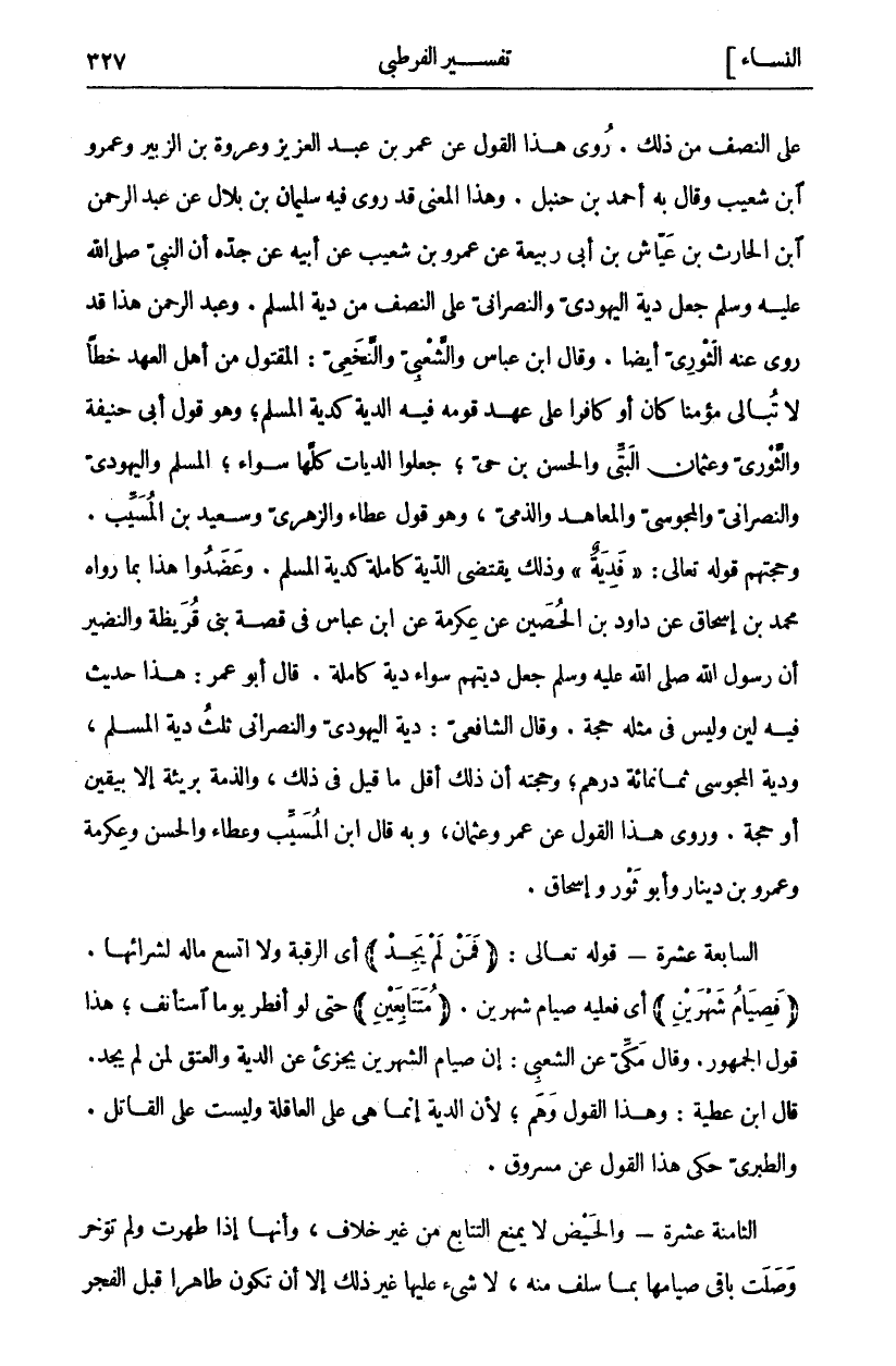 عَلَى النِّصْفِ مِنْ ذَلِكَ. رُوِيَ هَذَا الْقَوْلُ عَنْ عُمَرَ بْنِ عَبْدِ الْعَزِيزِ وَعُرْوَةَ بْنِ الزبير وعمرو ابن شُعَيْبٍ وَقَالَ بِهِ أَحْمَدُ بْنُ حَنْبَلٍ. وَهَذَا الْمَعْنَى قَدْ رَوَى فِيهِ سُلَيْمَانُ بْنُ بِلَالٍ، عن عبد الرحمن ابن الْحَارِثِ بْنِ عَيَّاشِ بْنِ أَبِي رَبِيعَةَ عَنْ عَمْرِو بْنِ شُعَيْبٍ عَنْ أَبِيهِ عَنْ جَدِّهِ أَنَّ النَّبِيَّ صَلَّى اللَّهُ عَلَيْهِ وَسَلَّمَ جَعَلَ دِيَةَ الْيَهُودِيِّ وَالنَّصْرَانِيِّ عَلَى النِّصْفِ مِنْ دِيَةِ الْمُسْلِمِ. وَعَبْدُ الرَّحْمَنِ هَذَا قَدْ رَوَى عَنْهُ الثَّوْرِيُّ أَيْضًا. وَقَالَ ابْنُ عَبَّاسٍ وَالشَّعْبِيُّ وَالنَّخَعِيُّ: الْمَقْتُولُ مِنْ أَهْلِ الْعَهْدِ خَطَأً لَا تُبَالِي مُؤْمِنًا كَانَ أَوْ كَافِرًا عَلَى عَهْدِ قَوْمِهِ فِيهِ الدِّيَةُ كَدِيَةِ الْمُسْلِمِ، وَهُوَ قَوْلُ أَبِي حنيفة والثوى وَعُثْمَانَ الْبَتِّيِّ وَالْحَسَنِ بْنِ حَيٍّ، جَعَلُوا الدِّيَاتِ كُلَّهَا سَوَاءً، الْمُسْلِمُ وَالْيَهُودِيُّ وَالنَّصْرَانِيُّ وَالْمَجُوسِيُّ وَالْمُعَاهَدُ وَالذِّمِّيُّ، وَهُوَ قَوْلُ عَطَاءٍ وَالزُّهْرِيِّ وَسَعِيدِ بْنِ الْمُسَيَّبِ. وَحُجَّتُهُمْ قَوْلُهُ تَعَالَى: (فَدِيَةٌ) وَذَلِكَ يَقْتَضِي الدِّيَةَ كَامِلَةً كَدِيَةِ الْمُسْلِمِ. وَعَضَّدُوا هَذَا بِمَا رَوَاهُ مُحَمَّدُ بْنُ إِسْحَاقَ عَنْ دَاوُدَ بْنِ الْحُصَيْنِ عَنْ عِكْرِمَةَ عَنِ ابْنِ عَبَّاسٍ فِي قِصَّةِ بَنِي قُرَيْظَةَ وَالنَّضِيرِ أَنَّ رَسُولَ اللَّهِ صَلَّى اللَّهُ عَلَيْهِ وَسَلَّمَ جَعَلَ دِيَتَهُمْ سَوَاءً دِيَةً كَامِلَةً. قَالَ أَبُو عُمَرَ: هَذَا حَدِيثٌ فِيهِ لِينٌ وَلَيْسَ فِي مِثْلِهِ حُجَّةٌ. وَقَالَ الشَّافِعِيُّ: دِيَةُ الْيَهُودِيِّ وَالنَّصْرَانِيِّ ثُلُثُ دِيَةِ الْمُسْلِمِ، وَدِيَةُ الْمَجُوسِيِّ ثَمَانُمِائَةِ دِرْهَمٍ، وَحُجَّتُهُ أَنَّ ذَلِكَ أَقَلَّ مَا قِيلَ فِي ذَلِكَ، وَالذِّمَّةُ بَرِيئَةٌ إِلَّا بِيَقِينٍ أَوْ حُجَّةٍ. وَرُوِيَ هَذَا الْقَوْلُ عَنْ عُمَرَ وَعُثْمَانَ، وَبِهِ قَالَ ابْنُ الْمُسَيَّبِ وَعَطَاءٌ وَالْحَسَنُ وَعِكْرِمَةُ وَعَمْرُو بْنُ دِينَارٍ وَأَبُو ثَوْرٍ وَإِسْحَاقُ. السَّابِعَةُ عَشْرَةَ- قَوْلُهُ تَعَالَى: (فَمَنْ لَمْ يَجِدْ) أَيِ الرَّقَبَةَ وَلَا اتَّسَعَ مَالُهُ لِشِرَائِهَا. (فَصِيامُ شَهْرَيْنِ) أَيْ فَعَلَيْهِ صِيَامُ شَهْرَيْنِ. (مُتَتابِعَيْنِ) حَتَّى لَوْ أَفْطَرَ يَوْمًا اسْتَأْنَفَ، هَذَا قَوْلُ الْجُمْهُورِ. وَقَالَ مَكِّيٌّ عَنِ الشَّعْبِيِّ: إِنَّ صِيَامَ الشَّهْرَيْنِ يُجْزِئُ عَنِ الدِّيَةِ وَالْعِتْقِ لِمَنْ لَمْ يَجِدْ. قَالَ ابْنُ عَطِيَّةَ: وَهَذَا الْقَوْلُ وَهْمٌ، لِأَنَّ الدِّيَةَ إِنَّمَا هِيَ عَلَى الْعَاقِلَةِ وَلَيْسَتْ عَلَى الْقَاتِلِ. وَالطَّبَرِيُّ حَكَى هَذَا الْقَوْلَ عَنْ مَسْرُوقٍ. الثَّامِنَةُ عَشْرَةَ- وَالْحَيْضُ لَا يَمْنَعُ التَّتَابُعَ مِنْ غَيْرِ خِلَافٍ، وَإِنَّهَا إِذَا طَهُرَتْ وَلَمْ تُؤَخِّرْ وَصَلَتْ بَاقِيَ صِيَامِهَا بِمَا سَلَفَ منه، لا شي عَلَيْهَا غَيْرَ ذَلِكَ إِلَّا أَنْ تَكُونَ طَاهِرًا قبل الفجر