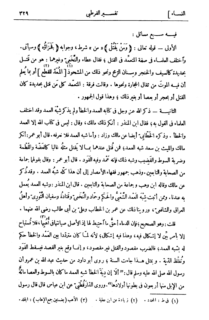 فِيهِ سَبْعُ مَسَائِلَ: الْأُولَى- قَوْلُهُ تَعَالَى: (وَمَنْ يَقْتُلْ) (مَنْ) شَرْطٌ، وَجَوَابُهُ (فَجَزاؤُهُ) وَسَيَأْتِي. وَاخْتَلَفَ الْعُلَمَاءُ فِي صِفَةِ الْمُتَعَمِّدِ فِي الْقَتْلِ، فَقَالَ عَطَاءٌ وَالنَّخَعِيُّ وَغَيْرُهُمَا: هُوَ مَنْ قَتَلَ بِحَدِيدَةٍ كَالسَّيْفِ وَالْخِنْجَرِ وَسِنَانِ الرُّمْحِ وَنَحْوِ ذَلِكَ مِنَ الْمَشْحُوذِ «١» [الْمُعَدِّ لِلْقَطْعِ «٢»] أَوْ بِمَا يُعْلَمُ أَنَّ فِيهِ الْمَوْتَ مِنْ ثِقَالِ الْحِجَارَةِ وَنَحْوِهَا. وَقَالَتْ فِرْقَةٌ: الْمُتَعَمِّدُ كُلُّ مَنْ قَتَلَ بِحَدِيدَةٍ كَانَ الْقَتْلُ أَوْ بِحَجَرٍ أَوْ بِعَصًا أَوْ بِغَيْرِ ذَلِكَ، وَهَذَا قَوْلُ الْجُمْهُورِ. الثَّانِيةُ- ذَكَرَ اللَّهُ عَزَّ وَجَلَّ فِي كِتَابِهِ الْعَمْدَ وَالْخَطَأَ وَلَمْ يَذْكُرْ شِبْهَ الْعَمْدِ وَقَدِ اخْتَلَفَ الْعُلَمَاءُ فِي الْقَوْلِ بِهِ، فَقَالَ ابْنُ الْمُنْذِرِ: أَنْكَرَ ذَلِكَ مَالِكٌ، وَقَالَ: لَيْسَ فِي كِتَابِ اللَّهِ إِلَّا الْعَمْدُ وَالْخَطَأُ. وَذَكَرَهُ الْخَطَّابِيُّ أَيْضًا عَنْ مَالِكٍ وَزَادَ: وَأَمَّا شِبْهُ الْعَمْدِ فَلَا نَعْرِفُهُ. قَالَ أَبُو عُمَرَ: أَنْكَرَ مَالِكٌ وَاللَّيْثُ بْنُ سَعْدٍ شِبْهَ الْعَمْدِ، فَمَنْ قَتَلَ عِنْدَهُمَا بِمَا لَا يَقْتُلُ مِثْلُهُ غَالِبًا كَالْعَضَّةِ وَاللَّطْمَةِ وَضَرْبَةِ السَّوْطِ وَالْقَضِيبِ وَشِبْهِ ذَلِكَ فَإِنَّهُ عَمْدٌ وَفِيهِ الْقَوَدُ. قَالَ أَبُو عُمَرَ: وَقَالَ بِقَوْلِهِمَا جَمَاعَةٌ مِنَ الصَّحَابَةِ وَالتَّابِعِينَ. وَذَهَبَ جُمْهُورُ فُقَهَاءِ الْأَمْصَارِ إِلَى أَنَّ هَذَا كُلَّهُ شِبْهُ الْعَمْدِ. وَقَدْ ذُكِرَ عَنْ مَالِكٍ وَقَالَهُ ابْنُ وَهْبٍ وَجَمَاعَةٌ مِنَ الصَّحَابَةِ وَالتَّابِعِينَ. قَالَ ابْنُ الْمُنْذِرِ: وَشِبْهُ الْعَمْدِ يُعْمَلُ بِهِ عِنْدَنَا. وَمِمَّنْ أَثْبَتَ شِبْهَ الْعَمْدِ الشعبي والحكم وحماد والنخعي وقتادة وسفيان الثري وَأَهْلُ الْعِرَاقِ وَالشَّافِعِيُّ، وَرُوِّينَا ذَلِكَ عَنْ عُمَرُ بْنُ الْخَطَّابِ وَعَلِيُّ بْنُ أَبِي طَالِبٍ رَضِيَ اللَّهُ عَنْهُمَا. قُلْتُ: وَهُوَ الصَّحِيحُ، فَإِنَّ الدِّمَاءَ أَحَقُّ مَا احْتِيطَ لَهَا إِذِ الْأَصْلُ صِيَانَتُهَا في أهبها «٣»، فلا تستباح إلا بأمر بين لَا إِشْكَالَ فِيهِ، وَهَذَا فِيهِ إِشْكَالٌ، لِأَنَّهُ لَمَّا كَانَ مُتَرَدِّدًا بَيْنَ الْعَمْدِ وَالْخَطَأِ حُكِمَ لَهُ بِشِبْهِ الْعَمْدِ، فَالضَّرْبُ مَقْصُودٌ وَالْقَتْلُ غَيْرُ مَقْصُودٍ، وَإِنَّمَا وَقَعَ بِغَيْرِ الْقَصْدِ فَيَسْقُطُ الْقَوَدُ وَتُغَلَّظُ الدِّيَةُ. وَبِمِثْلِ هَذَا جَاءَتِ السُّنَّةُ، رَوَى أَبُو دَاوُدَ مِنْ حَدِيثِ عَبْدِ اللَّهِ بْنِ عَمْرٍو أَنَّ رَسُولَ اللَّهِ صَلَّى اللَّهُ عَلَيْهِ وَسَلَّمَ قَالَ: (أَلَا إِنَّ دِيَةَ الْخَطَأِ شِبْهَ الْعَمْدِ مَا كَانَ بِالسَّوْطِ وَالْعَصَا مِائَةٌ مِنَ الْإِبِلِ مِنْهَا أَرْبَعُونَ فِي بُطُونِهَا أَوْلَادُهَا (. وَرَوَى الدَّارَقُطْنِيُّ عَنِ ابْنِ عَبَّاسٍ قَالَ قَالَ رَسُولُ