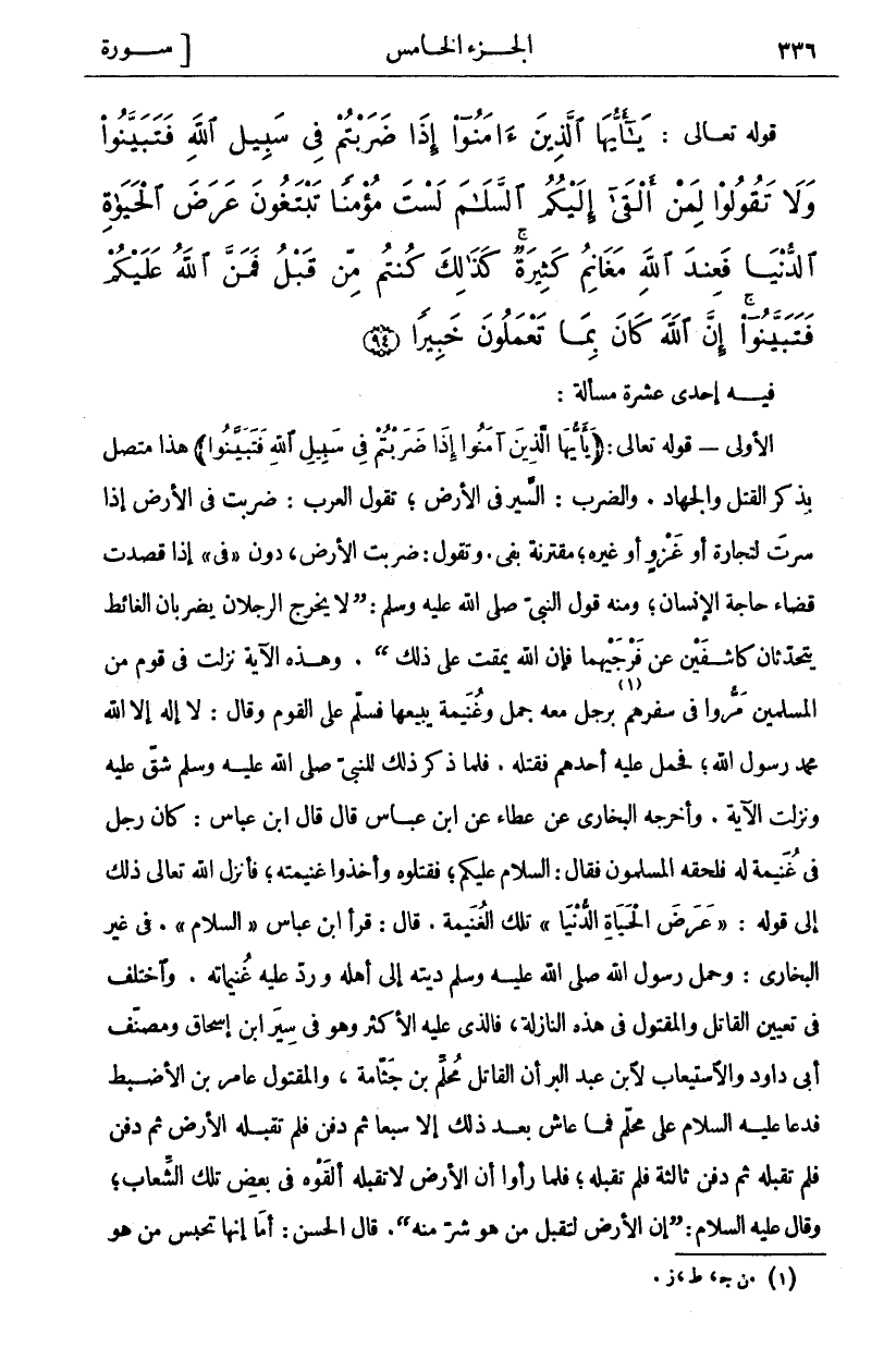 فِيهِ إِحْدَى عَشْرَةَ مَسْأَلَةً: الْأُولَى- قَوْلُهُ تَعَالَى: (يَا أَيُّهَا الَّذِينَ آمَنُوا إِذا ضَرَبْتُمْ فِي سَبِيلِ اللَّهِ فَتَبَيَّنُوا) هَذَا مُتَّصِلٌ بِذِكْرِ الْقَتْلِ وَالْجِهَادِ. وَالضَّرْبُ: السَّيْرُ فِي الْأَرْضِ، تَقُولُ الْعَرَبُ: ضَرَبْتُ فِي الْأَرْضِ إِذَا سِرْتُ لِتِجَارَةٍ أَوْ غَزْوٍ أَوْ غَيْرِهِ، مُقْتَرِنَةً بِفِي. وَتَقُولُ: ضَرَبْتُ الْأَرْضَ، دُونَ (فِي) إِذَا قَصَدْتَ قَضَاءَ حَاجَةِ الْإِنْسَانِ، وَمِنْهُ قَوْلُ النَّبِيِّ صَلَّى اللَّهُ عَلَيْهِ وَسَلَّمَ: (لَا يَخْرُجُ الرَّجُلَانِ يَضْرِبَانِ الْغَائِطَ يَتَحَدَّثَانِ كَاشِفَيْنِ عَنْ فَرْجَيْهِمَا فَإِنَّ اللَّهَ يَمْقُتُ عَلَى ذَلِكَ). وَهَذِهِ الْآيَةُ نَزَلَتْ فِي قَوْمٍ مِنَ الْمُسْلِمِينَ مَرُّوا فِي سَفَرِهِمْ «١» بِرَجُلٍ مَعَهُ جَمَلٌ وَغُنَيْمَةٌ يَبِيعُهَا فَسَلَّمَ عَلَى الْقَوْمِ وَقَالَ: لَا إِلَهَ إِلَّا اللَّهُ مُحَمَّدٌ رَسُولُ اللَّهِ، فَحَمَلَ عَلَيْهِ أَحَدُهُمْ فَقَتَلَهُ. فَلَمَّا ذُكِرَ ذَلِكَ لِلنَّبِيِّ صَلَّى اللَّهُ عَلَيْهِ وَسَلَّمَ شَقَّ عَلَيْهِ وَنَزَلَتِ الْآيَةُ. وَأَخْرَجَهُ الْبُخَارِيُّ عَنْ عَطَاءٍ عَنِ ابْنِ عَبَّاسٍ قَالَ قَالَ ابْنُ عَبَّاسٍ: كَانَ رَجُلٌ فِي غُنَيْمَةٍ لَهُ فَلَحِقَهُ الْمُسْلِمُونَ فَقَالَ: السَّلَامُ عَلَيْكُمْ، فَقَتَلُوهُ وَأَخَذُوا غُنَيْمَتَهُ، فَأَنْزَلَ اللَّهُ تَعَالَى ذَلِكَ إِلَى قَوْلِهِ: (عَرَضَ الْحَياةِ الدُّنْيا) تِلْكَ الْغُنَيْمَةُ. قَالَ: قَرَأَ ابْنُ عَبَّاسٍ (السَّلَامَ). فِي غَيْرِ الْبُخَارِيِّ: وَحَمَلَ رَسُولُ اللَّهِ صَلَّى اللَّهُ عَلَيْهِ وَسَلَّمَ دِيَتَهُ إِلَى أَهْلِهِ وَرَدَّ عَلَيْهِ غُنَيْمَاتِهِ. وَاخْتُلِفَ فِي تَعْيِينِ الْقَاتِلِ وَالْمَقْتُولِ فِي هَذِهِ النَّازِلَةِ، فَالَّذِي عَلَيْهِ الْأَكْثَرُ وَهُوَ فِي سِيَرِ ابْنِ إِسْحَاقَ وَمُصَنَّفِ أَبِي دَاوُدَ وَالِاسْتِيعَابِ لِابْنِ عَبْدِ الْبَرِّ أَنَّ الْقَاتِلَ مُحَلِّمُ بْنُ جَثَّامَةَ، وَالْمَقْتُولُ عَامِرُ بْنُ الْأَضْبَطِ فَدَعَا عَلَيْهِ السَّلَامُ عَلَى مُحَلِّمٍ فَمَا عَاشَ بَعْدَ ذَلِكَ إِلَّا سَبْعًا ثُمَّ دُفِنَ فَلَمْ تَقْبَلْهُ الْأَرْضُ ثُمَّ دُفِنَ فَلَمْ تَقْبَلْهُ ثُمَّ دُفِنَ ثَالِثَةً فَلَمْ تَقْبَلْهُ، فَلَمَّا رَأَوْا أَنَّ الْأَرْضَ لَا تَقْبَلُهُ أَلْقَوْهُ فِي بَعْضِ تِلْكَ الشِّعَابِ، وَقَالَ عَلَيْهِ السَّلَامُ: (إِنَّ الْأَرْضَ لَتَقْبَلُ مَنْ هُوَ شَرُّ مِنْهُ). قَالَ الْحَسَنُ: أَمَا إِنَّهَا تَحْبِسُ مَنْ هُوَ