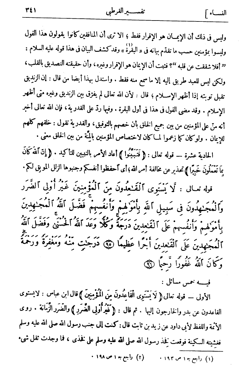 لَا يَسْتَوِي الْقاعِدُونَ مِنَ الْمُؤْمِنِينَ غَيْرُ أُولِي الضَّرَرِ وَالْمُجاهِدُونَ فِي سَبِيلِ اللَّهِ بِأَمْوالِهِمْ وَأَنْفُسِهِمْ فَضَّلَ اللَّهُ الْمُجاهِدِينَ بِأَمْوالِهِمْ وَأَنْفُسِهِمْ عَلَى الْقاعِدِينَ دَرَجَةً وَكُلاًّ وَعَدَ اللَّهُ الْحُسْنى وَفَضَّلَ اللَّهُ الْمُجاهِدِينَ عَلَى الْقاعِدِينَ أَجْراً عَظِيماً (٩٥) دَرَجاتٍ مِنْهُ وَمَغْفِرَةً وَرَحْمَةً وَكانَ اللَّهُ غَفُوراً رَحِيماً (٩٦)