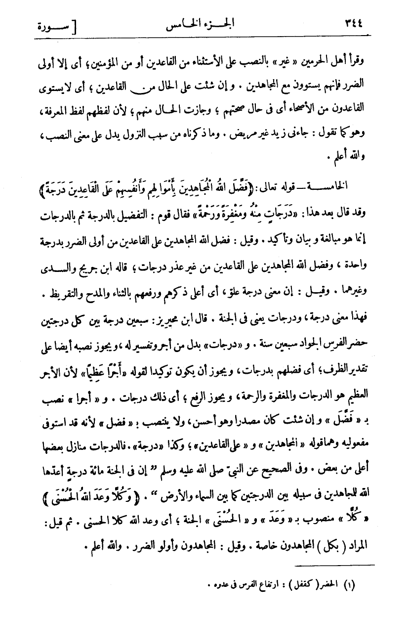 وَقَرَأَ أَهْلُ الْحَرَمَيْنِ (غَيْرَ) بِالنَّصْبِ عَلَى الِاسْتِثْنَاءِ مِنَ الْقَاعِدِينَ أَوْ مِنَ الْمُؤْمِنِينَ، أَيْ إِلَّا أُولِي الضَّرَرِ فَإِنَّهُمْ يَسْتَوُونَ مَعَ الْمُجَاهِدِينَ. وَإِنْ شِئْتَ عَلَى الْحَالِ مِنَ الْقَاعِدِينَ، أَيْ لَا يَسْتَوِي الْقَاعِدُونَ مِنَ الْأَصِحَّاءِ أَيْ فِي حَالِ صِحَّتِهِمْ، وَجَازَتِ الْحَالُ مِنْهُمْ، لِأَنَّ لَفْظَهُمْ لَفْظُ الْمَعْرِفَةِ، وَهُوَ كَمَا تَقُولُ: جَاءَنِي زَيْدٌ غَيْرُ مَرِيضٍ. وَمَا ذَكَرْنَاهُ مِنْ سَبَبِ النُّزُولِ يَدُلُّ على معنى النصب، والله أعلم. الخامسة- قوله تعالى: (فَضَّلَ اللَّهُ الْمُجاهِدِينَ بِأَمْوالِهِمْ وَأَنْفُسِهِمْ عَلَى الْقاعِدِينَ دَرَجَةً) وَقَدْ قَالَ بَعْدَ هَذَا: (دَرَجاتٍ مِنْهُ وَمَغْفِرَةً وَرَحْمَةً) فَقَالَ قَوْمٌ: التَّفْضِيلُ بِالدَّرَجَةِ ثُمَّ بِالدَّرَجَاتِ إِنَّمَا هُوَ مُبَالَغَةٌ وَبَيَانٌ وَتَأْكِيدٌ. وَقِيلَ: فَضَّلَ اللَّهُ الْمُجَاهِدِينَ عَلَى الْقَاعِدِينَ مِنْ أُولِي الضَّرَرِ بِدَرَجَةٍ وَاحِدَةٍ، وَفَضَّلَ اللَّهُ الْمُجَاهِدِينَ عَلَى القاعدين من غير عذر درجات، قاله ابْنُ جُرَيْجٍ وَالسُّدِّيُّ وَغَيْرُهُمَا. وَقِيلَ: إِنَّ مَعْنَى دَرَجَةٍ عُلُوٌّ، أَيْ أَعْلَى ذِكْرَهُمْ وَرَفَعَهُمْ بِالثَّنَاءِ والمدح والتقريظ. فهذا معنى درجة، ودرجات يَعْنِي فِي الْجَنَّةِ. قَالَ ابْنُ مُحَيْرِيزٍ: سَبْعِينَ دَرَجَةً بَيْنَ كُلِّ دَرَجَتَيْنِ حُضْرُ «١» الْفَرَسِ الْجَوَادِ سبعين سنة. و (دَرَجاتٍ) بَدَلٌ مِنْ أَجْرٍ وَتَفْسِيرُ لَهُ، وَيَجُوزُ نَصْبُهُ أَيْضًا عَلَى تَقْدِيرِ الظَّرْفِ، أَيْ فَضَّلَهُمْ بِدَرَجَاتٍ، ويجوز أن يكون توكيدا لقوله (أَجْراً عَظِيماً) لِأَنَّ الْأَجْرَ الْعَظِيمَ هُوَ الدَّرَجَاتُ وَالْمَغْفِرَةُ وَالرَّحْمَةُ، وَيَجُوزُ الرَّفْعُ، أَيْ ذَلِكَ دَرَجَاتٌ. و (أَجْراً) نُصِبَ بِ (فَضَّلَ) وَإِنْ شِئْتَ كَانَ مَصْدَرًا وَهُوَ أَحْسَنُ، وَلَا يَنْتَصِبُ بِ (فَضَّلَ) لِأَنَّهُ قد استوفى مفعولية وهما قوله (الْمُجاهِدِينَ) و (عَلَى الْقاعِدِينَ)، وَكَذَا (دَرَجَةً). فَالدَّرَجَاتُ مَنَازِلُ بَعْضُهَا أَعْلَى مِنْ بَعْضٍ. وَفِي الصَّحِيحِ عَنِ النَّبِيِّ صَلَّى اللَّهُ عَلَيْهِ وَسَلَّمَ (أَنَّ فِي الْجَنَّةِ مِائَةَ دَرَجَةٍ أَعَدَّهَا اللَّهُ لِلْمُجَاهِدِينَ فِي سَبِيلِهِ بَيْنَ الدَّرَجَتَيْنِ كَمَا بَيْنَ السَّمَاءِ وَالْأَرْضِ (.) وَكُلًّا وَعَدَ اللَّهُ الْحُسْنى كُلًّا منصوب ب (وَعَدَ) و (الْحُسْنى) الْجَنَّةُ، أَيْ وَعَدَ اللَّهُ كُلًّا الْحُسْنَى. ثُمَّ قِيلَ: الْمُرَادُ (بِكُلٍّ) الْمُجَاهِدُونَ خَاصَّةً. وَقِيلَ: الْمُجَاهِدُونَ واو لو الضرر. والله أعلم.