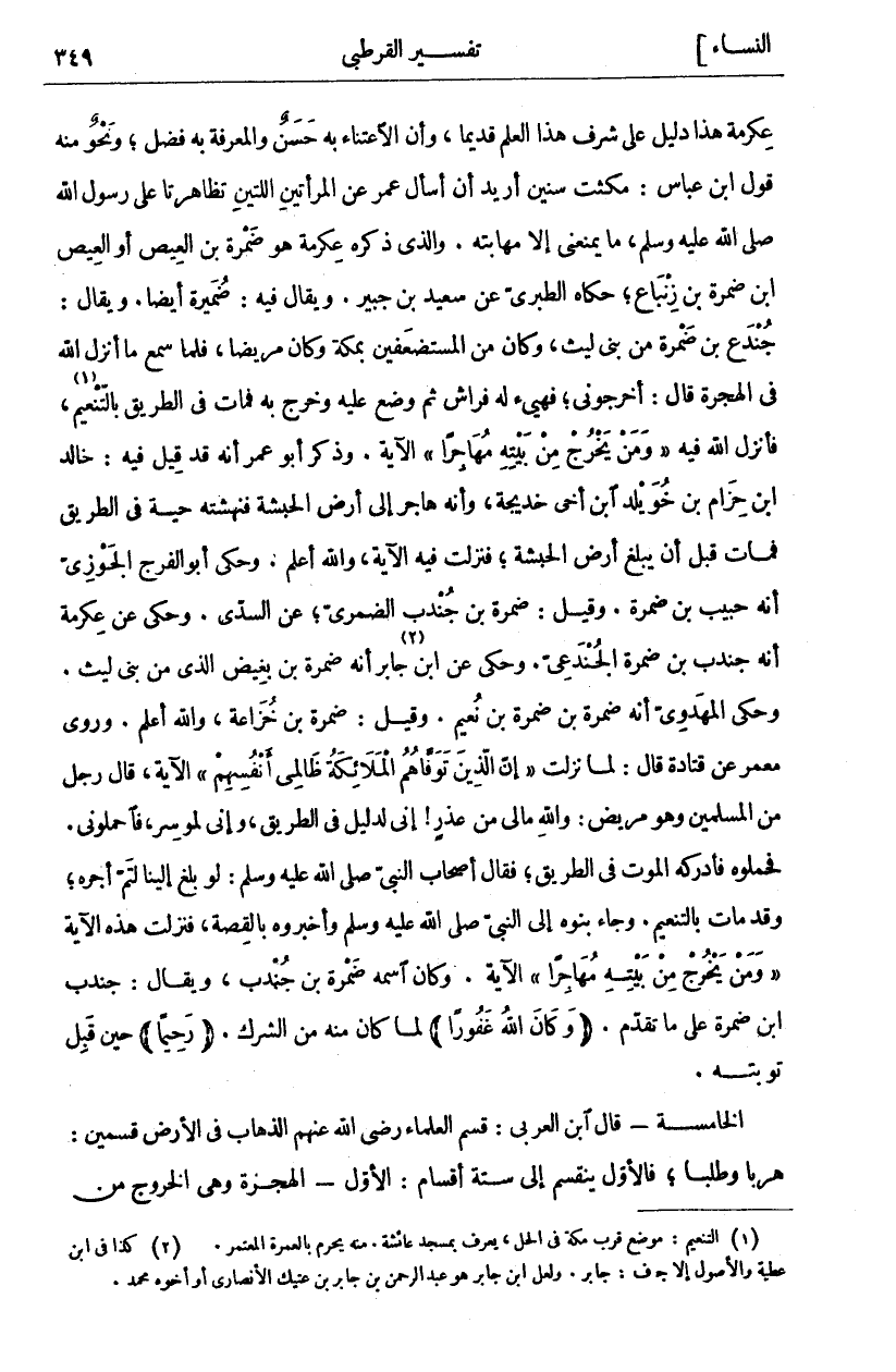 عِكْرِمَةَ هَذَا دَلِيلٌ عَلَى شَرَفِ هَذَا الْعِلْمِ قَدِيمًا، وَأَنَّ الِاعْتِنَاءَ بِهِ حَسَنٌ وَالْمَعْرِفَةَ بِهِ فَضْلٌ، وَنَحْوٌ مِنْهُ قَوْلُ ابْنِ عَبَّاسٍ: مَكَثْتُ سِنِينَ أُرِيدُ أَنْ أَسْأَلَ عُمَرَ عَنِ الْمَرْأَتَيْنِ اللَّتَيْنِ تَظَاهَرَتَا عَلَى رَسُولِ اللَّهِ صَلَّى اللَّهُ عَلَيْهِ وَسَلَّمَ، مَا يَمْنَعُنِي إِلَّا مَهَابَتُهُ. وَالَّذِي ذَكَرَهُ عِكْرِمَةُ هُوَ ضَمْرَةُ بْنُ الْعِيصِ أَوِ العيص ابن ضَمْرَةَ بْنِ زِنْبَاعٍ، حَكَاهُ الطَّبَرِيُّ عَنْ سَعِيدِ بْنِ جُبَيْرٍ. وَيُقَالُ فِيهِ: ضَمِيرَةُ أَيْضًا. وَيُقَالُ: جُنْدَعُ بْنُ ضَمْرَةَ مِنْ بَنِي لَيْثٍ، وَكَانَ مِنَ الْمُسْتَضْعَفِينَ بِمَكَّةَ وَكَانَ مَرِيضًا، فَلَمَّا سَمِعَ مَا أَنْزَلَ اللَّهُ فِي الْهِجْرَةِ قَالَ: أَخْرِجُونِي، فَهُيِّئَ لَهُ فِرَاشٌ ثُمَّ وُضِعَ عَلَيْهِ وَخَرَجَ بِهِ فَمَاتَ فِي الطَّرِيقِ بِالتَّنْعِيمِ «١»، فَأَنْزَلَ اللَّهُ فِيهِ (وَمَنْ يَخْرُجْ مِنْ بَيْتِهِ مُهاجِراً) الْآيَةَ. وَذَكَرَ أَبُو عُمَرَ أَنَّهُ قَدْ قِيلَ فِيهِ: خالد ابن حِزَامِ بْنِ خُوَيْلِدٍ ابْنُ أَخِي خَدِيجَةَ، وَأَنَّهُ هَاجَرَ إِلَى أَرْضِ الْحَبَشَةِ فَنَهَشَتْهُ حَيَّةٌ فِي الطَّرِيقِ فَمَاتَ قَبْلَ أَنْ يَبْلُغَ أَرْضَ الْحَبَشَةِ، فَنَزَلَتْ فِيهِ الْآيَةُ، وَاللَّهُ أَعْلَمُ. وَحَكَى أَبُو الْفَرَجِ الْجَوْزِيُّ أَنَّهُ حَبِيبُ بْنُ ضَمْرَةَ. وَقِيلَ: ضَمْرَةُ بْنُ جُنْدَبٍ الضَّمْرِيُّ، عَنِ السُّدِّيِّ. وَحُكِيَ عَنْ عِكْرِمَةَ أَنَّهُ جُنْدَبُ بْنُ ضَمْرَةَ الْجُنْدُعِيُّ. وَحُكِيَ عَنِ ابْنِ «٢» جَابِرٍ أَنَّهُ ضَمْرَةُ بْنُ بَغِيضٍ الَّذِي مِنْ بَنِي لَيْثٍ. وَحَكَى الْمَهْدَوِيُّ أَنَّهُ ضَمْرَةُ بْنُ ضَمْرَةَ بْنِ نُعَيْمٍ. وَقِيلَ: ضَمْرَةُ بْنُ خُزَاعَةَ، وَاللَّهُ أَعْلَمُ. وَرَوَى مَعْمَرٌ عَنْ قَتَادَةَ قَالَ: لَمَّا نَزَلَتْ (إِنَّ الَّذِينَ تَوَفَّاهُمُ الْمَلائِكَةُ ظالِمِي أَنْفُسِهِمْ) الْآيَةَ، قَالَ رَجُلٌ مِنَ الْمُسْلِمِينَ وَهُوَ مَرِيضٌ: وَاللَّهِ مَا لِي مِنْ عُذْرٍ! إِنِّي لَدَلِيلٌ فِي الطَّرِيقِ، وَإِنِّي لَمُوسِرٌ، فَاحْمِلُونِي. فَحَمَلُوهُ فَأَدْرَكَهُ الْمَوْتُ فِي الطَّرِيقِ، فَقَالَ أَصْحَابُ النَّبِيِّ صَلَّى اللَّهُ عَلَيْهِ وَسَلَّمَ: لَوْ بَلَغَ إِلَيْنَا لَتَمَّ أَجْرُهُ، وَقَدْ مَاتَ بِالتَّنْعِيمِ. وَجَاءَ بَنُوهُ إِلَى النَّبِيِّ صَلَّى اللَّهُ عَلَيْهِ وَسَلَّمَ وَأَخْبَرُوهُ بِالْقِصَّةِ، فَنَزَلَتْ هَذِهِ الْآيَةُ (وَمَنْ يَخْرُجْ مِنْ بَيْتِهِ مُهَاجِرًا) الْآيَةَ. وَكَانَ اسمه ضمرة بن جندب، ويقال: جندب ابن ضَمْرَةَ عَلَى مَا تَقَدَّمَ. (وَكَانَ اللَّهُ غَفُورًا) لِمَا كَانَ مِنْهُ مِنَ الشِّرْكِ. (رَحِيمًا) حِينَ قَبِلَ تَوْبَتَهُ. الْخَامِسَةُ- قَالَ ابْنُ الْعَرَبِيِّ: قَسَّمَ الْعُلَمَاءُ رَضِيَ اللَّهُ عَنْهُمْ الذَّهَابَ فِي الْأَرْضِ قِسْمَيْنِ: هَرَبًا وَطَلَبًا، فَالْأَوَّلُ يَنْقَسِمُ إِلَى سِتَّةِ أقسام: الأول- الهجرة وهي الخروج من