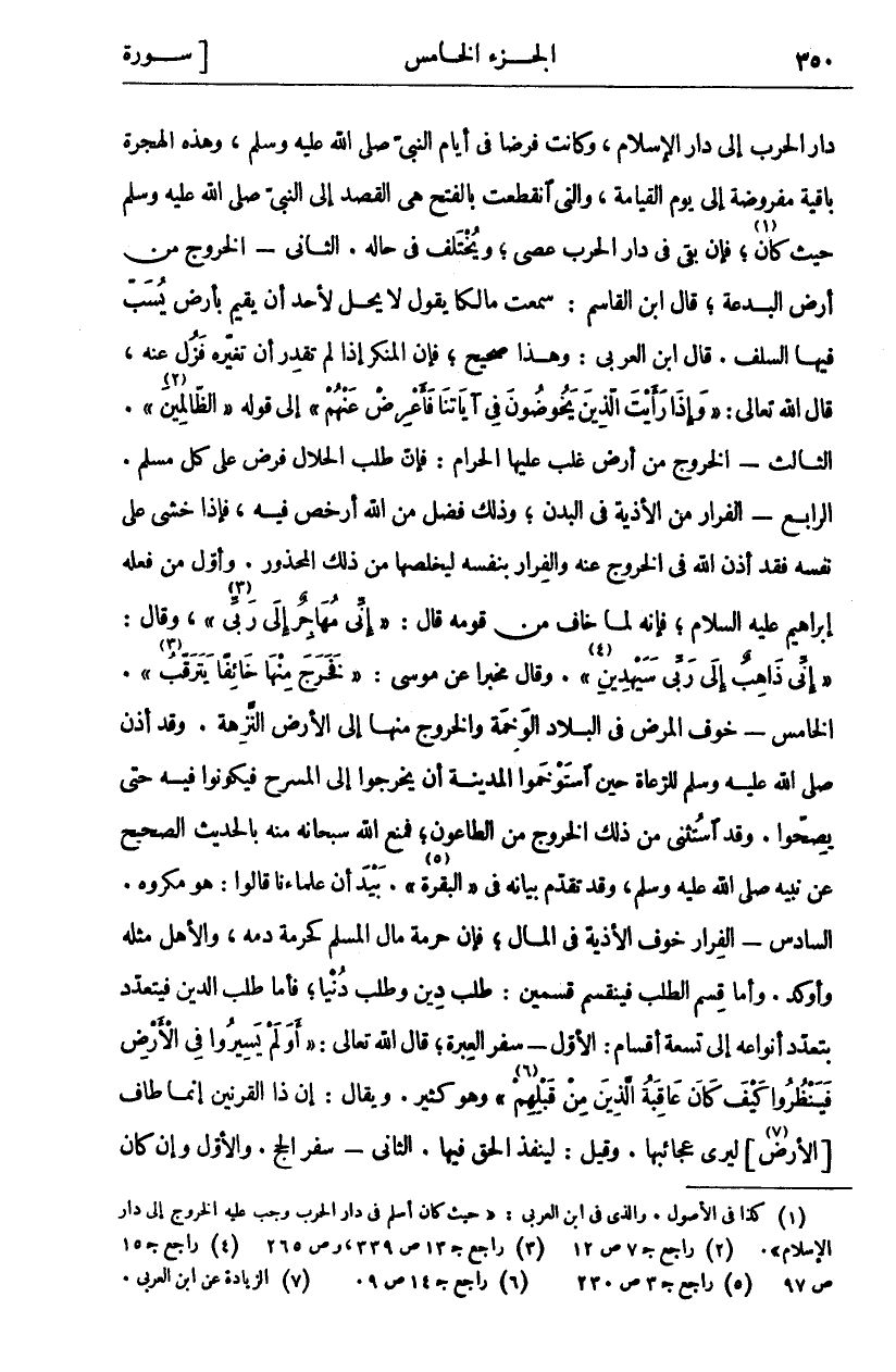 دَارِ الْحَرْبِ إِلَى دَارِ الْإِسْلَامِ، وَكَانَتْ فَرْضًا فِي أَيَّامِ النَّبِيِّ صَلَّى اللَّهُ عَلَيْهِ وَسَلَّمَ، وَهَذِهِ الْهِجْرَةُ بَاقِيَةٌ مَفْرُوضَةٌ إِلَى يَوْمِ الْقِيَامَةِ، وَالَّتِي انْقَطَعَتْ بِالْفَتْحِ هِيَ الْقَصْدُ إِلَى النَّبِيِّ صَلَّى اللَّهُ عَلَيْهِ وَسَلَّمَ حَيْثُ كَانَ «١»، فَإِنْ بَقِيَ فِي دَارِ الْحَرْبِ عَصَى، وَيَخْتَلِفُ فِي حَالِهِ. الثَّانِي- الْخُرُوجُ مِنْ أَرْضِ الْبِدْعَةِ، قَالَ ابْنُ الْقَاسِمِ: سَمِعْتُ مَالِكًا يَقُولُ لَا يَحِلُّ لِأَحَدٍ أَنْ يُقِيمَ بِأَرْضٍ يُسَبُّ فِيهَا السَّلَفُ. قَالَ ابْنُ الْعَرَبِيِّ: وَهَذَا صَحِيحٌ، فَإِنَّ الْمُنْكَرَ إِذَا لَمْ تَقْدِرْ أَنْ تُغَيِّرَهُ فَزُلْ عَنْهُ، قَالَ اللَّهُ تَعَالَى: (وَإِذا رَأَيْتَ الَّذِينَ يَخُوضُونَ فِي آياتِنا فَأَعْرِضْ عَنْهُمْ) إِلَى قَوْلِهِ (الظَّالِمِينَ «٢»). الثَّالِثُ- الْخُرُوجُ مِنْ أَرْضٍ غَلَبَ عَلَيْهَا الْحَرَامُ: فَإِنَّ طَلَبَ الْحَلَالِ فَرْضٌ عَلَى كُلِّ مُسْلِمٍ. الرَّابِعُ- الْفِرَارُ مِنَ الْأَذِيَّةِ فِي الْبَدَنِ، وَذَلِكَ فَضْلٌ مِنَ اللَّهِ أَرْخَصَ فِيهِ، فَإِذَا خَشِيَ عَلَى نَفْسِهِ فَقَدْ أَذِنَ اللَّهُ فِي الْخُرُوجِ عَنْهُ وَالْفِرَارِ بِنَفْسِهِ لِيُخَلِّصَهَا مِنْ ذَلِكَ الْمَحْذُورِ. وَأَوَّلُ مَنْ فَعَلَهُ إِبْرَاهِيمُ عَلَيْهِ السَّلَامُ، فَإِنَّهُ لَمَّا خَافَ مِنْ قَوْمِهِ قَالَ: (إِنِّي مُهَاجِرٌ إلى ربي «٣»، وقال: (إني ذاهب إلى ربي سيهدين «٤»). وَقَالَ مُخْبِرًا عَنْ مُوسَى: (فَخَرَجَ مِنْهَا خَائِفًا يَتَرَقَّبُ «٥»). الْخَامِسُ- خَوْفُ الْمَرَضِ فِي الْبِلَادِ الْوَخِمَةِ وَالْخُرُوجُ مِنْهَا إِلَى الْأَرْضِ النَّزِهَةِ. وَقَدْ أَذِنَ صَلَّى اللَّهُ عَلَيْهِ وَسَلَّمَ لِلرُّعَاةِ حِينَ اسْتَوْخَمُوا الْمَدِينَةَ أَنْ يَخْرُجُوا إِلَى الْمَسْرَحِ فَيَكُونُوا فِيهِ حَتَّى يَصِحُّوا. وَقَدِ اسْتُثْنِيَ مِنْ ذَلِكَ الْخُرُوجُ مِنَ الطَّاعُونِ، فَمَنَعَ اللَّهُ سُبْحَانَهُ مِنْهُ بِالْحَدِيثِ الصَّحِيحِ عَنْ نَبِيِّهِ صَلَّى اللَّهُ عَلَيْهِ وَسَلَّمَ، وَقَدْ تَقَدَّمَ بَيَانُهُ فِي (الْبَقَرَةِ «٦»). بَيْدَ أَنَّ عُلَمَاءَنَا قَالُوا: هُوَ مَكْرُوهٌ. السَّادِسُ- الْفِرَارُ خَوْفَ الْأَذِيَّةِ فِي الْمَالِ، فَإِنَّ حُرْمَةَ مَالِ الْمُسْلِمِ كَحُرْمَةِ دَمِهِ، وَالْأَهْلُ مِثْلُهُ وَأَوْكَدُ. وَأَمَّا قِسْمُ الطَّلَبِ فَيَنْقَسِمُ قِسْمَيْنِ: طَلَبُ دِينٍ وَطَلَبُ دُنْيَا، فَأَمَّا طَلَبُ الدِّينِ فَيَتَعَدَّدُ بِتَعَدُّدِ أَنْوَاعِهِ إِلَى تِسْعَةِ أَقْسَامٍ: الْأَوَّلُ- سَفَرُ الْعِبْرَةِ، قَالَ اللَّهُ تَعَالَى: (أَوَلَمْ يَسِيرُوا فِي الْأَرْضِ فَيَنْظُرُوا كَيْفَ كانَ عاقِبَةُ الَّذِينَ مِنْ قَبْلِهِمْ «٧») وَهُوَ كَثِيرٌ. وَيُقَالُ: إِنَّ ذَا الْقَرْنَيْنِ إِنَّمَا طَافَ [الْأَرْضَ «٨»] لِيَرَى عَجَائِبَهَا. وَقِيلَ: لِيُنَفِّذَ الْحَقَّ فِيهَا. الثَّانِي- سفر الحج. والأول وإن كان