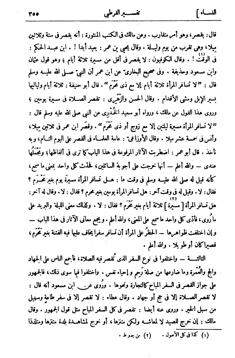 قَالَ: يَقْصُرُ، وَهُوَ أَمْرٌ مُتَقَارِبٌ. وَعَنْ مَالِكٍ فِي الْكُتُبِ الْمَنْثُورَةِ: أَنَّهُ يَقْصُرُ فِي سِتَّةٍ وَثَلَاثِينَ مِيلًا، وَهِيَ تَقْرَبُ مِنْ يَوْمٍ وَلَيْلَةٍ. وَقَالَ يَحْيَى بْنُ عُمَرَ: يُعِيدُ أَبَدًا!. ابْنُ عَبْدِ الْحَكَمِ: فِي الْوَقْتِ «١»!. وَقَالَ الْكُوفِيُّونَ: لَا يَقْصُرُ فِي أَقَلَّ مِنْ مَسِيرَةِ ثَلَاثَةِ أَيَّامٍ، وَهُوَ قَوْلُ عُثْمَانَ وَابْنِ مَسْعُودٍ وَحُذَيْفَةَ. وَفِي صَحِيحِ الْبُخَارِيِّ عَنِ ابْنِ عُمَرَ أَنَّ النَّبِيَّ صَلَّى اللَّهُ عَلَيْهِ وَسَلَّمَ قَالَ: (لَا تسافر الْمَرْأَةُ ثَلَاثَةَ أَيَّامٍ إِلَّا مَعَ ذِي مَحْرَمٍ). قَالَ أَبُو حَنِيفَةَ: ثَلَاثَةُ أَيَّامِ وَلَيَالِيهَا بِسَيْرِ الْإِبِلِ وَمَشْيِ الْأَقْدَامِ. وَقَالَ الْحَسَنُ وَالزُّهْرِيُّ: تَقْصُرُ الصَّلَاةَ فِي مَسِيرَةِ يَوْمَيْنِ، وَرُوِيَ هَذَا الْقَوْلُ عَنْ مَالِكٍ، وَرَوَاهُ أَبُو سَعِيدٍ الْخُدْرِيُّ عَنِ النَّبِيِّ صَلَّى اللَّهُ عَلَيْهِ وَسَلَّمَ قال: (لا تُسَافِرُ الْمَرْأَةُ مَسِيرَةَ لَيْلَتَيْنِ إِلَّا مَعَ زَوْجٍ أَوْ ذِي مَحْرَمٍ). وَقَصَرَ ابْنُ عُمَرَ فِي ثَلَاثِينَ مِيلًا، وَأَنَسٌ فِي خَمْسَةَ عَشَرَ مِيلًا. وَقَالَ الْأَوْزَاعِيُّ: عَامَّةُ الْعُلَمَاءِ فِي الْقَصْرِ عَلَى الْيَوْمِ التَّامِّ، وَبِهِ نَأْخُذُ. قَالَ أَبُو عُمَرَ: اضْطَرَبَتِ الْآثَارُ الْمَرْفُوعَةُ فِي هَذَا الْبَابِ كَمَا تَرَى فِي أَلْفَاظِهَا، وَمُجْمَلُهَا عِنْدِي- وَاللَّهُ أَعْلَمُ- أَنَّهَا خَرَجَتْ عَلَى أَجْوِبَةِ السَّائِلِينَ، فَحَدَّثَ كُلُّ وَاحِدٍ بِمَعْنَى مَا سَمِعَ، كَأَنَّهُ قِيلَ لَهُ صَلَّى اللَّهُ عَلَيْهِ وَسَلَّمَ فِي وَقْتٍ مَا: هَلْ تُسَافِرُ الْمَرْأَةُ مَسِيرَةَ يَوْمٍ بِغَيْرِ مَحْرَمٍ؟ فَقَالَ: لَا. وَقِيلَ لَهُ فِي وَقْتٍ آخَرَ: هَلْ تُسَافِرُ الْمَرْأَةُ يَوْمَيْنِ بِغَيْرِ مَحْرَمٍ؟ فَقَالَ: لَا. وَقَالَ لَهُ آخَرُ: هَلْ تُسَافِرُ الْمَرْأَةُ [مَسِيرَةَ «٢» [ثَلَاثَةِ أَيَّامٍ بِغَيْرِ مَحْرَمٍ؟ فَقَالَ: لَا. وَكَذَلِكَ مَعْنَى اللَّيْلَةِ وَالْبَرِيدِ عَلَى مَا رُوِيَ، فَأَدَّى كُلُّ وَاحِدٍ مَا سَمِعَ عَلَى الْمَعْنَى، وَاللَّهُ أَعْلَمُ. وَيَجْمَعُ مَعَانِي الْآثَارِ فِي هَذَا الْبَابِ- وَإِنِ اخْتَلَفَتْ ظَوَاهِرُهَا- الْحَظْرُ عَلَى الْمَرْأَةِ أَنْ تُسَافِرَ سَفَرًا يُخَافُ عَلَيْهَا فِيهِ الْفِتْنَةُ بِغَيْرِ مَحْرَمٍ، قَصِيرًا كَانَ أَوْ طَوِيلًا. وَاللَّهُ أَعْلَمُ. الثَّالِثَةُ- وَاخْتَلَفُوا فِي نَوْعِ السَّفَرِ الَّذِي تُقْصَرُ فِيهِ الصَّلَاةُ، فَأَجْمَعَ النَّاسُ عَلَى الْجِهَادِ وَالْحَجِّ وَالْعُمْرَةِ وَمَا ضَارَعَهَا مِنْ صِلَةِ رَحِمٍ وَإِحْيَاءِ نَفْسٍ. وَاخْتَلَفُوا فِيمَا سِوَى ذَلِكَ، فَالْجُمْهُورُ عَلَى جَوَازِ الْقَصْرِ فِي السَّفَرِ الْمُبَاحِ كَالتِّجَارَةِ وَنَحْوِهَا. وَرُوِيَ عَنِ ابْنِ مَسْعُودٍ أَنَّهُ قَالَ: لَا تُقْصَرُ الصَّلَاةُ إِلَّا فِي حَجٍّ أَوْ جِهَادٍ. وَقَالَ عَطَاءٌ: لَا تُقْصَرُ إِلَّا فِي سَفَرِ طَاعَةٍ وَسَبِيلٍ مِنْ سُبُلِ الْخَيْرِ. وَرُوِيَ عَنْهُ أَيْضًا: تُقْصَرُ فِي كُلِّ السَّفَرِ الْمُبَاحِ مِثْلَ قَوْلِ الْجُمْهُورِ. وَقَالَ مَالِكٌ: إِنْ خَرَجَ لِلصَّيْدِ لَا لِمَعَاشِهِ وَلَكِنْ مُتَنَزِّهًا، أَوْ خَرَجَ لمشاهدة بلدة متنزها ومتلذذا
