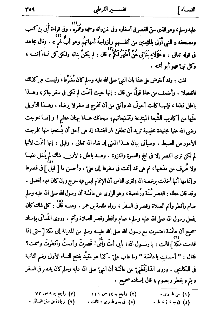 عَلَيْهِ وَسَلَّمَ، وَهُوَ الَّذِي سَنَّ الْقَصْرَ فِي أَسْفَارِهِ وَفِي غَزَوَاتِهِ وَحَجِّهِ وَعُمَرِهِ «١». وَفِي قِرَاءَةِ أُبَيِّ بْنِ كَعْبٍ وَمُصْحَفِهِ (النَّبِيُّ أَوْلَى بِالْمُؤْمِنِينَ مِنْ أَنْفُسِهِمْ وَأَزْوَاجُهُ أُمَّهَاتُهُمْ وَهُوَ أَبٌ لَهُمْ «٢». وَقَالَ مُجَاهِدٌ فِي قَوْلِهِ تَعَالَى:) هؤُلاءِ بَناتِي هُنَّ أَطْهَرُ لَكُمْ «٣» (قَالَ: لَمْ يَكُنَّ بَنَاتِهِ وَلَكِنْ كُنَّ نِسَاءَ أُمَّتِهِ، وَكُلُّ نَبِيٍّ فَهُوَ أَبُو أُمَّتِهِ. قُلْتُ: وَقَدِ اعْتُرِضَ عَلَى هَذَا بِأَنَّ النَّبِيَّ صَلَّى اللَّهُ عَلَيْهِ وَسَلَّمَ كَانَ مُشَرِّعًا، وَلَيْسَتْ هِيَ كَذَلِكَ فَانْفَصَلَا. وَأَضْعَفُ مِنْ هَذَا قَوْلُ مَنْ قَالَ: إِنَّهَا حَيْثُ أَتَمَّتْ لَمْ تَكُنْ فِي سَفَرٍ جَائِزٍ، وَهَذَا بَاطِلٌ قَطْعًا، فَإِنَّهَا كَانَتْ أَخْوَفَ لِلَّهِ وَأَتْقَى مِنْ أَنْ تَخْرُجَ فِي سَفَرٍ لَا يَرْضَاهُ. وَهَذَا التَّأْوِيلُ عَلَيْهَا مِنْ أَكَاذِيبِ الشِّيعَةِ الْمُبْتَدِعَةِ وَتَشْنِيعَاتِهِمْ، سُبْحَانَكَ هَذَا بُهْتَانٌ عَظِيمٌ! وَإِنَّمَا خَرَجَتْ رَضِيَ اللَّهُ عَنْهَا مُجْتَهِدَةً مُحْتَسِبَةً تُرِيدُ أَنْ تُطْفِئَ نَارَ الْفِتْنَةِ، إِذْ هِيَ أَحَقُّ أَنْ يُسْتَحْيَا مِنْهَا فَخَرَجَتِ الْأُمُورُ عَنِ الضَّبْطِ. وَسَيَأْتِي بَيَانُ هَذَا الْمَعْنَى إِنْ شَاءَ اللَّهُ تَعَالَى. وَقِيلَ: إِنَّهَا أَتَمَّتْ لِأَنَّهَا لَمْ تَكُنْ تَرَى الْقَصْرَ إِلَّا فِي الْحَجِّ وَالْعُمْرَةِ وَالْغَزْوَةِ. وَهَذَا بَاطِلٌ، لِأَنَّ ذَلِكَ لَمْ يُنْقَلْ عَنْهَا وَلَا عُرِفَ مِنْ مَذْهَبِهَا، ثُمَّ هِيَ قَدْ أَتَمَّتْ فِي سَفَرِهَا إِلَى عَلِيٍّ. وَأَحْسَنُ مَا [قِيلَ «٤» [فِي قَصْرِهَا وَإِتْمَامِهَا أَنَّهَا أَخَذَتْ بِرُخْصَةِ اللَّهِ، لِتُرِيَ النَّاسَ أَنَّ الْإِتْمَامَ لَيْسَ فِيهِ حَرَجٌ وَإِنْ كَانَ غَيْرُهُ أَفْضَلَ. وَقَدْ قَالَ عَطَاءٌ: الْقَصْرُ سُنَّةٌ وَرُخْصَةٌ، وَهُوَ الرَّاوِي عَنْ عَائِشَةَ أَنَّ رَسُولَ اللَّهِ صَلَّى اللَّهُ عَلَيْهِ وَسَلَّمَ صام وَأَفْطَرَ وَأَتَمَّ الصَّلَاةَ وَقَصَرَ فِي السَّفَرِ، رَوَاهُ طَلْحَةَ بْنُ عُمَرَ. وَعَنْهُ قَالَ «٥»: كُلُّ ذَلِكَ كَانَ يَفْعَلُ رَسُولُ اللَّهِ صَلَّى اللَّهُ عَلَيْهِ وَسَلَّمَ، صَامَ وَأَفْطَرَ وَقَصَرَ الصَّلَاةَ وَأَتَمَّ. وَرَوَى النَّسَائِيُّ بِإِسْنَادٍ صَحِيحٍ أَنَّ عَائِشَةَ اعْتَمَرَتْ مَعَ رَسُولِ اللَّهِ صَلَّى اللَّهُ عَلَيْهِ وَسَلَّمَ من الْمَدِينَةِ إِلَى مَكَّةَ [حَتَّى إِذَا قَدِمَتْ مَكَّةَ «٦»] قَالَتْ: يَا رَسُولَ اللَّهِ، بِأَبِي أَنْتَ وَأُمِّي! قَصَرْتَ وَأَتْمَمْتُ وَأَفْطَرْتَ وَصُمْتُ؟ فَقَالَ: (أَحْسَنْتِ يَا عَائِشَةُ) وَمَا عَابَ عَلَيَّ. كَذَا هُوَ مُقَيَّدٌ بِفَتْحِ التَّاءِ الْأُولَى وَضَمِّ الثَّانِيةِ فِي الْكَلِمَتَيْنِ. وَرَوَى الدَّارَقُطْنِيُّ عَنْ عَائِشَةَ أَنَّ النَّبِيَّ صَلَّى اللَّهُ عَلَيْهِ وَسَلَّمَ كَانَ يَقْصُرُ فِي السَّفَرِ ويتم ويفطر ويصوم، قال إسناده صحيح.