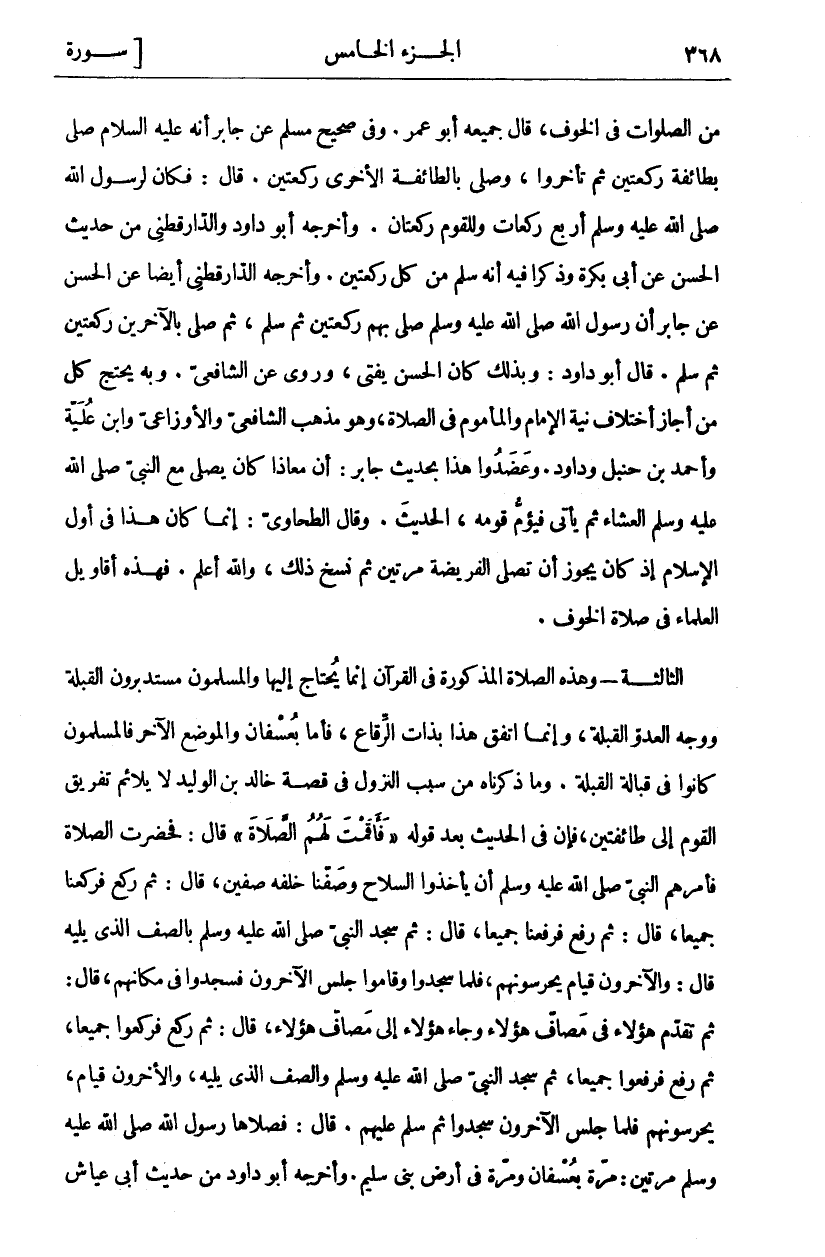مِنَ الصَّلَوَاتِ فِي الْخَوْفِ، قَالَ جَمِيعُهُ أَبُو عُمَرَ. وَفِي صَحِيحِ مُسْلِمٍ عَنْ جَابِرٍ أَنَّهُ عليه والسلام صَلَّى بِطَائِفَةٍ رَكْعَتَيْنِ ثُمَّ تَأَخَّرُوا، وَصَلَّى بِالطَّائِفَةِ الْأُخْرَى رَكْعَتَيْنِ. قَالَ: فَكَانَ لِرَسُولِ اللَّهِ صَلَّى اللَّهُ عَلَيْهِ وَسَلَّمَ أَرْبَعُ رَكَعَاتٍ وَلِلْقَوْمِ رَكْعَتَانِ. وَأَخْرَجَهُ أَبُو دَاوُدَ وَالدَّارَقُطْنِيُّ مِنْ حَدِيثِ الْحَسَنِ عَنْ أَبِي بَكْرَةَ وَذَكَرَا فِيهِ أَنَّهُ سَلَّمَ مِنْ كُلِّ رَكْعَتَيْنِ. وَأَخْرَجَهُ الدَّارَقُطْنِيُّ أَيْضًا عَنِ الْحَسَنِ عَنْ جَابِرٍ أَنَّ رَسُولَ اللَّهِ صَلَّى اللَّهُ عَلَيْهِ وَسَلَّمَ صَلَّى بِهِمْ رَكْعَتَيْنِ ثُمَّ سَلَّمَ، ثُمَّ صَلَّى بِالْآخَرِينَ رَكْعَتَيْنِ ثُمَّ سَلَّمَ. قَالَ أَبُو دَاوُدَ: وَبِذَلِكَ كَانَ الْحَسَنُ يُفْتِي، وَرُوِيَ عَنِ الشَّافِعِيِّ. وَبِهِ يَحْتَجُّ كُلُّ مَنْ أَجَازَ اخْتِلَافَ نِيَّةِ الْإِمَامِ وَالْمَأْمُومِ فِي الصَّلَاةِ، وَهُوَ مَذْهَبُ الشَّافِعِيِّ وَالْأَوْزَاعِيِّ وَابْنِ عُلَيَّةَ وَأَحْمَدَ بْنِ حَنْبَلٍ وَدَاوُدَ. وَعَضَّدُوا هَذَا بِحَدِيثِ جَابِرٍ: أَنَّ مُعَاذًا كَانَ يُصَلِّي مَعَ النَّبِيِّ صَلَّى اللَّهُ عَلَيْهِ وَسَلَّمَ الْعِشَاءَ ثُمَّ يَأْتِي فَيَؤُمُّ قَوْمَهُ، الْحَدِيثَ. وَقَالَ الطَّحَاوِيُّ: إِنَّمَا كَانَ هَذَا فِي أَوَّلِ الْإِسْلَامِ إِذْ كَانَ يَجُوزُ أَنْ تُصَلِّيَ الْفَرِيضَةَ مَرَّتَيْنِ ثُمَّ نُسِخَ ذَلِكَ، وَاللَّهُ أَعْلَمُ. فَهَذِهِ أَقَاوِيلُ الْعُلَمَاءِ فِي صَلَاةِ الْخَوْفِ. الثَّالِثَةُ- وَهَذِهِ الصَّلَاةُ الْمَذْكُورَةُ فِي الْقُرْآنِ إِنَّمَا يُحْتَاجُ إِلَيْهَا وَالْمُسْلِمُونَ مُسْتَدْبِرُونَ الْقِبْلَةَ وَوَجْهُ الْعَدُوِّ الْقِبْلَةُ، وَإِنَّمَا اتَّفَقَ هَذَا بِذَاتِ الرِّقَاعِ، فَأَمَّا بِعُسْفَانَ وَالْمَوْضِعِ الْآخَرِ فَالْمُسْلِمُونَ كَانُوا فِي قُبَالَةِ الْقِبْلَةِ. وَمَا ذَكَرْنَاهُ مِنْ سَبَبِ النُّزُولِ فِي قِصَّةِ خَالِدِ بْنِ الْوَلِيدِ لَا يُلَائِمُ تَفْرِيقَ الْقَوْمِ إِلَى طَائِفَتَيْنِ، فَإِنَّ فِي الْحَدِيثِ بَعْدَ قَوْلِهِ (فَأَقَمْتَ لَهُمُ الصَّلاةَ) قَالَ: فَحَضَرَتِ الصَّلَاةُ فَأَمَرَهُمُ النَّبِيُّ صَلَّى اللَّهُ عَلَيْهِ وَسَلَّمَ أَنْ يَأْخُذُوا السِّلَاحَ وَصَفَّنَا خَلْفَهُ صَفَّيْنِ، قَالَ: ثُمَّ رَكَعَ فَرَكَعْنَا جَمِيعًا، قَالَ: ثُمَّ رَفَعَ فَرَفَعْنَا جَمِيعًا، قَالَ: ثُمَّ سَجَدَ النَّبِيُّ صَلَّى اللَّهُ عَلَيْهِ وَسَلَّمَ بِالصَّفِّ الَّذِي يَلِيهِ قَالَ: وَالْآخَرُونَ قِيَامٌ يَحْرُسُونَهُمْ، فَلَمَّا سَجَدُوا وَقَامُوا جَلَسَ الْآخَرُونَ فَسَجَدُوا فِي مَكَانِهِمْ، قَالَ: ثُمَّ تَقَدَّمَ هَؤُلَاءِ فِي مَصَافِّ هَؤُلَاءِ وَجَاءَ هَؤُلَاءِ إِلَى مَصَافِّ هَؤُلَاءِ، قَالَ: ثُمَّ رَكَعَ فَرَكَعُوا جَمِيعًا، ثُمَّ رَفَعَ فَرَفَعُوا جَمِيعًا، ثُمَّ سَجَدَ النَّبِيُّ صَلَّى اللَّهُ عَلَيْهِ وَسَلَّمَ وَالصَّفُّ الَّذِي يَلِيهِ، وَالْأَخَرُونَ قِيَامٌ، يَحْرُسُونَهُمْ فَلَمَّا جَلَسَ الْآخَرُونَ سَجَدُوا ثُمَّ سَلَّمَ عَلَيْهِمْ. قَالَ: فَصَلَّاهَا رَسُولُ اللَّهِ صَلَّى اللَّهُ عَلَيْهِ وَسَلَّمَ مَرَّتَيْنِ: مَرَّةً بِعُسْفَانَ وَمَرَّةً فِي أَرْضِ بَنِي سُلَيْمٍ. وَأَخْرَجَهُ أَبُو دَاوُدَ مِنْ حَدِيثِ أَبِي عَيَّاشٍ
