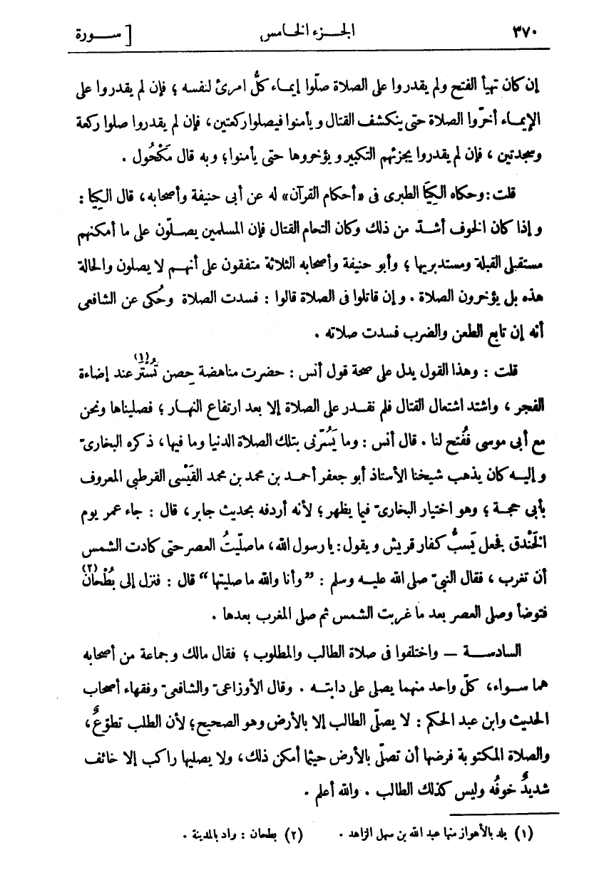 إِنْ كَانَ تَهَيَّأَ الْفَتْحُ وَلَمْ يَقْدِرُوا عَلَى الصَّلَاةِ صَلَّوْا إِيمَاءً كُلُّ امْرِئٍ لِنَفْسِهِ، فَإِنْ لَمْ يَقْدِرُوا عَلَى الْإِيمَاءِ أَخَّرُوا الصَّلَاةَ حَتَّى يَنْكَشِفَ الْقِتَالُ وَيَأْمَنُوا فَيُصَلُّوا رَكْعَتَيْنِ، فَإِنْ لَمْ يَقْدِرُوا صَلَّوْا رَكْعَةً وَسَجْدَتَيْنِ، فَإِنْ لَمْ يَقْدِرُوا يُجْزِئُهُمُ التَّكْبِيرُ وَيُؤَخِّرُوهَا حَتَّى يَأْمَنُوا، وَبِهِ قَالَ مَكْحُولٌ. قُلْتُ: وَحَكَاهُ الْكِيَا الطَّبَرِيُّ فِي (أَحْكَامِ الْقُرْآنِ) لَهُ عَنْ أَبِي حَنِيفَةَ وَأَصْحَابِهِ، قَالَ الْكِيَا: وَإِذَا كَانَ الْخَوْفُ أَشَدَّ مِنْ ذَلِكَ وَكَانَ الْتِحَامُ الْقِتَالِ فَإِنَّ الْمُسْلِمِينَ يُصَلُّونَ عَلَى مَا أَمْكَنَهُمْ مُسْتَقْبِلِي الْقِبْلَةِ وَمُسْتَدْبِرِيهَا، وَأَبُو حَنِيفَةَ وَأَصْحَابُهُ الثَّلَاثَةُ مُتَّفِقُونَ عَلَى أَنَّهُمْ لَا يُصَلُّونَ وَالْحَالَةُ هَذِهِ بَلْ يُؤَخِّرُونَ الصَّلَاةَ. وَإِنْ قَاتَلُوا فِي الصَّلَاةِ قَالُوا: فَسَدَتِ الصَّلَاةُ وَحُكِيَ عَنِ الشَّافِعِيِّ أَنَّهُ إِنْ تَابَعَ الطَّعْنَ وَالضَّرْبَ فَسَدَتْ صَلَاتُهُ. قُلْتُ: وَهَذَا الْقَوْلُ يَدُلُّ عَلَى صِحَّةِ قَوْلِ أَنَسٍ: حَضَرْتُ مُنَاهَضَةَ حِصْنِ تُسْتَرَ «١» عِنْدَ إِضَاءَةِ الْفَجْرِ، وَاشْتَدَّ اشْتِعَالُ الْقِتَالِ فَلَمْ نَقْدِرْ عَلَى الصَّلَاةِ إِلَّا بَعْدَ ارْتِفَاعِ النَّهَارِ، فَصَلَّيْنَاهَا وَنَحْنُ مَعَ أَبِي مُوسَى فَفُتِحَ لَنَا. قَالَ أَنَسٌ: وَمَا يَسُرُّنِي بِتِلْكَ الصَّلَاةِ الدُّنْيَا وَمَا فِيهَا، ذَكَرَهُ الْبُخَارِيُّ وَإِلَيْهِ كَانَ يَذْهَبُ شَيْخُنَا الْأُسْتَاذُ أَبُو جَعْفَرٍ أَحْمَدُ بْنُ مُحَمَّدِ بْنِ مُحَمَّدِ الْقَيْسِيُّ الْقُرْطُبِيُّ الْمَعْرُوفُ بِأَبِي حِجَّةَ، وَهُوَ اخْتِيَارُ الْبُخَارِيِّ فِيمَا يَظْهَرُ، لِأَنَّهُ أَرْدَفَهُ بِحَدِيثِ جَابِرٍ، قَالَ: جَاءَ عُمَرُ يَوْمَ الْخَنْدَقِ فَجَعَلَ يَسُبُّ كُفَّارَ قُرَيْشٍ وَيَقُولُ: يَا رَسُولَ اللَّهِ، مَا صَلَّيْتُ الْعَصْرَ حَتَّى كَادَتِ الشَّمْسُ أَنْ تَغْرُبَ، فَقَالَ النَّبِيُّ صَلَّى اللَّهُ عَلَيْهِ وَسَلَّمَ: (وَأَنَا وَاللَّهِ مَا صَلَّيْتُهَا) قَالَ: فَنَزَلَ إِلَى بُطْحَانَ «٢» فَتَوَضَّأَ وَصَلَّى الْعَصْرَ بَعْدَ مَا غَرَبَتِ الشَّمْسُ ثُمَّ صَلَّى الْمَغْرِبَ بَعْدَهَا. السَّادِسَةُ- وَاخْتَلَفُوا فِي صَلَاةِ الطَّالِبِ وَالْمَطْلُوبِ، فَقَالَ مَالِكٌ وَجَمَاعَةٌ مِنْ أَصْحَابِهِ هُمَا سَوَاءٌ، كُلُّ وَاحِدٍ مِنْهُمَا يُصَلِّي عَلَى دَابَّتِهِ. وَقَالَ الْأَوْزَاعِيُّ وَالشَّافِعِيُّ وَفُقَهَاءُ أَصْحَابِ الْحَدِيثِ وَابْنُ عَبْدِ الْحَكَمِ: لَا يُصَلِّي الطَّالِبُ إِلَّا بِالْأَرْضِ وَهُوَ الصَّحِيحُ، لِأَنَّ الطَّلَبَ تَطَوُّعٌ، وَالصَّلَاةُ الْمَكْتُوبَةُ فَرْضُهَا أَنْ تُصَلَّى بِالْأَرْضِ حَيْثُمَا أَمْكَنَ ذَلِكَ، وَلَا يُصَلِّيَهَا رَاكِبٌ إِلَّا خَائِفٌ شَدِيدٌ خَوْفُهُ وَلَيْسَ كَذَلِكَ الطَّالِبُ. وَاللَّهُ أعلم.