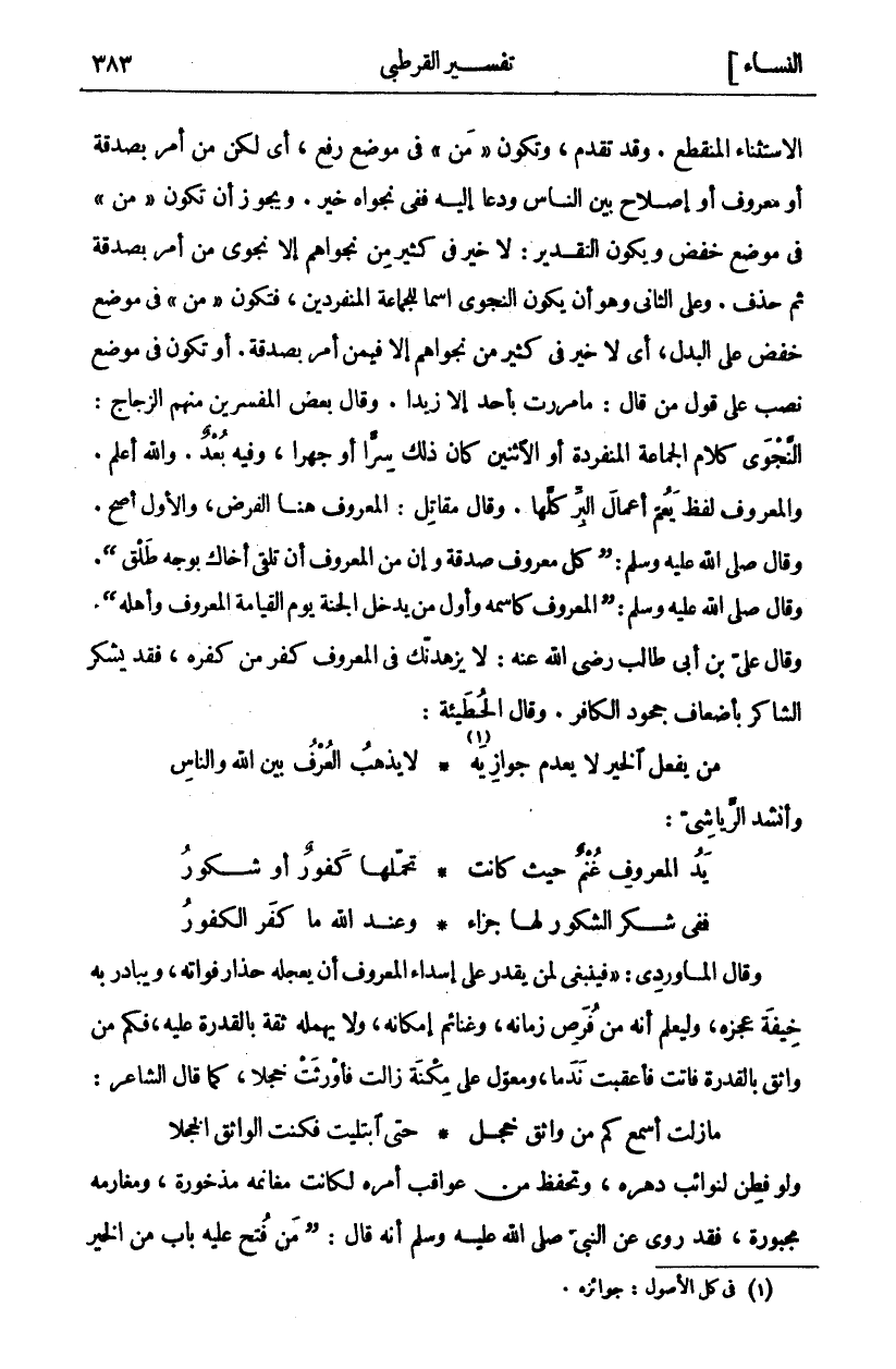 الِاسْتِثْنَاءُ الْمُنْقَطِعُ. وَقَدْ تَقَدَّمَ، وَتَكُونُ (مَنْ) فِي مَوْضِعِ رَفْعٍ، أَيْ لَكِنْ مَنْ أَمَرَ بِصَدَقَةٍ أَوْ مَعْرُوفٍ أَوْ إِصْلَاحٍ بَيْنَ النَّاسِ وَدَعَا إِلَيْهِ فَفِي نَجْوَاهُ خَيْرٌ. وَيَجُوزُ أَنْ تَكُونَ (مَنْ) فِي مَوْضِعِ خَفْضٍ وَيَكُونُ التَّقْدِيرُ: لَا خَيْرَ فِي كَثِيرٍ مِنْ نَجْوَاهُمْ إِلَّا نَجْوَى مَنْ أَمَرَ بِصَدَقَةٍ ثُمَّ حُذِفَ. وَعَلَى الثَّانِي وَهُوَ أَنْ يَكُونَ النَّجْوَى اسْمًا لِلْجَمَاعَةِ الْمُنْفَرِدِينَ، فَتَكُونُ (مَنْ) فِي مَوْضِعِ خَفْضٍ عَلَى الْبَدَلِ، أَيْ لَا خَيْرَ فِي كَثِيرٍ مِنْ نَجْوَاهُمْ إِلَّا فِيمَنْ أَمَرَ بِصَدَقَةٍ. أَوْ تَكُونُ فِي مَوْضِعِ نَصْبٍ عَلَى قَوْلِ مَنْ قَالَ: مَا مَرَرْتُ بِأَحَدٍ إِلَّا زَيْدًا. وَقَالَ بَعْضُ الْمُفَسِّرِينَ مِنْهُمُ الزَّجَّاجُ: النَّجْوَى كَلَامُ الْجَمَاعَةِ الْمُنْفَرِدَةِ أَوِ الِاثْنَيْنِ كَانَ ذَلِكَ سِرًّا أَوْ جَهْرًا، وَفِيهِ بُعْدٌ. وَاللَّهُ أَعْلَمُ. وَالْمَعْرُوفُ لَفْظٌ يَعُمُّ أَعْمَالَ الْبِرِّ كُلَّهَا. وَقَالَ مُقَاتِلٌ: الْمَعْرُوفُ هُنَا الْفَرْضُ، وَالْأَوَّلُ أَصَحُّ. وَقَالَ صَلَّى اللَّهُ عَلَيْهِ وَسَلَّمَ: (كُلُّ مَعْرُوفٍ صَدَقَةٌ وَإِنَّ مِنَ الْمَعْرُوفِ أَنْ تَلْقَى أَخَاكَ بِوَجْهٍ طَلْقٍ). وَقَالَ صَلَّى اللَّهُ عَلَيْهِ وَسَلَّمَ: (الْمَعْرُوفُ كَاسْمِهِ وَأَوَّلُ مَنْ يَدْخُلُ الْجَنَّةَ يَوْمَ الْقِيَامَةِ الْمَعْرُوفُ وَأَهْلُهُ). وَقَالَ عَلِيُّ بْنُ أَبِي طَالِبٍ رَضِيَ اللَّهُ عَنْهُ: لَا يُزَهِّدَنَّكَ فِي الْمَعْرُوفِ كُفْرُ مَنْ كَفَرَهُ، فَقَدْ يَشْكُرُ الشَّاكِرُ بِأَضْعَافِ جُحُودِ الْكَافِرِ. وَقَالَ الْحُطَيْئَةُ: