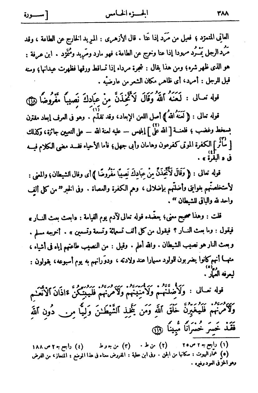 لَعَنَهُ اللَّهُ وَقالَ لَأَتَّخِذَنَّ مِنْ عِبادِكَ نَصِيباً مَفْرُوضاً (١١٨)