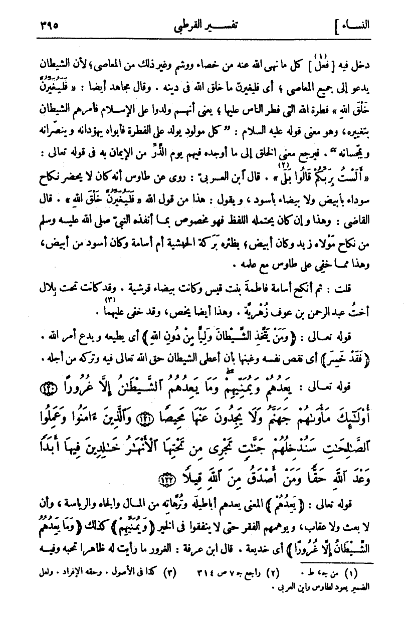 دَخَلَ فِيهِ [فِعْلُ «١»] كُلِّ مَا نَهَى اللَّهُ عَنْهُ مِنْ خِصَاءٍ وَوَشْمٍ وَغَيْرِ ذَلِكَ مِنَ الْمَعَاصِي، لِأَنَّ الشَّيْطَانَ يَدْعُو إِلَى جَمِيعِ الْمَعَاصِي، أَيْ فَلَيُغَيِّرُنَّ مَا خَلَقَ اللَّهُ فِي دِينِهِ. وَقَالَ مُجَاهِدٌ أَيْضًا: (فَلَيُغَيِّرُنَّ خَلْقَ اللَّهِ) فِطْرَةَ اللَّهِ الَّتِي فَطَرَ النَّاسَ عَلَيْهَا، يَعْنِي أَنَّهُمْ وُلِدُوا عَلَى الْإِسْلَامِ فَأَمَرَهُمُ الشَّيْطَانُ بِتَغْيِيرِهِ، وَهُوَ مَعْنَى قَوْلِهِ عَلَيْهِ السَّلَامُ: (كُلُّ مَوْلُودٍ يُولَدُ عَلَى الْفِطْرَةِ فَأَبَوَاهُ يُهَوِّدَانِهِ وَيُنَصِّرَانِهِ وَيُمَجِّسَانِهِ). فَيَرْجِعُ مَعْنَى الْخَلْقِ إِلَى مَا أَوْجَدَهُ فِيهِمْ يَوْمَ الذَّرِّ مِنَ الْإِيمَانِ بِهِ فِي قَوْلِهِ تَعَالَى: (أَلَسْتُ بِرَبِّكُمْ قالُوا بَلى «٢»). قَالَ ابْنُ الْعَرَبِيِّ: رُوِيَ عَنْ طَاوُسٍ أَنَّهُ كَانَ لَا يَحْضُرُ نِكَاحَ سَوْدَاءَ بِأَبْيَضَ وَلَا بَيْضَاءَ بِأَسْوَدَ، وَيَقُولُ: هَذَا مِنْ قَوْلِ اللَّهِ (فَلَيُغَيِّرُنَّ خَلْقَ اللَّهِ). قَالَ الْقَاضِي: وَهَذَا وَإِنْ كَانَ يَحْتَمِلُهُ اللَّفْظُ فَهُوَ مَخْصُوصٌ بِمَا أَنْفَذَهُ النَّبِيُّ صَلَّى اللَّهُ عَلَيْهِ وَسَلَّمَ مِنْ نِكَاحِ مَوْلَاهُ زَيْدٍ وَكَانَ أَبْيَضَ، بِظِئْرِهِ بَرَكَةَ الْحَبَشِيَّةِ أُمِّ أُسَامَةَ وَكَانَ أَسْوَدَ مِنْ أَبْيَضَ، وَهَذَا مِمَّا خَفِيَ عَلَى طَاوُسٍ مَعَ عِلْمِهِ. قُلْتُ: ثُمَّ أَنْكَحَ أُسَامَةَ فَاطِمَةَ بِنْتَ قَيْسٍ وَكَانَتْ بَيْضَاءَ قُرَشِيَّةً. وَقَدْ كَانَتْ تَحْتَ بِلَالٍ أُخْتُ عَبْدِ الرَّحْمَنِ بْنِ عَوْفٍ زُهْرِيَّةُ. وَهَذَا أَيْضًا يَخُصُّ، وَقَدْ خَفِيَ عليهما «٣».