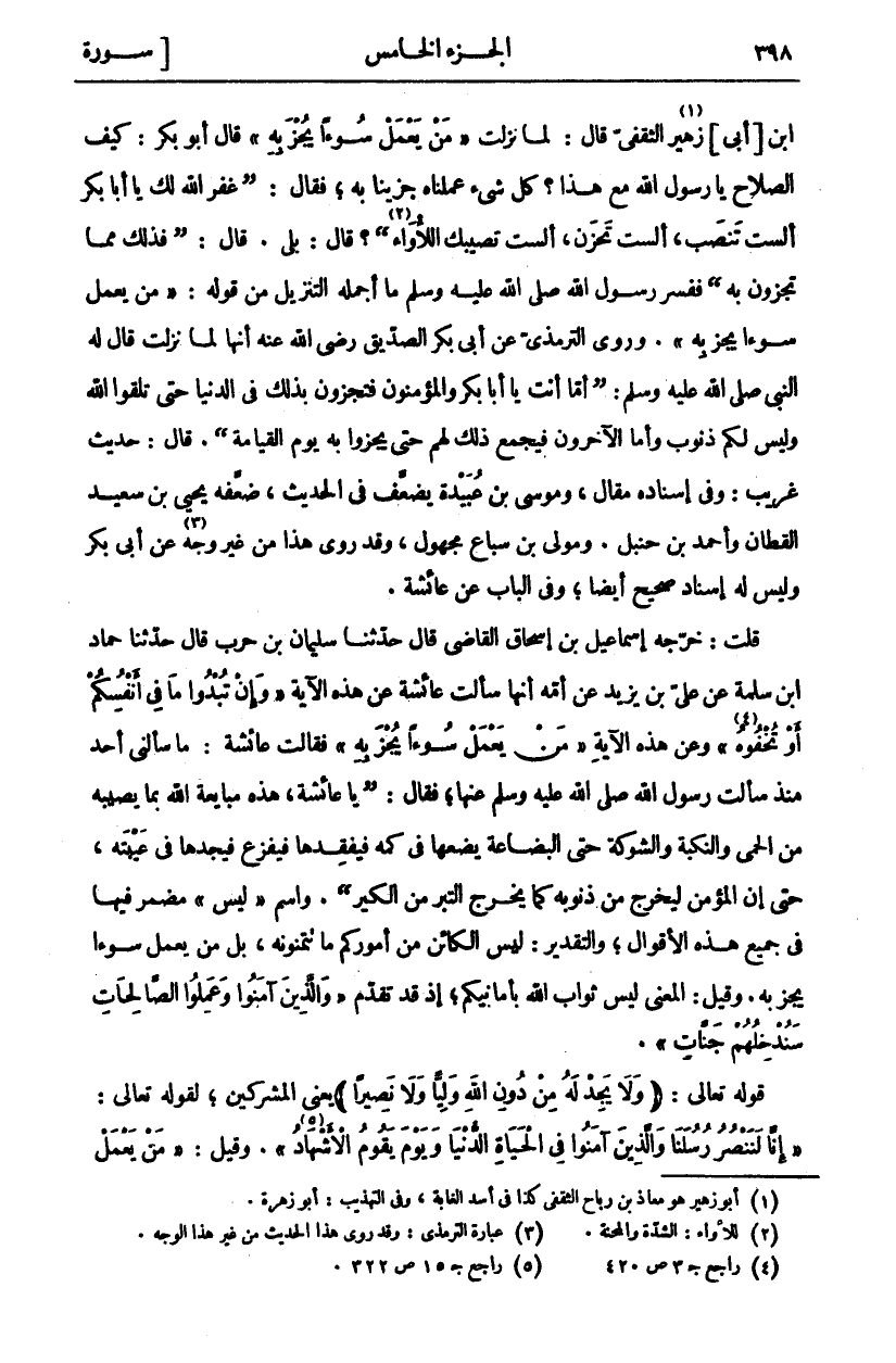 ابن [أَبِي] زُهَيْرٍ «١» الثَّقَفِيِّ قَالَ: لَمَّا نَزَلَتْ (مَنْ يَعْمَلْ سُوءاً يُجْزَ بِهِ) قَالَ أَبُو بَكْرٍ: كَيْفَ الصَّلَاحُ يَا رَسُولَ اللَّهِ مَعَ هَذَا؟ كل شي عَمِلْنَاهُ جُزِينَا بِهِ، فَقَالَ: (غَفَرَ اللَّهُ لَكَ يَا أَبَا بَكْرٍ أَلَسْتَ تَنْصَبُ، أَلَسْتَ تَحْزَنُ، أَلَسْتَ تُصِيبُكَ اللَّأْوَاءُ «٢»)؟ قَالَ: بَلَى. قَالَ (فَذَلِكَ مِمَّا تُجْزَوْنَ بِهِ) فَفَسَّرَ رَسُولُ اللَّهِ صَلَّى اللَّهُ عَلَيْهِ وَسَلَّمَ مَا أَجْمَلَهُ التَّنْزِيلُ مِنْ قَوْلِهِ: مَنْ يَعْمَلْ سُوءاً يُجْزَ بِهِ (. وَرَوَى التِّرْمِذِيُّ عَنْ أَبِي بَكْرٍ الصِّدِّيقِ رَضِيَ اللَّهُ عَنْهُ أَنَّهَا لَمَّا نَزَلَتْ قَالَ لَهُ النَّبِيُّ صَلَّى اللَّهُ عَلَيْهِ وَسَلَّمَ:) أَمَّا أَنْتَ يَا أَبَا بَكْرٍ وَالْمُؤْمِنُونَ فَتُجْزَوْنَ بِذَلِكَ فِي الدُّنْيَا حَتَّى تَلْقَوُا اللَّهَ وَلَيْسَ لَكُمْ ذُنُوبٌ وَأَمَّا الْآخَرُونَ فَيُجْمَعُ ذَلِكَ لَهُمْ حَتَّى يُجْزَوْا بِهِ يَوْمَ الْقِيَامَةِ (. قَالَ: حَدِيثٌ غَرِيبٌ: وَفِي إِسْنَادِهِ مَقَالٌ، وَمُوسَى بْنُ عُبَيْدَةَ يُضَعَّفُ فِي الْحَدِيثِ، ضَعَّفَهُ يَحْيَى بْنُ سَعِيدٍ الْقَطَّانُ وَأَحْمَدُ بْنُ حنبل. ومولى بن سِبَاعٍ مَجْهُولٌ، وَقَدْ رُوِيَ هَذَا مِنْ غَيْرِ وَجْهٍ «٣» عَنْ أَبِي بَكْرٍ وَلَيْسَ لَهُ إِسْنَادٌ صَحِيحٌ أَيْضًا، وَفِي الْبَابِ عَنْ عَائِشَةَ. قُلْتُ: خَرَّجَهُ إِسْمَاعِيلُ بْنُ إِسْحَاقَ الْقَاضِي قَالَ حَدَّثَنَا سُلَيْمَانُ بن حرب قال حدثنا حماد ابن سَلَمَةَ عَنْ عَلِيِّ بْنِ يَزِيدَ عَنْ أُمِّهِ أَنَّهَا سَأَلَتْ عَائِشَةَ عَنْ هَذِهِ الْآيَةِ (وَإِنْ تُبْدُوا مَا فِي أَنْفُسِكُمْ أَوْ تُخْفُوهُ «٤») وَعَنْ هَذِهِ الْآيَةِ (مَنْ يَعْمَلْ سُوءاً يُجْزَ بِهِ) فَقَالَتْ عَائِشَةُ: مَا سَأَلَنِي أَحَدٌ مُنْذُ سَأَلْتُ رَسُولَ اللَّهِ صَلَّى اللَّهُ عَلَيْهِ وَسَلَّمَ عَنْهَا، فَقَالَ: (يَا عَائِشَةُ، هَذِهِ مُبَايَعَةُ اللَّهِ بِمَا يُصِيبُهُ مِنَ الْحُمَّى وَالنَّكْبَةِ وَالشَّوْكَةِ حَتَّى الْبِضَاعَةِ يَضَعُهَا فِي كُمِّهِ فَيَفْقِدُهَا فَيَفْزَعُ فَيَجِدُهَا فِي عَيْبَتِهِ، حَتَّى إِنَّ الْمُؤْمِنَ لَيَخْرُجُ مِنْ ذُنُوبِهِ كَمَا يَخْرُجُ التِّبْرُ مِنَ الْكِيرِ (. وَاسْمُ (لَيْسَ) مُضْمَرٌ فِيهَا فِي جَمِيعِ هَذِهِ الْأَقْوَالِ، وَالتَّقْدِيرُ: لَيْسَ الْكَائِنُ مِنْ أُمُورِكُمْ مَا تَتَمَنَّوْنَهُ، بَلْ مَنْ يَعْمَلْ سُوءًا يُجْزَ بِهِ. وَقِيلَ: الْمَعْنَى لَيْسَ ثَوَابُ اللَّهِ بِأَمَانِيِّكُمْ، إِذْ قَدْ تَقَدَّمَ (وَالَّذِينَ آمَنُوا وَعَمِلُوا الصَّالِحاتِ سَنُدْخِلُهُمْ جَنَّاتٍ). قَوْلُهُ تَعَالَى: (وَلا يَجِدْ لَهُ مِنْ دُونِ اللَّهِ وَلِيًّا وَلا نَصِيراً) يَعْنِي الْمُشْرِكِينَ، لِقَوْلِهِ تَعَالَى: (إِنَّا لَنَنْصُرُ رُسُلَنا وَالَّذِينَ آمَنُوا فِي الْحَياةِ الدُّنْيا وَيَوْمَ يَقُومُ الْأَشْهادُ «٥») وقيل: