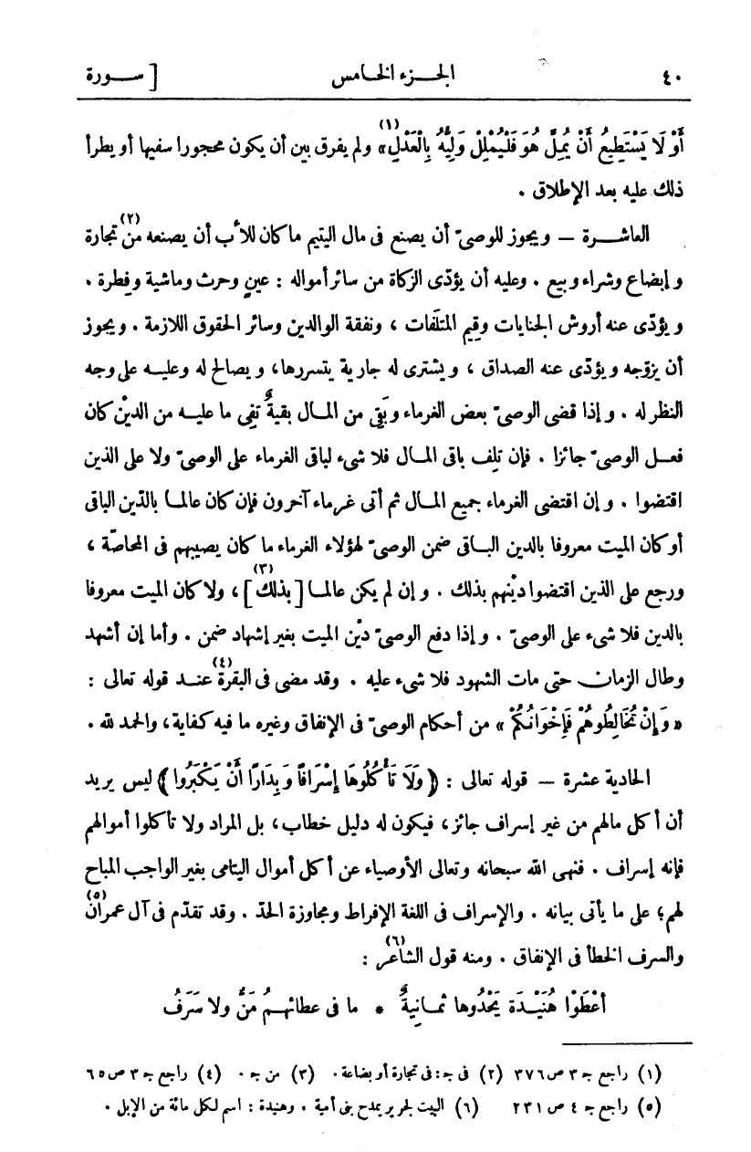 أَوْ لَا يَسْتَطِيعُ أَنْ يُمِلَّ هُوَ فَلْيُمْلِلْ وَلِيُّهُ بِالْعَدْلِ «١» (وَلَمْ يُفَرِّقْ بَيْنَ أَنْ يَكُونَ مَحْجُورًا سَفِيهًا أَوْ يَطْرَأُ ذَلِكَ عَلَيْهِ بَعْدَ الْإِطْلَاقِ. الْعَاشِرَةُ- وَيَجُوزُ لِلْوَصِيِّ أَنْ يَصْنَعَ فِي مال اليتيم ما كان للأب أن يصنعه مِنْ «٢» تِجَارَةٍ وَإِبْضَاعٍ وَشِرَاءٍ وَبَيْعٍ. وَعَلَيْهِ أَنْ يُؤَدِّيَ الزَّكَاةَ مِنْ سَائِرِ أَمْوَالِهِ: عَيْنٍ وَحَرْثٍ وَمَاشِيَةٍ وَفِطْرَةٍ. وَيُؤَدِّي عَنْهُ أُرُوشَ الْجِنَايَاتِ وَقِيَمَ الْمُتْلَفَاتِ، وَنَفَقَةَ الْوَالِدَيْنِ وَسَائِرَ الْحُقُوقِ اللَّازِمَةِ. وَيَجُوزُ أَنْ يُزَوِّجَهُ وَيُؤَدِّيَ عَنْهُ الصَّدَاقَ، وَيَشْتَرِيَ لَهُ جَارِيَةً يَتَسَرَّرُهَا، وَيُصَالِحُ لَهُ وَعَلَيْهِ عَلَى وَجْهِ النَّظَرِ لَهُ. وَإِذَا قَضَى الْوَصِيُّ بَعْضَ الْغُرَمَاءِ وَبَقِيَ مِنَ الْمَالِ بَقِيَّةٌ تَفِي مَا عَلَيْهِ مِنَ الدَّيْنِ كَانَ فِعْلُ الْوَصِيِّ جَائِزًا. فَإِنْ تلف باقي المال فلا شي لِبَاقِي الْغُرَمَاءِ عَلَى الْوَصِيِّ وَلَا عَلَى الَّذِينَ اقْتَضَوْا. وَإِنِ اقْتَضَى الْغُرَمَاءُ جَمِيعَ الْمَالِ ثُمَّ أَتَى غُرَمَاءُ آخَرُونَ فَإِنْ كَانَ عَالِمًا بِالدَّيْنِ الْبَاقِي أَوْ كَانَ الْمَيِّتُ مَعْرُوفًا بِالدَّيْنِ الْبَاقِي ضَمِنَ الْوَصِيُّ لِهَؤُلَاءِ الْغُرَمَاءِ مَا كَانَ يُصِيبُهُمْ فِي الْمُحَاصَّةِ، وَرَجَعَ عَلَى الَّذِينَ اقْتَضَوْا دَيْنَهُمْ بِذَلِكَ. وَإِنْ لَمْ يَكُنْ عَالِمًا [بِذَلِكَ «٣»]، وَلَا كان الميت معروفا بالدين فلا شي عَلَى الْوَصِيِّ. وَإِذَا دَفَعَ الْوَصِيُّ دَيْنَ الْمَيِّتِ بِغَيْرِ إِشْهَادٍ ضَمِنَ. وَأَمَّا إِنْ أَشْهَدَ وَطَالَ الزمان حتى مات الشهود فلا شي عَلَيْهِ. وَقَدْ مَضَى فِي الْبَقَرَةِ «٤» عِنْدَ قَوْلِهِ تَعَالَى: (وَإِنْ تُخالِطُوهُمْ فَإِخْوانُكُمْ) مِنْ أَحْكَامِ الْوَصِيِّ فِي الْإِنْفَاقِ وَغَيْرِهِ مَا فِيهِ كِفَايَةٌ، وَالْحَمْدُ لِلَّهِ. الْحَادِيَةُ عَشْرَةَ- قَوْلُهُ تَعَالَى: (وَلا تَأْكُلُوها إِسْرافاً وَبِداراً أَنْ يَكْبَرُوا) لَيْسَ يُرِيدُ أَنَّ أَكْلَ مَالِهِمْ مِنْ غَيْرِ إِسْرَافٍ جَائِزٌ، فَيَكُونُ لَهُ دَلِيلُ خِطَابٍ، بَلِ الْمُرَادُ وَلَا تَأْكُلُوا أَمْوَالَهُمْ فَإِنَّهُ إِسْرَافٌ. فَنَهَى اللَّهُ سُبْحَانَهُ وَتَعَالَى الْأَوْصِيَاءَ عَنْ أَكْلِ أَمْوَالِ الْيَتَامَى بِغَيْرِ الْوَاجِبِ الْمُبَاحِ لَهُمْ، عَلَى مَا يَأْتِي بَيَانُهُ. وَالْإِسْرَافُ فِي اللُّغَةِ الْإِفْرَاطُ وَمُجَاوَزَةُ الْحَدِّ. وَقَدْ تَقَدَّمَ فِي آلِ عِمْرَانَ «٥» وَالسَّرَفُ الْخَطَأُ فِي الْإِنْفَاقِ. وَمِنْهُ قَوْلُ الشَّاعِرِ «٦»: