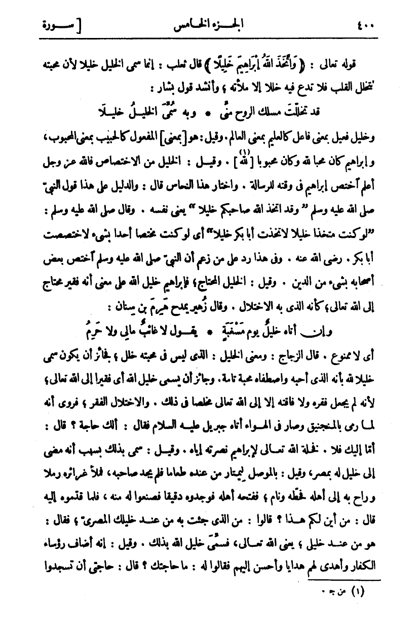أَيْ لَا مَمْنُوعٌ. قَالَ الزَّجَّاجُ: وَمَعْنَى الْخَلِيلِ: الَّذِي لَيْسَ فِي مَحَبَّتِهِ خَلَلٌ، فَجَائِزٌ أَنْ يَكُونَ سُمِّيَ خَلِيلًا لِلَّهِ بِأَنَّهُ الَّذِي أَحَبَّهُ وَاصْطَفَاهُ مَحَبَّةً تَامَّةً. وَجَائِزٌ أَنْ يُسَمَّى خَلِيلَ اللَّهِ أَيْ فَقِيرًا إِلَى اللَّهِ تَعَالَى، لِأَنَّهُ لَمْ يَجْعَلْ فَقْرَهُ وَلَا فَاقَتَهُ إِلَّا إِلَى اللَّهِ تَعَالَى مُخْلِصًا فِي ذَلِكَ. وَالِاخْتِلَالُ الْفَقْرُ، فَرُوِيَ أَنَّهُ لَمَّا رُمِيَ بِالْمَنْجَنِيقِ وَصَارَ فِي الْهَوَاءِ أَتَاهُ جِبْرِيلُ عَلَيْهِ السَّلَامُ فَقَالَ: أَلَكَ حَاجَةٌ؟ قَالَ: أَمَّا إِلَيْكَ فَلَا. فَخَلَّةُ اللَّهِ تَعَالَى لِإِبْرَاهِيمَ نُصْرَتُهُ إِيَّاهُ. وَقِيلَ: سُمِّيَ بِذَلِكَ بِسَبَبِ أَنَّهُ مَضَى إِلَى خَلِيلٍ لَهُ بِمِصْرَ، وَقِيلَ: بِالْمَوْصِلِ لِيَمْتَارَ مِنْ عِنْدِهِ طَعَامًا فَلَمْ يَجِدْ صَاحِبَهُ، فَمَلَأَ غَرَائِرَهُ رَمْلًا وَرَاحَ بِهِ إِلَى أَهْلِهِ فَحَطَّهُ وَنَامَ، فَفَتَحَهُ أَهْلُهُ فَوَجَدُوهُ دَقِيقًا فَصَنَعُوا لَهُ مِنْهُ، فَلَمَّا قَدَّمُوهُ إِلَيْهِ قَالَ: مِنْ أَيْنَ لَكُمْ هَذَا؟ قَالُوا: مِنَ الَّذِي جِئْتَ بِهِ مِنْ عِنْدِ خَلِيلِكَ الْمِصْرِيِّ، فَقَالَ: هُوَ مِنْ عِنْدِ خَلِيلِي، يَعْنِي اللَّهَ تَعَالَى، فَسُمِّيَ خَلِيلَ اللَّهِ بِذَلِكَ. وَقِيلَ: إِنَّهُ أَضَافَ رُؤَسَاءَ الْكُفَّارِ وَأَهْدَى لَهُمْ هَدَايَا وَأَحْسَنَ إِلَيْهِمْ فَقَالُوا لَهُ: مَا حَاجَتُكَ؟ قال: حاجتي أن تسجدوا