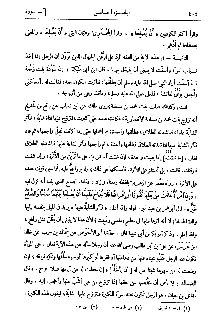 وَقَرَأَ أَكْثَرُ الْكُوفِيِّينَ (أَنْ يُصْلِحا). وَقَرَأَ الْجَحْدَرِيُّ وَعُثْمَانُ الْبَتِّيُّ (أَنْ يَصَّلِحَا) وَالْمَعْنَى يَصْطَلِحَا ثُمَّ أُدْغِمَ. الثَّانِيةُ- فِي هَذِهِ الْآيَةِ مِنَ الْفِقْهِ الرَّدُّ عَلَى الرُّعْنِ الْجُهَّالِ الَّذِينَ يَرَوْنَ أَنَّ الرَّجُلَ إِذَا أَخَذَ شَبَابَ الْمَرْأَةِ وَأَسَنَّتْ لَا يَنْبَغِي أَنْ يَتَبَدَّلَ بِهَا. قَالَ ابْنُ أَبِي مُلَيْكَةَ: إِنَّ سَوْدَةَ بِنْتَ زَمْعَةَ لَمَّا أَسَنَّتْ أَرَادَ النَّبِيُّ صَلَّى اللَّهُ عَلَيْهِ وَسَلَّمَ أَنْ يُطَلِّقَهَا، فَآثَرَتِ الْكَوْنَ مَعَهُ، فَقَالَتْ لَهُ: أَمْسِكْنِي وَاجْعَلْ يَوْمِي «١» لِعَائِشَةَ، فَفَعَلَ صَلَّى اللَّهُ عَلَيْهِ وَسَلَّمَ، وَمَاتَتْ وَهِيَ مِنْ أَزْوَاجِهِ. قُلْتُ: وَكَذَلِكَ فَعَلَتْ بِنْتُ مُحَمَّدِ بْنِ مَسْلَمَةَ، رَوَى مَالِكٌ عَنِ ابْنِ شِهَابٍ عَنْ رَافِعِ بْنِ خَدِيجٍ أَنَّهُ تَزَوَّجَ بِنْتَ مُحَمَّدِ بْنِ مَسْلَمَةَ الْأَنْصَارِيَّةَ، فَكَانَتْ عِنْدَهُ حَتَّى كَبِرَتْ، فَتَزَوَّجَ عَلَيْهَا فَتَاةً شَابَّةً، فَآثَرَ الشَّابَّةَ عَلَيْهَا، فَنَاشَدَتْهُ الطَّلَاقَ، فَطَلَّقَهَا وَاحِدَةً، ثُمَّ أَهْمَلَهَا حَتَّى إِذَا كَانَتْ تَحِلُّ رَاجَعَهَا، ثُمَّ عَادَ فَآثَرَ الشَّابَّةَ عَلَيْهَا فَنَاشَدَتْهُ الطَّلَاقَ فَطَلَّقَهَا وَاحِدَةً، ثُمَّ رَاجَعَهَا فَآثَرَ الشَّابَّةَ عَلَيْهَا فَنَاشَدَتْهُ الطَّلَاقَ فَقَالَ: [مَا شِئْتِ «٢» [إِنَّمَا بَقِيَتْ وَاحِدَةٌ، فَإِنْ شِئْتِ اسْتَقْرَرْتِ عَلَى مَا تَرَيْنَ مِنَ الْأَثَرَةِ، وَإِنْ شِئْتِ فَارَقْتُكِ. قَالَتْ: بَلْ أَسْتَقِرُّ عَلَى الْأَثَرَةِ. فَأَمْسَكَهَا عَلَى ذَلِكَ، وَلَمْ يَرَ رَافِعٌ عَلَيْهِ إِثْمًا حِينَ قَرَّتْ عِنْدَهُ عَلَى الْأَثَرَةِ. رَوَاهُ مَعْمَرٌ عَنِ الزُّهْرِيِّ بِلَفْظِهِ وَمَعْنَاهُ وَزَادَ: فَذَلِكَ الصُّلْحُ الَّذِي بَلَغَنَا أَنَّهُ نَزَلَ فِيهِ (وَإِنِ امْرَأَةٌ خافَتْ مِنْ بَعْلِها نُشُوزاً أَوْ إِعْراضاً فَلا جُناحَ عَلَيْهِما أَنْ يُصْلِحا بَيْنَهُما صُلْحاً وَالصُّلْحُ خَيْرٌ). قَالَ أَبُو عُمَرَ بْنُ عَبْدِ الْبَرِّ: قَوْلُهُ وَاللَّهُ أَعْلَمُ: (فَآثَرَ الشَّابَّةَ عَلَيْهَا) يُرِيدُ فِي الْمَيْلِ بِنَفْسِهِ إِلَيْهَا وَالنَّشَاطِ لَهَا، لَا أَنَّهُ آثَرَهَا عَلَيْهَا فِي مَطْعَمٍ وَمَلْبَسٍ وَمَبِيتٍ، لِأَنَّ هَذَا لَا يَنْبَغِي أَنْ يُظَنَّ بِمِثْلِ رَافِعٍ، وَاللَّهُ أَعْلَمُ. وَذَكَرَ أَبُو بَكْرِ بْنُ أَبِي شَيْبَةَ قَالَ: حَدَّثَنَا أَبُو الْأَحْوَصِ عَنْ سِمَاكِ بْنِ حرب عن خالد ابن عَرْعَرَةَ عَنْ عَلِيِّ بْنِ أَبِي طَالِبٍ رَضِيَ اللَّهُ عَنْهُ أَنَّ رَجُلًا سَأَلَهُ عَنْ هَذِهِ الْآيَةِ فَقَالَ: هِيَ الْمَرْأَةُ تَكُونُ عِنْدَ الرَّجُلِ فَتَنْبُو عَيْنَاهُ عَنْهَا مِنْ دَمَامَتِهَا أَوْ فَقْرِهَا أَوْ كِبَرِهَا أَوْ سُوءِ خُلُقِهَا وَتَكْرَهُ فِرَاقَهُ، فَإِنْ وَضَعَتْ لَهُ مِنْ مَهْرِهَا شَيْئًا حَلَّ لَهُ] أَنْ يَأْخُذَ «٣» [وَإِنْ جَعَلَتْ لَهُ مِنْ أَيَّامِهَا فَلَا حَرَجَ. وَقَالَ الضَّحَّاكُ: لَا بَأْسَ أَنْ يَنْقُصَهَا مِنْ حَقِّهَا إِذَا تَزَوَّجَ مَنْ هِيَ أَشَبُّ مِنْهَا وَأَعْجَبُ إِلَيْهِ. وَقَالَ مُقَاتِلُ بْنُ حَيَّانَ: هُوَ الرَّجُلُ تَكُونُ تَحْتَهُ الْمَرْأَةُ الْكَبِيرَةُ فَيَتَزَوَّجُ عَلَيْهَا الشَّابَّةَ، فَيَقُولُ لِهَذِهِ الْكَبِيرَةِ: