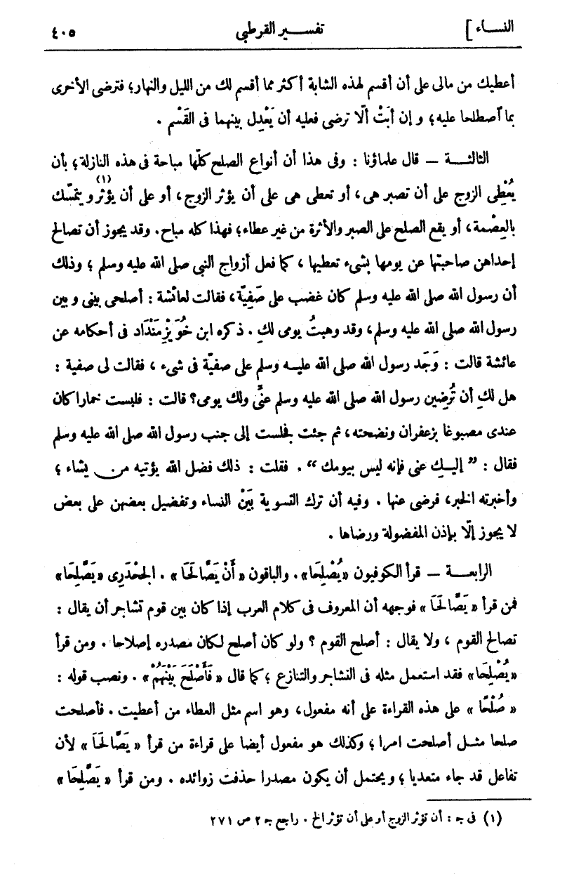 أُعْطِيكِ مِنْ مَالِي عَلَى أَنْ أَقْسِمَ لِهَذِهِ الشَّابَّةِ أَكْثَرَ مِمَّا أَقْسِمُ لَكِ مِنَ اللَّيْلِ وَالنَّهَارِ، فَتَرْضَى الْأُخْرَى بِمَا اصْطَلَحَا عَلَيْهِ، وَإِنْ أَبَتْ أَلَّا تَرْضَى فَعَلَيْهِ أَنْ يَعْدِلَ بَيْنَهُمَا فِي الْقَسْمِ. الثَّالِثَةُ- قَالَ عُلَمَاؤُنَا: وَفِي هَذَا أَنَّ أَنْوَاعَ الصُّلْحِ كُلَّهَا مُبَاحَةٌ فِي هَذِهِ النَّازِلَةِ، بِأَنْ يُعْطِيَ الزَّوْجُ عَلَى أَنْ تَصْبِرَ هِيَ، أَوْ تُعْطِيَ هِيَ عَلَى أَنْ يُؤْثِرَ الزَّوْجُ، أَوْ عَلَى أَنْ يُؤْثِرَ «١» وَيَتَمَسَّكَ بِالْعِصْمَةِ، أَوْ يَقَعَ الصُّلْحُ عَلَى الصَّبْرِ وَالْأَثَرَةِ مِنْ غَيْرِ عَطَاءٍ، فَهَذَا كُلُّهُ مُبَاحٌ. وَقَدْ يَجُوزُ أَنْ تُصَالِحَ إِحْدَاهُنَّ صَاحِبَتَهَا عَنْ يَوْمِهَا بِشَيْءٍ تُعْطِيهَا، كَمَا فَعَلَ أَزْوَاجُ النَّبِيِّ صَلَّى اللَّهُ عَلَيْهِ وَسَلَّمَ، وَذَلِكَ أَنَّ رَسُولَ اللَّهِ صَلَّى اللَّهُ عَلَيْهِ وَسَلَّمَ كَانَ غَضِبَ عَلَى صَفِيَّةَ، فَقَالَتْ لِعَائِشَةَ: أَصْلِحِي بَيْنِي وَبَيْنَ رَسُولِ اللَّهِ صَلَّى اللَّهُ عَلَيْهِ وَسَلَّمَ، وَقَدْ وَهَبْتُ يَوْمِي لَكِ. ذَكَرَهُ ابْنُ خُوَيْزِ مَنْدَادُ فِي أَحْكَامِهِ عَنْ عَائِشَةَ قَالَتْ: وَجَدَ رَسُولُ اللَّهِ صَلَّى اللَّهُ عَلَيْهِ وَسَلَّمَ عَلَى صفية في شي، فَقَالَتْ لِي صَفِيَّةُ: هَلْ لَكِ أَنْ تُرْضِينَ رَسُولَ اللَّهِ صَلَّى اللَّهُ عَلَيْهِ وَسَلَّمَ عَنِّي وَلَكِ يَوْمِي؟ قَالَتْ: فَلَبِسْتُ خِمَارًا كَانَ عِنْدِي مَصْبُوغًا بِزَعْفَرَانٍ وَنَضَحْتُهُ، ثُمَّ جِئْتُ فَجَلَسْتُ إِلَى جَنْبِ رَسُولِ اللَّهِ صَلَّى اللَّهُ عَلَيْهِ وَسَلَّمَ فَقَالَ: (إِلَيْكِ عَنِّي فَإِنَّهُ لَيْسَ بِيَوْمِكِ). فَقُلْتُ: ذَلِكَ فَضْلُ اللَّهِ يُؤْتِيهِ مَنْ يَشَاءُ، وَأَخْبَرْتُهُ الْخَبَرَ، فَرَضِيَ عَنْهَا. وَفِيهِ أَنَّ تَرْكَ التَّسْوِيَةِ بَيْنَ النِّسَاءِ وَتَفْضِيلِ بَعْضِهِنَّ عَلَى بَعْضٍ لَا يَجُوزُ إِلَّا بِإِذْنِ الْمَفْضُولَةِ وَرِضَاهَا. الرَّابِعَةُ- قَرَأَ الْكُوفِيُّونَ (يُصْلِحا). وَالْبَاقُونَ (أَنْ يَصَّالَحَا). الْجَحْدَرِيُّ (يَصَّلِحَا) فَمَنْ قَرَأَ (يَصَّالَحَا) فَوَجْهُهُ أَنَّ الْمَعْرُوفَ فِي كَلَامِ الْعَرَبِ إِذَا كَانَ بَيْنَ قَوْمٍ تَشَاجُرٌ أَنْ يُقَالَ: تَصَالَحَ الْقَوْمُ، وَلَا يُقَالُ: أَصْلَحَ الْقَوْمُ؟ وَلَوْ كَانَ أَصْلَحَ لَكَانَ مَصْدَرُهُ إِصْلَاحًا. وَمَنْ قَرَأَ (يُصْلِحا) فَقَدِ اسْتَعْمَلَ مِثْلَهُ فِي التَّشَاجُرِ وَالتَّنَازُعِ، كَمَا قَالَ (فَأَصْلَحَ بَيْنَهُمْ). وَنُصِبَ قوله: (يُصْلِحا) عَلَى هَذِهِ الْقِرَاءَةِ عَلَى أَنَّهُ مَفْعُولٌ، وَهُوَ اسْمٌ مِثْلُ الْعَطَاءِ مِنْ أَعْطَيْتُ. فَأَصْلَحْتُ صُلْحًا مِثْلُ أَصْلَحْتُ أَمْرًا، وَكَذَلِكَ هُوَ مَفْعُولٌ أَيْضًا عَلَى قِرَاءَةِ مَنْ قَرَأَ (يَصَّالَحَا) لِأَنَّ تَفَاعُلَ قَدْ جَاءَ مُتَعَدِّيًا، وَيَحْتَمِلُ أَنْ يَكُونَ مَصْدَرًا حذفت زوائده. ومن قرأ (يصلحا)