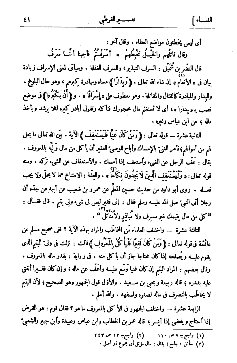 قَالَ النَّضْرُ بْنُ شُمَيْلٍ: السَّرَفُ التَّبْذِيرُ، وَالسَّرَفُ الْغَفْلَةُ. وَسَيَأْتِي لِمَعْنَى الْإِسْرَافِ زِيَادَةُ بَيَانٍ فِي (الْأَنْعَامِ «١») إِنْ شَاءَ اللَّهُ تَعَالَى. (وَبِداراً) مَعْنَاهُ وَمُبَادَرَةَ كِبَرِهِمْ، وَهُوَ حَالُ الْبُلُوغِ. وَالْبِدَارُ وَالْمُبَادَرَةُ كَالْقِتَالِ وَالْمُقَاتَلَةِ. وَهُوَ مَعْطُوفٌ عَلَى (إِسْرافاً) ". وَ (أَنْ يَكْبَرُوا) فِي مَوْضِعِ نَصْبٍ بِ (بِداراً)، أَيْ لَا تَسْتَغْنِمْ مَالَ مَحْجُورِكَ فَتَأْكُلَهُ وَتَقُولَ أُبَادِرُ كِبَرَهُ لِئَلَّا يَرْشُدَ وَيَأْخُذَ مَالَهُ، عَنِ ابْنِ عَبَّاسٍ وَغَيْرِهِ. الثَّانِيةُ عَشْرَةَ- قَوْلُهُ تَعَالَى: (وَمَنْ كانَ غَنِيًّا فَلْيَسْتَعْفِفْ) الْآيَةَ. بَيَّنَ اللَّهُ تَعَالَى مَا يَحِلُّ لَهُمْ مِنْ أَمْوَالِهِمْ، فَأَمَرَ الْغَنِيَّ بِالْإِمْسَاكِ وَأَبَاحَ لِلْوَصِيِّ الْفَقِيرِ أَنْ يَأْكُلَ مِنْ مَالِ وَلِيِّهِ بِالْمَعْرُوفِ. يُقَالُ: عَفَّ الرَّجُلُ عَنِ الشَّيْءِ وَاسْتَعَفَّ إِذَا أَمْسَكَ. وَالِاسْتِعْفَافُ عَنِ الشَّيْءِ تَرْكُهُ. وَمِنْهُ قَوْلُهُ تَعَالَى: (وَلْيَسْتَعْفِفِ الَّذِينَ لَا يَجِدُونَ نِكاحاً «٢»). وَالْعِفَّةُ: الِامْتِنَاعُ عَمَّا لَا يَحِلُّ وَلَا يَجِبُ فِعْلُهُ. رَوَى أَبُو دَاوُدَ مِنْ حَدِيثِ حُسَيْنٍ الْمُعَلِّمِ عَنْ عَمْرِو بْنِ شُعَيْبٍ عَنْ أَبِيهِ عَنْ جَدِّهِ أَنَّ رَجُلًا أَتَى النَّبِيَّ صَلَّى اللَّهُ عَلَيْهِ وَسَلَّمَ فَقَالَ: إِنِّي فقير ليس لي شي وَلِي يَتِيمٌ. قَالَ: فَقَالَ: (كُلْ مِنْ مَالِ يتيمك غير مسرف ولا مباذر وَلَا مُتَأَثِّلٍ «٣»). الثَّالِثَةُ عَشْرَةَ- وَاخْتَلَفَ الْعُلَمَاءُ مَنِ الْمُخَاطَبُ وَالْمُرَادُ بِهَذِهِ الْآيَةِ؟ فَفِي صَحِيحِ مُسْلِمٍ عَنْ عَائِشَةَ فِي قَوْلِهِ تَعَالَى: (وَمَنْ كانَ فَقِيراً فَلْيَأْكُلْ بِالْمَعْرُوفِ) قَالَتْ: نَزَلَتْ فِي وَلِيِّ الْيَتِيمِ الَّذِي يَقُومُ عَلَيْهِ وَيُصْلِحُهُ إِذَا كَانَ مُحْتَاجًا جَازَ أَنْ يَأْكُلَ مِنْهُ. فِي رِوَايَةٍ: بِقَدْرِ مَالِهِ بِالْمَعْرُوفِ. وَقَالَ بَعْضُهُمُ: الْمُرَادُ الْيَتِيمُ إِنْ كَانَ غَنِيًّا وَسَّعَ عَلَيْهِ وَأَعَفَّ عَنْ مَالِهِ، وَإِنْ كَانَ فَقِيرًا أَنْفَقَ عَلَيْهِ بِقَدْرِهِ، قاله رَبِيعَةُ وَيَحْيَى بْنُ سَعِيدٍ. وَالْأَوَّلُ قَوْلُ الْجُمْهُورِ وَهُوَ الصَّحِيحُ، لِأَنَّ الْيَتِيمَ لَا يُخَاطَبُ بِالتَّصَرُّفِ فِي مَالِهِ لِصِغَرِهِ وَلِسَفَهِهِ. وَاللَّهُ أَعْلَمُ. الرَّابِعَةُ عشرة- واختلف الجمهور في الا كل بِالْمَعْرُوفِ مَا هُوَ؟ فَقَالَ قَوْمٌ: هُوَ الْقَرْضُ إِذَا احْتَاجَ وَيَقْضِي إِذَا أَيْسَرَ، قَالَهُ عُمَرُ بْنُ الْخَطَّابِ وَابْنُ عَبَّاسٍ وَعُبَيْدَةُ وَابْنُ جُبَيْرٍ والشعبي