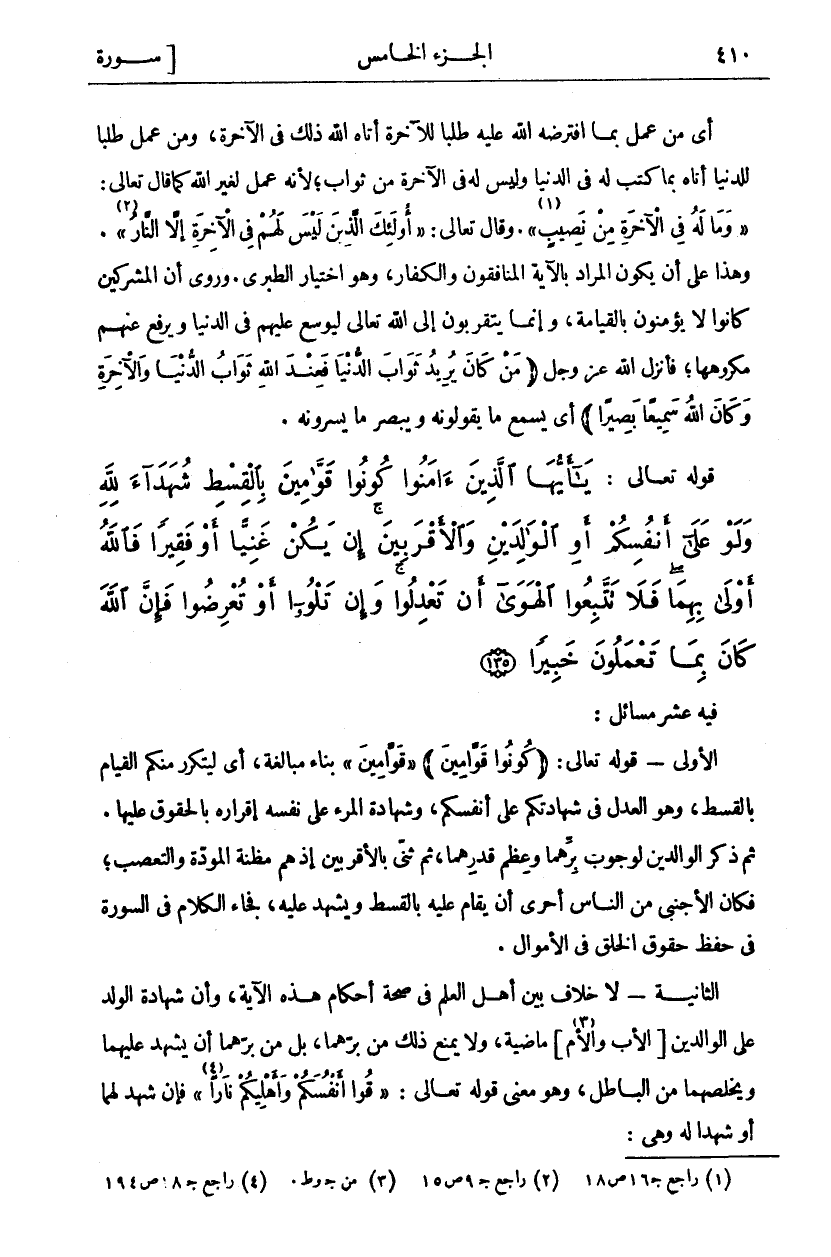 يَا أَيُّهَا الَّذِينَ آمَنُوا كُونُوا قَوَّامِينَ بِالْقِسْطِ شُهَداءَ لِلَّهِ وَلَوْ عَلى أَنْفُسِكُمْ أَوِ الْوالِدَيْنِ وَالْأَقْرَبِينَ إِنْ يَكُنْ غَنِيًّا أَوْ فَقِيراً فَاللَّهُ أَوْلى بِهِما فَلا تَتَّبِعُوا الْهَوى أَنْ تَعْدِلُوا وَإِنْ تَلْوُوا أَوْ تُعْرِضُوا فَإِنَّ اللَّهَ كانَ بِما تَعْمَلُونَ خَبِيراً (١٣٥)