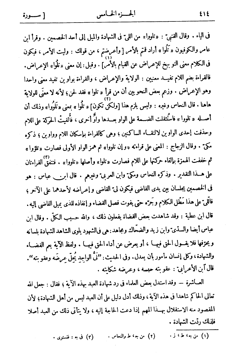 فِي الْيَاءِ. وَقَالَ الْقُتَبِيُّ: (تَلْوُوا) مِنَ اللَّيِّ فِي الشَّهَادَةِ وَالْمَيْلِ إِلَى أَحَدِ الْخَصْمَيْنِ. وَقَرَأَ ابْنُ عَامِرٍ وَالْكُوفِيُّونَ (تَلُوا) أَرَادَ قُمْتُمْ بِالْأَمْرِ [وَأَعْرَضْتُمْ، مِنْ قَوْلِكَ: وَلَّيْتُ الْأَمْرَ، فَيَكُونُ فِي الكلام معنى التَّوْبِيخُ لِلْإِعْرَاضِ عَنِ الْقِيَامِ بِالْأَمْرِ «١»]. وَقِيلَ: إِنَّ مَعْنَى (تَلُوا) الْإِعْرَاضُ. فَالْقِرَاءَةُ بِضَمِّ اللَّامِ تُفِيدُ مَعْنَيَيْنِ: الْوِلَايَةُ وَالْإِعْرَاضُ، وَالْقِرَاءَةُ بِوَاوَيْنِ تُفِيدُ مَعْنًى وَاحِدًا وَهُوَ الْإِعْرَاضُ. وَزَعَمَ بَعْضُ النَّحْوِيِّينَ أَنَّ مَنْ قَرَأَ (تَلُوا) فَقَدْ لَحَنَ، لِأَنَّهُ لَا معنى للولاية ها هنا. قَالَ النَّحَّاسُ وَغَيْرُهُ: وَلَيْسَ يَلْزَمُ هَذَا [وَلَكِنْ «٢» تَكُونُ] (تَلُوا) بِمَعْنَى (تَلْوُوا) وَذَلِكَ أَنَّ أَصْلَهُ (تَلْوُوا) فَاسْتُثْقِلَتِ الضَّمَّةُ عَلَى الْوَاوِ بَعْدَهَا وَاوٌ أُخْرَى، فَأُلْقِيَتِ الْحَرَكَةُ عَلَى اللَّامِ وَحُذِفَتْ إِحْدَى الْوَاوَيْنِ لِالْتِقَاءِ السَّاكِنَيْنِ، وَهِيَ كَالْقِرَاءَةِ بِإِسْكَانِ اللَّامِ وَوَاوَيْنِ، ذَكَرَهُ مَكِّيٌّ. وَقَالَ الزَّجَّاجُ: الْمَعْنَى عَلَى قِرَاءَتِهِ (وَإِنْ تَلْوُوا) ثُمَّ هَمَزَ الْوَاوَ الْأُولَى فصارت (تلووا) ثُمَّ خُفِّفَتِ الْهَمْزَةُ بِإِلْقَاءِ حَرَكَتِهَا عَلَى اللَّامِ فَصَارَتْ (تَلُوا) وَأَصْلُهَا (تَلْوُوا). فَتَتَّفِقُ «٣» الْقِرَاءَتَانِ عَلَى هَذَا التَّقْدِيرِ. وَذَكَرَهُ النَّحَّاسُ وَمَكِّيٌّ وَابْنُ الْعَرَبِيِّ وَغَيْرُهُمْ. قَالَ ابْنُ عَبَّاسٍ: هُوَ فِي الْخَصْمَيْنِ يَجْلِسَانِ بَيْنَ يَدَيِ الْقَاضِي فَيَكُونُ لَيُّ الْقَاضِي وَإِعْرَاضُهُ لِأَحَدِهِمَا عَلَى الْآخَرِ، فَاللَّيُّ عَلَى هَذَا مَطْلُ الْكَلَامِ وَجَرُّهُ حَتَّى يَفُوتَ فَصْلُ الْقَضَاءِ وَإِنْفَاذُهُ لِلَّذِي يَمِيلُ الْقَاضِي إِلَيْهِ. قَالَ ابْنُ عَطِيَّةَ: وَقَدْ شَاهَدْتُ بَعْضَ الْقُضَاةِ يَفْعَلُونَ ذَلِكَ، وَاللَّهُ حَسِيبُ الْكُلِّ. وَقَالَ ابْنُ عَبَّاسٍ أَيْضًا وَالسُّدِّيُّ وَابْنُ زَيْدٍ وَالضَّحَّاكُ وَمُجَاهِدٌ: هِيَ فِي الشُّهُودِ يَلْوِي الشَّاهِدُ الشَّهَادَةَ بِلِسَانِهِ وَيُحَرِّفُهَا فَلَا يَقُولُ الْحَقَّ فِيهَا، أَوْ يُعْرِضُ عَنْ أَدَاءِ الْحَقِّ فِيهَا. وَلَفْظُ الْآيَةِ يَعُمُّ الْقَضَاءَ وَالشَّهَادَةَ، وَكُلُّ إِنْسَانٍ مَأْمُورٌ بِأَنْ يَعْدِلَ. وَفِي الْحَدِيثِ: (لَيُّ الْوَاجِدِ يُحِلُّ عِرْضَهُ وَعُقُوبَتَهُ). قَالَ ابْنُ الْأَعْرَابِيِّ: عُقُوبَتُهُ حَبْسُهُ، وَعِرْضُهُ شِكَايَتُهُ. الْعَاشِرَةُ- وَقَدِ اسْتَدَلَّ بَعْضُ الْعُلَمَاءِ فِي رَدِّ شَهَادَةِ الْعَبْدِ بِهَذِهِ الْآيَةِ، فَقَالَ: جَعَلَ اللَّهُ تَعَالَى الْحَاكِمَ شَاهِدًا فِي هَذِهِ الْآيَةِ، وَذَلِكَ أَدَلُّ دَلِيلٍ عَلَى أَنَّ الْعَبْدَ لَيْسَ مِنْ أَهْلِ الشَّهَادَةِ، لِأَنَّ الْمَقْصُودَ مِنْهُ الِاسْتِقْلَالُ بِهَذَا الْمُهِمِّ إِذَا دَعَتِ الْحَاجَةُ إِلَيْهِ، وَلَا يَتَأَتَّى ذَلِكَ مِنَ العبد أصلا فلذلك ردت الشهادة.
