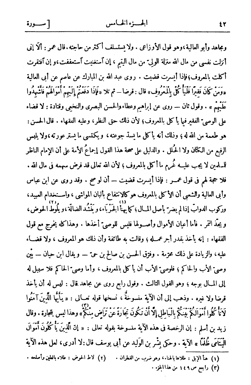 وَمُجَاهِدٌ وَأَبُو الْعَالِيَةِ، وَهُوَ قَوْلُ الْأَوْزَاعِيِّ. وَلَا يَسْتَسْلِفُ أَكْثَرَ مِنْ حَاجَتِهِ. قَالَ عُمَرُ: أَلَا إِنِّي أَنْزَلْتُ نَفْسِي مِنْ مَالِ اللَّهِ مَنْزِلَةَ الْوَلِيِّ مِنْ مَالِ الْيَتِيمِ، إِنِ اسْتَغْنَيْتُ اسْتَعْفَفْتُ، وَإِنِ افْتَقَرْتُ أَكَلْتُ بِالْمَعْرُوفِ، فَإِذَا أَيْسَرْتُ قَضَيْتُ. رَوَى عَبْدُ اللَّهِ بْنُ الْمُبَارَكِ عَنْ عَاصِمٍ عَنْ أَبِي الْعَالِيَةِ (وَمَنْ كانَ فَقِيراً فَلْيَأْكُلْ بِالْمَعْرُوفِ) قَالَ: قَرْضًا- ثُمَّ تَلَا (فَإِذا دَفَعْتُمْ إِلَيْهِمْ أَمْوالَهُمْ فَأَشْهِدُوا عَلَيْهِمْ). وَقَوْلٌ ثَانٍ- رُوِيَ عَنْ إِبْرَاهِيمَ وَعَطَاءٍ وَالْحَسَنِ الْبَصْرِيِّ وَالنَّخَعِيِّ وَقَتَادَةَ: لَا قَضَاءَ عَلَى الْوَصِيِّ الْفَقِيرِ فِيمَا يَأْكُلُ بِالْمَعْرُوفِ، لِأَنَّ ذَلِكَ حَقُّ النَّظَرِ، وَعَلَيْهِ الْفُقَهَاءُ. قَالَ الْحَسَنُ: هُوَ طُعْمَةٌ مِنَ اللَّهِ لَهُ، وَذَلِكَ أَنَّهُ يَأْكُلُ مَا يَسُدُّ جَوْعَتَهُ، وَيَكْتَسِي مَا يَسْتُرُ عَوْرَتَهُ، وَلَا يَلْبَسُ الرَّفِيعَ مِنَ الْكَتَّانِ وَلَا الْحُلَلَ. وَالدَّلِيلُ عَلَى صِحَّةِ هَذَا الْقَوْلِ إِجْمَاعُ الْأُمَّةِ عَلَى أَنَّ الْإِمَامَ النَّاظِرَ لِلْمُسْلِمِينَ لَا يَجِبُ عَلَيْهِ غُرْمُ مَا أَكَلَ بِالْمَعْرُوفِ، لِأَنَّ اللَّهَ تَعَالَى قَدْ فَرَضَ سَهْمَهُ فِي مَالِ اللَّهِ. فَلَا حُجَّةَ لَهُمْ فِي قَوْلِ عُمَرَ: فَإِذَا أَيْسَرْتُ قَضَيْتُ- أَنْ لَوْ صَحَّ. وَقَدْ رُوِيَ عَنِ ابْنِ عَبَّاسٍ وَأَبِي الْعَالِيَةِ وَالشَّعْبِيِّ أَنَّ الْأَكْلَ بِالْمَعْرُوفِ هُوَ كَالِانْتِفَاعِ بِأَلْبَانِ الْمَوَاشِي، وَاسْتِخْدَامِ الْعَبِيدِ، وَرُكُوبِ الدَّوَابِّ إِذَا لَمْ يَضُرَّ بِأَصْلِ الْمَالِ، كَمَا يَهْنَأُ «١» الْجَرْبَاءَ، وَيَنْشُدُ الضَّالَّةَ، وَيَلُوطُ «٢» الْحَوْضَ، وَيَجُذُّ التَّمْرَ. فَأَمَّا أَعْيَانُ الْأَمْوَالِ وَأُصُولُهَا فَلَيْسَ لِلْوَصِيِّ أَخْذُهَا. وَهَذَا كُلُّهُ يُخَرَّجُ مَعَ قَوْلِ الْفُقَهَاءِ: إِنَّهُ يَأْخُذُ بِقَدْرِ أَجْرِ عَمَلِهِ، وَقَالَتْ بِهِ طَائِفَةٌ وَأَنَّ ذَلِكَ هُوَ الْمَعْرُوفُ، وَلَا قَضَاءَ عَلَيْهِ، وَالزِّيَادَةُ عَلَى ذَلِكَ مُحَرَّمَةٌ. وَفَرَّقَ الْحَسَنُ بْنُ صَالِحِ بْنِ حَيٍّ- وَيُقَالُ ابْنُ حَيَّانَ- بَيْنَ وَصِيِّ الْأَبِ وَالْحَاكِمِ، فَلِوَصِيِّ الْأَبِ أَنْ يَأْكُلَ بِالْمَعْرُوفِ، وَأَمَّا وَصِيُّ الْحَاكِمِ فَلَا سَبِيلَ لَهُ إِلَى الْمَالِ بِوَجْهٍ، وَهُوَ الْقَوْلُ الثَّالِثُ. وَقَوْلٌ رَابِعٌ رُوِيَ عَنْ مُجَاهِدٍ قَالَ: لَيْسَ لَهُ أَنْ يَأْخُذَ قَرْضًا وَلَا غَيْرَهُ. وَذَهَبَ إِلَى أَنَّ الْآيَةَ مَنْسُوخَةٌ، نَسَخَهَا قَوْلُهُ تَعَالَى: (يَا أَيُّهَا الَّذِينَ آمَنُوا لَا تَأْكُلُوا أَمْوالَكُمْ بَيْنَكُمْ بِالْباطِلِ إِلَّا أَنْ تَكُونَ تِجارَةً عَنْ تَراضٍ مِنْكُمْ «٣») وَهَذَا لَيْسَ بِتِجَارَةٍ. وَقَالَ زَيْدُ بْنُ أَسْلَمَ: إِنَّ الرُّخْصَةَ فِي هَذِهِ الْآيَةِ مَنْسُوخَةٌ بِقَوْلِهِ تَعَالَى: (إِنَّ الَّذِينَ يَأْكُلُونَ أَمْوالَ الْيَتامى ظُلْماً) الآية. وحكى بشر بن الوليد عن أبى يُوسُفَ قَالَ: لَا أَدْرِي، لَعَلَّ هَذِهِ الْآيَةَ