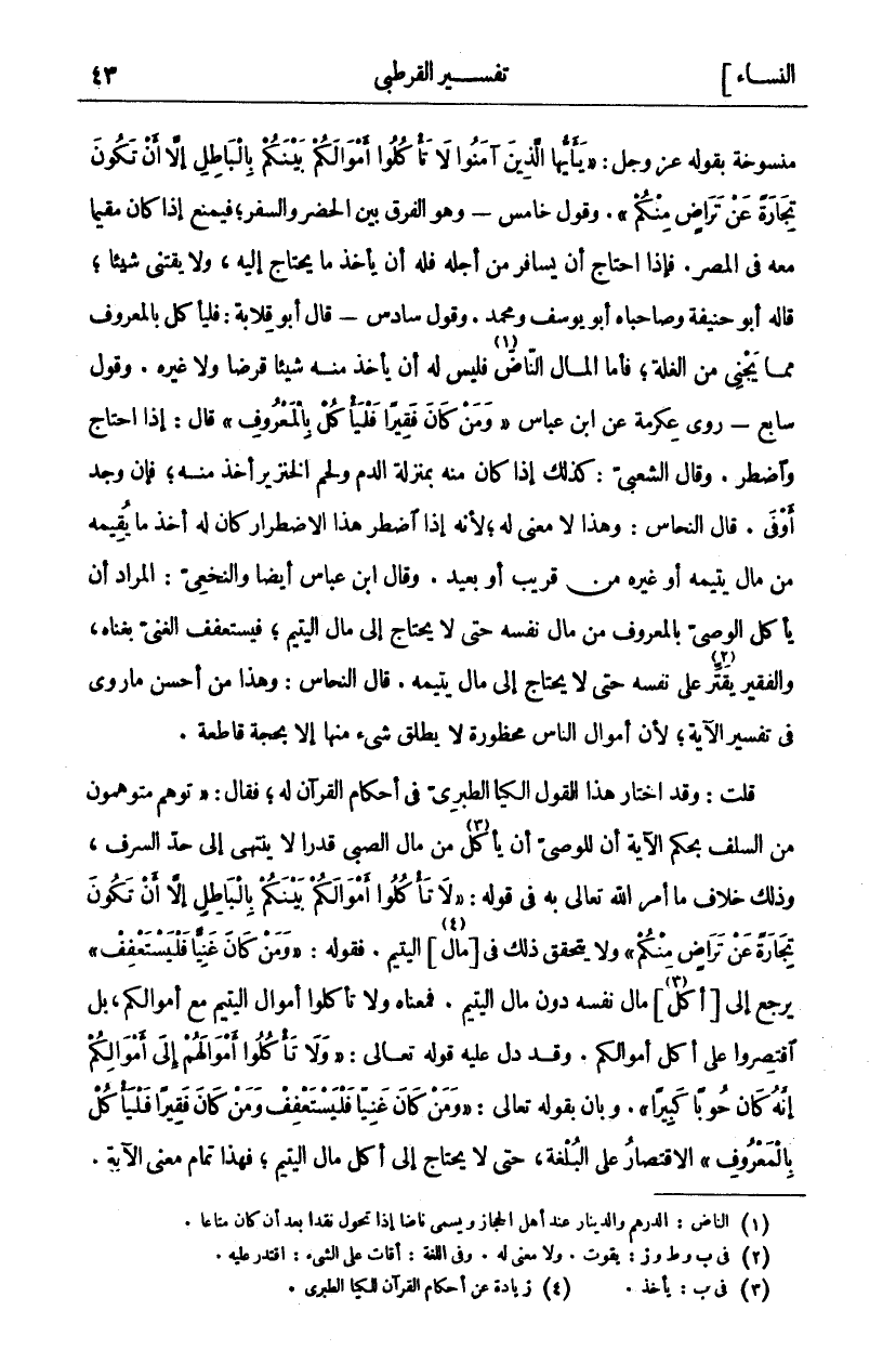 مَنْسُوخَةٌ بِقَوْلِهِ عَزَّ وَجَلَّ: (يَا أَيُّهَا الَّذِينَ آمَنُوا لَا تَأْكُلُوا أَمْوالَكُمْ بَيْنَكُمْ بِالْباطِلِ إِلَّا أَنْ تَكُونَ تِجارَةً عَنْ تَراضٍ مِنْكُمْ). وَقَوْلٌ خَامِسٌ- وَهُوَ الْفَرْقُ بَيْنَ الْحَضَرِ وَالسَّفَرِ، فَيُمْنَعُ إِذَا كَانَ مُقِيمًا مَعَهُ فِي الْمِصْرِ. فَإِذَا احْتَاجَ أَنْ يُسَافِرَ مِنْ أَجْلِهِ فَلَهُ أَنْ يَأْخُذَ مَا يَحْتَاجُ إِلَيْهِ، وَلَا يَقْتَنِي شَيْئًا، قَالَهُ أَبُو حَنِيفَةَ وَصَاحِبَاهُ أَبُو يُوسُفَ وَمُحَمَّدٌ. وَقَوْلٌ سَادِسٌ- قَالَ أَبُو قِلَابَةَ: فَلْيَأْكُلْ بِالْمَعْرُوفِ مِمَّا يَجْنِي مِنَ الْغَلَّةِ، فَأَمَّا الْمَالُ النَّاضُّ «١» فَلَيْسَ لَهُ أَنْ يَأْخُذَ مِنْهُ شَيْئًا قَرْضًا وَلَا غَيْرَهُ. وَقَوْلٌ سَابِعٌ- رَوَى عِكْرِمَةُ عَنِ ابْنِ عَبَّاسٍ (وَمَنْ كانَ فَقِيراً فَلْيَأْكُلْ بِالْمَعْرُوفِ) قَالَ: إِذَا احْتَاجَ وَاضْطُرَّ. وَقَالَ الشَّعْبِيُّ: كَذَلِكَ إِذَا كَانَ مِنْهُ بِمَنْزِلَةِ الدَّمِ وَلَحْمِ الْخِنْزِيرِ أخذ منه، فإن وجد أو في. قَالَ النَّحَّاسُ: وَهَذَا لَا مَعْنَى لَهُ لِأَنَّهُ إِذَا اضْطُرَّ هَذَا الِاضْطِرَارَ كَانَ لَهُ أَخْذُ مَا يُقِيمُهُ مِنْ مَالِ يَتِيمِهِ أَوْ غَيْرِهِ مِنْ قَرِيبٍ أَوْ بَعِيدٍ. وَقَالَ ابْنُ عَبَّاسٍ أَيْضًا وَالنَّخَعِيُّ: الْمُرَادُ أَنْ يَأْكُلَ الْوَصِيُّ بِالْمَعْرُوفِ مِنْ مَالِ نَفْسِهِ حَتَّى لَا يَحْتَاجَ إِلَى مَالِ الْيَتِيمِ، فَيَسْتَعْفِفُ الْغَنِيُّ بِغِنَاهُ، وَالْفَقِيرُ يُقَتِّرُ «٢» عَلَى نَفْسِهِ حَتَّى لَا يَحْتَاجَ إِلَى مَالِ يَتِيمِهِ. قَالَ النَّحَّاسُ: وَهَذَا مِنْ أَحْسَنِ مَا رُوِيَ فِي تَفْسِيرِ الْآيَةِ، لِأَنَّ أَمْوَالَ النَّاسِ محظورة لا يطلق شي مِنْهَا إِلَّا بِحُجَّةٍ قَاطِعَةٍ. قُلْتُ: وَقَدِ اخْتَارَ هَذَا الْقَوْلَ الْكِيَا الطَّبَرِيُّ فِي أَحْكَامِ الْقُرْآنِ لَهُ، فَقَالَ: (تَوَهَّمَ مُتَوَهِّمُونَ مِنَ السَّلَفِ بِحُكْمِ الْآيَةِ أَنَّ لِلْوَصِيِّ أَنْ يَأْكُلَ «٣» مِنْ مَالِ الصَّبِيِّ قَدْرًا لَا يَنْتَهِي إِلَى حَدِّ السَّرَفِ، وَذَلِكَ خِلَافُ مَا أَمَرَ اللَّهُ تَعَالَى بِهِ مِنْ قَوْلِهِ: لَا تَأْكُلُوا أَمْوالَكُمْ بَيْنَكُمْ بِالْباطِلِ إِلَّا أَنْ تَكُونَ تِجارَةً عَنْ تَراضٍ مِنْكُمْ) وَلَا يَتَحَقَّقُ ذَلِكَ فِي [مَالِ «٤» [الْيَتِيمِ. فَقَوْلُهُ: (وَمَنْ كانَ غَنِيًّا فَلْيَسْتَعْفِفْ) يَرْجِعُ إِلَى [أَكْلِ «٥» [مَالِ نَفْسِهِ دُونَ مَالِ الْيَتِيمِ. فَمَعْنَاهُ وَلَا تَأْكُلُوا أَمْوَالَ الْيَتِيمِ مَعَ أَمْوَالِكُمْ، بَلِ اقْتَصِرُوا عَلَى أَكْلِ أَمْوَالِكُمْ. وَقَدْ دَلَّ عَلَيْهِ قَوْلُهُ تَعَالَى: (وَلا تَأْكُلُوا أَمْوالَهُمْ إِلى أَمْوالِكُمْ إِنَّهُ كانَ حُوباً كَبِيراً). وَبَانَ بِقَوْلِهِ تَعَالَى: (وَمَنْ كانَ غَنِيًّا فَلْيَسْتَعْفِفْ وَمَنْ كانَ فَقِيراً فَلْيَأْكُلْ بِالْمَعْرُوفِ) الِاقْتِصَارُ عَلَى الْبُلْغَةِ، حَتَّى لَا يَحْتَاجَ إِلَى أَكْلِ مَالِ الْيَتِيمِ، فَهَذَا تَمَامُ مَعْنَى الآية.