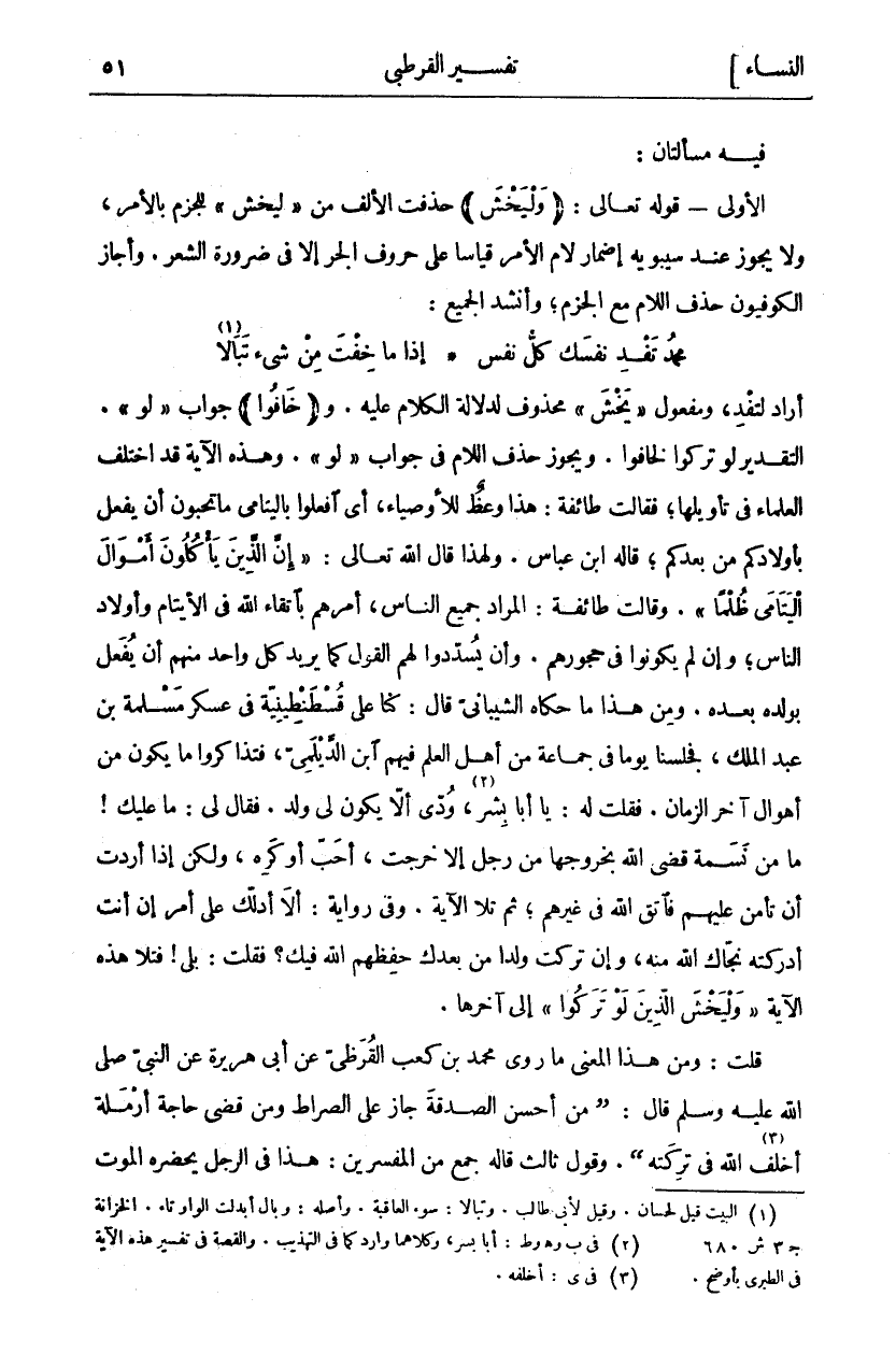 أَرَادَ لِتَفْدِ، وَمَفْعُولُ (لْيَخْشَ) مَحْذُوفٌ لِدَلَالَةِ الْكَلَامِ عَلَيْهِ. وَ (خافُوا) جَوَابُ (لَوْ). التَّقْدِيرُ لَوْ تَرَكُوا لَخَافُوا. وَيَجُوزُ حَذْفُ اللَّامِ فِي جَوَابِ (لَوْ). وَهَذِهِ الْآيَةُ قَدِ اخْتَلَفَ الْعُلَمَاءُ فِي تَأْوِيلِهَا، فَقَالَتْ طَائِفَةٌ: هَذَا وَعْظٌ لِلْأَوْصِيَاءِ، أَيِ افْعَلُوا بِالْيَتَامَى مَا تُحِبُّونَ أَنْ يُفْعَلَ بِأَوْلَادِكُمْ مِنْ بَعْدِكُمْ، قَالَهُ ابْنُ عَبَّاسٍ. وَلِهَذَا قَالَ اللَّهُ تَعَالَى: (إِنَّ الَّذِينَ يَأْكُلُونَ أَمْوالَ الْيَتامى ظُلْماً). وَقَالَتْ طَائِفَةٌ: الْمُرَادُ جَمِيعُ النَّاسِ، أَمَرَهُمْ بِاتِّقَاءِ اللَّهِ فِي الْأَيْتَامِ وَأَوْلَادِ النَّاسِ، وَإِنْ لَمْ يَكُونُوا فِي حُجُورِهِمْ. وأن يشددوا لَهُمُ الْقَوْلَ كَمَا يُرِيدُ كُلُّ وَاحِدٍ مِنْهُمْ أَنْ يُفْعَلَ بِوَلَدِهِ بَعْدَهُ. وَمِنْ هَذَا مَا حَكَاهُ الشَّيْبَانِيُّ قَالَ: كُنَّا عَلَى قُسْطَنْطِينِيَّةَ فِي عَسْكَرِ مَسْلَمَةَ بْنِ عَبْدِ الْمَلِكِ، فَجَلَسْنَا يَوْمًا فِي جَمَاعَةٍ مِنْ أَهْلِ الْعِلْمِ فِيهِمُ ابْنُ الدَّيْلَمِيِّ، فَتَذَاكَرُوا مَا يَكُونُ مِنْ أَهْوَالِ آخِرِ الزَّمَانِ. فَقُلْتُ لَهُ: يَا أَبَا بِشْرٍ «٢»، وُدِّي أَلَّا يَكُونَ لِي وَلَدٌ. فَقَالَ لِي: مَا عَلَيْكَ! مَا مِنْ نَسَمَةٍ قَضَى اللَّهُ بِخُرُوجِهَا مِنْ رَجُلٍ إِلَّا خَرَجَتْ، أَحَبَّ أَوْ كَرِهَ، وَلَكِنْ إِذَا أَرَدْتَ أَنْ تَأْمَنَ عَلَيْهِمْ فَاتَّقِ اللَّهَ فِي غَيْرِهِمْ، ثُمَّ تَلَا الْآيَةَ. وَفِي رِوَايَةٍ: أَلَا أَدُلُّكَ عَلَى أَمْرٍ إِنْ أَنْتَ أَدْرَكْتَهُ نَجَّاكَ اللَّهُ مِنْهُ، وَإِنْ تَرَكْتَ وَلَدًا مِنْ بَعْدِكَ حَفِظَهُمُ اللَّهُ فِيكَ؟ فَقُلْتُ: بَلَى! فَتَلَا هَذِهِ الْآيَةَ (وَلْيَخْشَ الَّذِينَ لَوْ تَرَكُوا) إِلَى آخِرِهَا. قُلْتُ: وَمِنْ هَذَا الْمَعْنَى مَا رَوَى مُحَمَّدُ بْنُ كَعْبٍ الْقُرَظِيُّ عَنْ أَبِي هُرَيْرَةَ عَنِ النَّبِيِّ صَلَّى اللَّهُ عَلَيْهِ وَسَلَّمَ قَالَ: (مَنْ أَحْسَنَ الصَّدَقَةَ جَازَ عَلَى الصِّرَاطِ وَمَنْ قَضَى حَاجَةَ أَرْمَلَةٍ أَخْلَفَ «٣» اللَّهُ فِي تَرِكَتِهِ). وَقَوْلٌ ثَالِثٌ قَالَهُ جَمْعٌ مِنَ الْمُفَسِّرِينَ: هذا في الرجل يحضره الموت