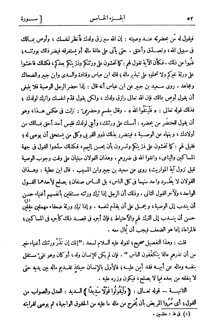 فَيَقُولُ لَهُ مَنْ بِحَضْرَتِهِ عِنْدَ وَصِيَّتِهِ: إِنَّ اللَّهَ سَيَرْزُقُ وَلَدَكَ فَانْظُرْ لِنَفْسِكَ، وَأَوْصِ بِمَالِكَ فِي سَبِيلِ اللَّهِ، وَتَصَدَّقْ وَأَعْتِقْ. حَتَّى يَأْتِيَ عَلَى عَامَّةِ مَالِهِ أَوْ يَسْتَغْرِقَهُ فَيَضُرُّ ذَلِكَ بِوَرَثَتِهِ، فَنُهُوا عَنْ ذَلِكَ. فَكَأَنَّ الْآيَةَ تَقُولُ لَهُمْ: (كَمَا تَخْشَوْنَ عَلَى وَرَثَتِكُمْ وَذُرِّيَّتِكُمْ بَعْدَكُمْ، فَكَذَلِكَ فَاخْشَوْا عَلَى وَرَثَةِ غَيْرِكُمْ وَلَا تَحْمِلُوهُ عَلَى تَبْذِيرِ مَالِهِ)، قَالَهُ ابْنُ عَبَّاسٍ وَقَتَادَةُ وَالسُّدِّيُّ وَابْنُ جُبَيْرٍ وَالضَّحَّاكُ وَمُجَاهِدٌ. رَوَى سَعِيدُ بْنُ جُبَيْرٍ عَنِ ابْنِ عَبَّاسٍ أَنَّهُ قَالَ: إِذَا حَضَرَ الرَّجُلُ الْوَصِيَّةَ فَلَا يَنْبَغِي أَنْ يَقُولَ أَوْصِ بِمَالِكَ فَإِنَّ اللَّهَ تَعَالَى رَازِقٌ وَلَدَكَ، وَلَكِنْ يَقُولُ قَدِّمْ لِنَفْسِكَ وَاتْرُكْ لِوَلَدِكَ، فَذَلِكَ قَوْلُهُ تَعَالَى: (فَلْيَتَّقُوا اللَّهَ). وَقَالَ مِقْسَمٌ وَحَضْرَمِيٌّ: نَزَلَتْ فِي عَكْسِ هَذَا، وَهُوَ أَنْ يَقُولَ لِلْمُحْتَضَرِ مَنْ يَحْضُرُهُ: أَمْسِكْ عَلَى وَرَثَتِكَ، وابق لولدك فليس أحد أحق بما لك مِنْ أَوْلَادِكَ، وَيَنْهَاهُ عَنِ الْوَصِيَّةِ، فَيَتَضَرَّرُ بِذَلِكَ ذَوُو الْقُرْبَى وَكُلُّ مَنْ يَسْتَحِقُّ أَنْ يُوصَى لَهُ، فَقِيلَ لَهُمْ: كَمَا تَخْشَوْنَ عَلَى ذُرِّيَّتِكُمْ وَتُسَرُّونَ بِأَنْ يُحْسَنَ إِلَيْهِمْ، فَكَذَلِكَ سَدِّدُوا الْقَوْلَ فِي جِهَةِ الْمَسَاكِينِ وَالْيَتَامَى، وَاتَّقُوا اللَّهَ فِي ضَرَرِهِمْ. وَهَذَانَ الْقَوْلَانِ مَبْنِيَّانِ عَلَى وَقْتِ وُجُوبِ الْوَصِيَّةِ قَبْلَ نُزُولِ آيَةِ الْمَوَارِيثِ، رُوِيَ عَنْ سَعِيدِ بْنِ جُبَيْرٍ وَابْنِ الْمُسَيَّبِ. قَالَ ابْنُ عَطِيَّةَ: وَهَذَانَ الْقَوْلَانِ لَا يَطَّرِدُ وَاحِدٌ مِنْهُمَا فِي كُلِّ النَّاسِ، بَلِ النَّاسُ صِنْفَانِ، يَصْلُحُ لِأَحَدِهِمَا الْقَوْلُ الْوَاحِدُ، وَلِآخَرَ الْقَوْلُ الثَّانِي. وَذَلِكَ أَنَّ الرَّجُلَ إِذَا تَرَكَ وَرَثَتَهُ مُسْتَقِلِّينَ بِأَنْفُسِهِمْ أَغْنِيَاءَ حَسُنَ أَنْ يُنْدَبَ إِلَى الْوَصِيَّةِ، وَيُحْمَلَ عَلَى أَنْ يُقَدِّمَ لِنَفْسِهِ. وَإِذَا تَرَكَ وَرَثَةً ضُعَفَاءَ مُهْمَلِينَ مُقِلِّينَ «١» حَسُنَ أَنْ يُنْدَبَ إِلَى التَّرْكِ لَهُمْ وَالِاحْتِيَاطِ، فَإِنَّ أَجْرَهُ فِي قَصْدِ ذَلِكَ كَأَجْرِهِ فِي الْمَسَاكِينِ، فَالْمُرَاعَاةُ إِنَّمَا هُوَ الضَّعْفُ فَيَجِبُ أَنْ يُمَالَ مَعَهُ. قُلْتُ: وَهَذَا التَّفْصِيلُ صَحِيحٌ، لِقَوْلِهِ عَلَيْهِ السَّلَامُ لِسَعْدٍ: (إِنَّكَ أن تذر ورثتك أغنياء خير من أن تَذَرَهُمْ عَالَةً يَتَكَفَّفُونَ النَّاسَ). فَإِنْ لَمْ يَكُنْ لِلْإِنْسَانِ وَلَدٌ، أَوْ كَانَ وَهُوَ غَنِيٌّ مُسْتَقِلٌّ بِنَفْسِهِ وَمَالِهِ عَنْ أَبِيهِ فَقَدْ أُمِنَ عَلَيْهِ، فَالْأَوْلَى بِالْإِنْسَانِ حِينَئِذٍ تَقْدِيمُ مَالِهِ بَيْنَ يَدَيْهِ حَتَّى لَا يُنْفِقَهُ مَنْ بَعْدَهُ فِيمَا لَا يَصْلُحُ، فَيَكُونُ وِزْرُهُ عَلَيْهِ. الثَّانِيةُ- قَوْلُهُ تَعَالَى: (وَلْيَقُولُوا قَوْلًا سَدِيداً) السَّدِيدُ: الْعَدْلُ وَالصَّوَابُ مِنَ الْقَوْلِ، أَيْ مُرُوا الْمَرِيضَ بِأَنْ يُخْرِجَ مِنْ ما له مَا عَلَيْهِ مِنَ الْحُقُوقِ الْوَاجِبَةِ، ثُمَّ يُوصِي لقرابته