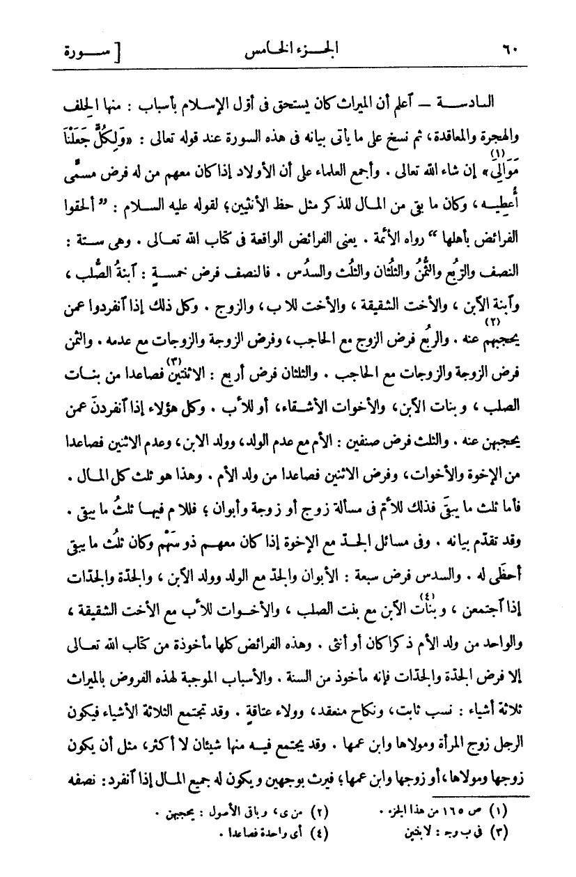السَّادِسَةُ- اعْلَمْ أَنَّ الْمِيرَاثَ كَانَ يُسْتَحَقُّ فِي أَوَّلِ الْإِسْلَامِ بِأَسْبَابٍ: مِنْهَا الْحِلْفُ وَالْهِجْرَةُ وَالْمُعَاقَدَةُ، ثُمَّ نُسِخَ عَلَى مَا يَأْتِي بَيَانُهُ فِي هَذِهِ السُّورَةِ عِنْدَ قَوْلِهِ تَعَالَى: (وَلِكُلٍّ جَعَلْنا مَوالِيَ «١») إِنْ شَاءَ اللَّهُ تَعَالَى. وَأَجْمَعَ الْعُلَمَاءُ عَلَى أَنَّ الْأَوْلَادَ إِذَا كَانَ مَعَهُمْ مَنْ لَهُ فَرْضٌ مُسَمًّى أُعْطِيَهُ، وَكَانَ مَا بَقِيَ مِنَ الْمَالِ لِلذَّكَرِ مِثْلُ حَظِّ الْأُنْثَيَيْنِ، لِقَوْلِهِ عَلَيْهِ السَّلَامُ: (أَلْحِقُوا الْفَرَائِضَ بِأَهْلِهَا) رَوَاهُ الْأَئِمَّةُ. يَعْنِي الْفَرَائِضَ الْوَاقِعَةَ فِي كِتَابِ اللَّهِ تَعَالَى. وَهِيَ سِتَّةٌ: النِّصْفُ وَالرُّبُعُ وَالثُّمُنُ وَالثُّلُثَانِ وَالثُّلُثُ وَالسُّدُسُ. فَالنِّصْفُ فَرْضُ خَمْسَةٍ: ابْنَةِ الصُّلْبِ، وَابْنَةِ الِابْنِ، وَالْأُخْتِ الشَّقِيقَةِ، وَالْأُخْتِ لِلْأَبِ، وَالزَّوْجِ. وَكُلُّ ذَلِكَ إِذَا انْفَرَدُوا عَمَّنْ يَحْجُبُهُمْ «٢» عَنْهُ. وَالرُّبُعُ فَرْضُ الزَّوْجِ مَعَ الْحَاجِبِ، وَفَرْضُ الزَّوْجَةِ وَالزَّوْجَاتِ مَعَ عَدَمِهِ. وَالثُّمُنُ فَرْضُ الزَّوْجَةِ وَالزَّوْجَاتِ مَعَ الْحَاجِبِ. وَالثُّلُثَانِ فَرْضُ أَرْبَعٍ: الِاثْنَتَيْنِ «٣» فَصَاعِدًا مِنْ بَنَاتِ الصُّلْبِ، وَبَنَاتِ الِابْنِ، وَالْأَخَوَاتِ الْأَشِقَّاءِ، أَوْ لِلْأَبِ. وَكُلُّ هَؤُلَاءِ إِذَا انْفَرَدْنَ عَمَّنْ يَحْجُبُهُنَّ عَنْهُ. وَالثُّلُثُ فَرْضُ صِنْفَيْنِ: الْأُمِّ مَعَ عَدَمِ الْوَلَدِ، وَوَلَدِ الِابْنِ، وَعَدَمُ الِاثْنَيْنِ فَصَاعِدًا مِنَ الْإِخْوَةِ وَالْأَخَوَاتِ، وَفَرْضُ الِاثْنَيْنِ فَصَاعِدًا مِنْ وَلَدِ الْأُمِّ. وَهَذَا هُوَ ثُلُثُ كُلِّ الْمَالِ. فَأَمَّا ثُلُثُ مَا يَبْقَى فَذَلِكَ لِلْأُمِّ فِي مَسْأَلَةِ زَوْجٍ أَوْ زَوْجَةٍ وَأَبَوَانِ، فَلِلْأُمِّ فِيهَا ثُلُثُ مَا يَبْقَى. وَقَدْ تَقَدَّمَ بَيَانُهُ. وَفِي مَسَائِلِ الْجَدِّ مَعَ الْإِخْوَةِ إِذَا كَانَ مَعَهُمْ ذُو سَهْمٍ وَكَانَ ثُلُثُ مَا يَبْقَى أَحْظَى لَهُ. وَالسُّدُسُ فَرْضُ سَبْعَةٍ: الْأَبَوَانِ وَالْجَدُّ مَعَ الْوَلَدِ وَوَلَدُ الِابْنِ، وَالْجَدَّةُ وَالْجَدَّاتُ إِذَا اجْتَمَعْنَ، وَبَنَاتُ «٤» الِابْنِ مَعَ بِنْتِ الصُّلْبِ، وَالْأَخَوَاتُ لِلْأَبِ مَعَ الْأُخْتِ الشَّقِيقَةِ، وَالْوَاحِدُ مِنْ وَلَدِ الْأُمِّ ذَكَرًا كَانَ أَوْ أُنْثَى. وَهَذِهِ الْفَرَائِضُ كُلُّهَا مَأْخُوذَةٌ مِنْ كِتَابِ اللَّهِ تَعَالَى إِلَّا فَرْضَ الْجَدَّةِ وَالْجَدَّاتِ فَإِنَّهُ مَأْخُوذٌ مِنَ السُّنَّةِ. وَالْأَسْبَابُ الْمُوجِبَةُ لِهَذِهِ الْفُرُوضِ بِالْمِيرَاثِ ثَلَاثَةُ أَشْيَاءٍ: نَسَبٌ ثَابِتٌ، وَنِكَاحٌ مُنْعَقِدٌ، وَوَلَاءُ عَتَاقَةٍ. وَقَدْ تَجْتَمِعُ الثَّلَاثَةُ الْأَشْيَاءُ فَيَكُونُ الرَّجُلُ زَوْجَ الْمَرْأَةِ وَمَوْلَاهَا وَابْنَ عَمِّهَا. وَقَدْ يَجْتَمِعُ فِيهِ مِنْهَا شَيْئَانِ لَا أَكْثَرُ، مِثْلَ أَنْ يَكُونَ زَوْجُهَا وَمَوْلَاهَا، أَوْ زَوْجُهَا وَابْنُ عَمِّهَا، فَيَرِثُ بِوَجْهَيْنِ وَيَكُونُ لَهُ جميع المال إذا انفرد: نصفه