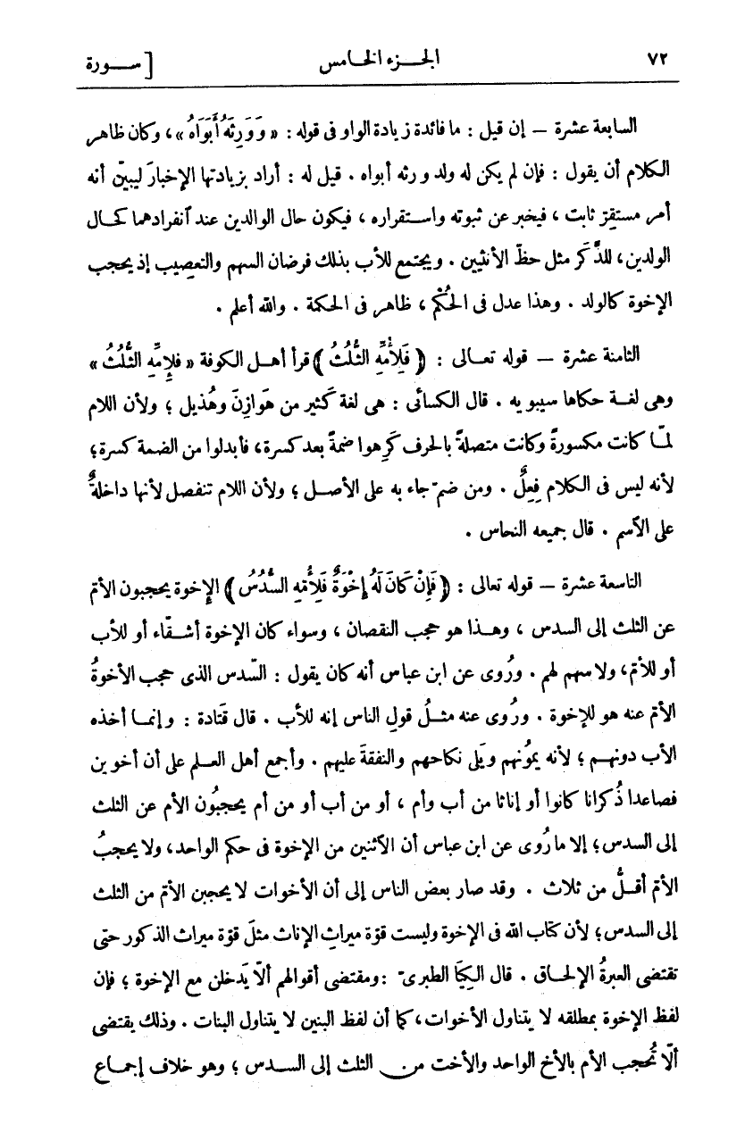 السَّابِعَةُ عَشْرَةَ- إِنْ قِيلَ: مَا فَائِدَةُ زِيَادَةِ الْوَاوِ فِي قَوْلِهِ: (وَوَرِثَهُ أَبَواهُ)، وَكَانَ ظَاهِرُ الْكَلَامِ أَنْ يَقُولَ: فَإِنْ لَمْ يَكُنْ لَهُ وَلَدٌ وَرِثَهُ أَبَوَاهُ. قِيلَ لَهُ: أَرَادَ بِزِيَادَتِهَا الْإِخْبَارَ لِيُبَيِّنَ أَنَّهُ أَمْرٌ مُسْتَقِرٌّ ثَابِتٌ فَيُخْبِرُ عَنْ ثُبُوتِهِ وَاسْتِقْرَارِهِ، فَيَكُونُ حَالُ الْوَالِدَيْنِ عِنْدَ انْفِرَادِهِمَا كَحَالِ الْوَلَدَيْنِ، لِلذَّكَرِ مِثْلُ حَظِّ الْأُنْثَيَيْنِ. وَيَجْتَمِعُ لِلْأَبِ بِذَلِكَ فَرْضَانِ السَّهْمُ وَالتَّعْصِيبُ إِذْ يُحْجَبُ الْإِخْوَةُ كَالْوَلَدِ. وَهَذَا عَدْلٌ فِي الْحُكْمِ، ظَاهِرٌ فِي الْحِكْمَةِ. وَاللَّهُ أَعْلَمُ. الثَّامِنَةُ عَشْرَةَ- قَوْلُهُ تَعَالَى: (فَلِأُمِّهِ الثُّلُثُ) قَرَأَ أَهْلُ الْكُوفَةِ (فَلِإِمِّهِ الثُّلُثُ) وَهِيَ لُغَةٌ حَكَاهَا سِيبَوَيْهِ. قَالَ الْكِسَائِيُّ: هِيَ لُغَةُ كَثِيرٍ مِنْ هَوَازِنَ وَهُذَيْلٍ، وَلِأَنَّ اللَّامَ لَمَّا كَانَتْ مَكْسُورَةً وَكَانَتْ مُتَّصِلَةً بِالْحَرْفِ كَرِهُوا ضَمَّةً بَعْدَ كَسْرَةٍ، فَأَبْدَلُوا مِنَ الضَّمَّةِ كَسْرَةً، لِأَنَّهُ لَيْسَ فِي الْكَلَامِ فِعِلٌ. وَمَنْ ضَمَّ جَاءَ بِهِ عَلَى الْأَصْلِ، وَلِأَنَّ اللَّامَ تَنْفَصِلُ لِأَنَّهَا دَاخِلَةٌ عَلَى الِاسْمِ. قَالَ جَمِيعُهُ النَّحَّاسُ. التَّاسِعَةُ عَشْرَةَ- قَوْلُهُ تَعَالَى: (فَإِنْ كانَ لَهُ إِخْوَةٌ فَلِأُمِّهِ السُّدُسُ) الْإِخْوَةُ يَحْجُبُونَ الْأُمَّ عَنِ الثُّلُثِ إِلَى السُّدُسِ، وَهَذَا هُوَ حَجْبُ النُّقْصَانِ، وَسَوَاءٌ كَانَ الْإِخْوَةُ أَشِقَّاءً أَوْ لِلْأَبِ أَوْ لِلْأُمِّ، وَلَا سَهْمَ لَهُمْ. وَرُوِيَ عَنِ ابْنِ عَبَّاسٍ أَنَّهُ كَانَ يَقُولُ: السُّدُسُ الَّذِي حَجَبَ الْإِخْوَةُ الْأُمَّ عَنْهُ هُوَ لِلْإِخْوَةِ. وَرُوِيَ عَنْهُ مِثْلُ قَوْلِ النَّاسِ إِنَّهُ لِلْأَبِ. قَالَ قَتَادَةُ: وَإِنَّمَا أَخَذَهُ الْأَبُ دُونَهُمْ، لِأَنَّهُ يَمُونُهُمْ وَيَلِي نِكَاحَهُمْ وَالنَّفَقَةَ عَلَيْهِمْ. وَأَجْمَعَ أَهْلُ الْعِلْمِ عَلَى أَنَّ أَخَوَيْنِ فَصَاعِدًا ذُكْرَانًا كَانُوا أَوْ إِنَاثًا مِنْ أَبٍ وَأُمٍّ، أَوْ مِنْ أَبٍ أَوْ مِنْ أُمٍّ يَحْجُبُونَ الْأُمَّ عَنِ الثُّلُثِ إِلَى السُّدُسِ، إِلَّا مَا رُوِيَ عَنِ ابْنِ عَبَّاسٍ أَنَّ الِاثْنَيْنِ مِنَ الْإِخْوَةِ فِي حُكْمِ الْوَاحِدِ، وَلَا يَحْجُبُ الْأُمَّ أَقَلُّ مِنْ ثلاث. وَقَدْ صَارَ بَعْضُ النَّاسِ إِلَى أَنَّ الْأَخَوَاتِ لَا يَحْجُبْنَ الْأُمَّ مِنَ الثُّلُثِ إِلَى السُّدُسِ، لِأَنَّ كِتَابَ اللَّهِ فِي الْإِخْوَةِ وَلَيْسَتْ قُوَّةُ مِيرَاثِ الْإِنَاثِ مِثْلَ قُوَّةِ مِيرَاثِ الذُّكُورِ حَتَّى تَقْتَضِيَ الْعِبْرَةُ الْإِلْحَاقَ. قَالَ الْكِيَا الطَّبَرِيُّ: وَمُقْتَضَى أَقْوَالِهِمْ أَلَّا يَدْخُلْنَ مَعَ الْإِخْوَةِ، فَإِنَّ لَفْظَ الْإِخْوَةِ بِمُطْلَقِهِ لَا يَتَنَاوَلُ الْأَخَوَاتِ، كَمَا أَنَّ لَفْظَ الْبَنِينَ لَا يَتَنَاوَلُ الْبَنَاتِ. وَذَلِكَ يَقْتَضِي أَلَّا تُحْجَبَ الْأُمُّ بِالْأَخِ الْوَاحِدِ وَالْأُخْتِ مِنَ الثُّلُثِ إِلَى السُّدُسِ، وَهُوَ خِلَافُ إِجْمَاعِ