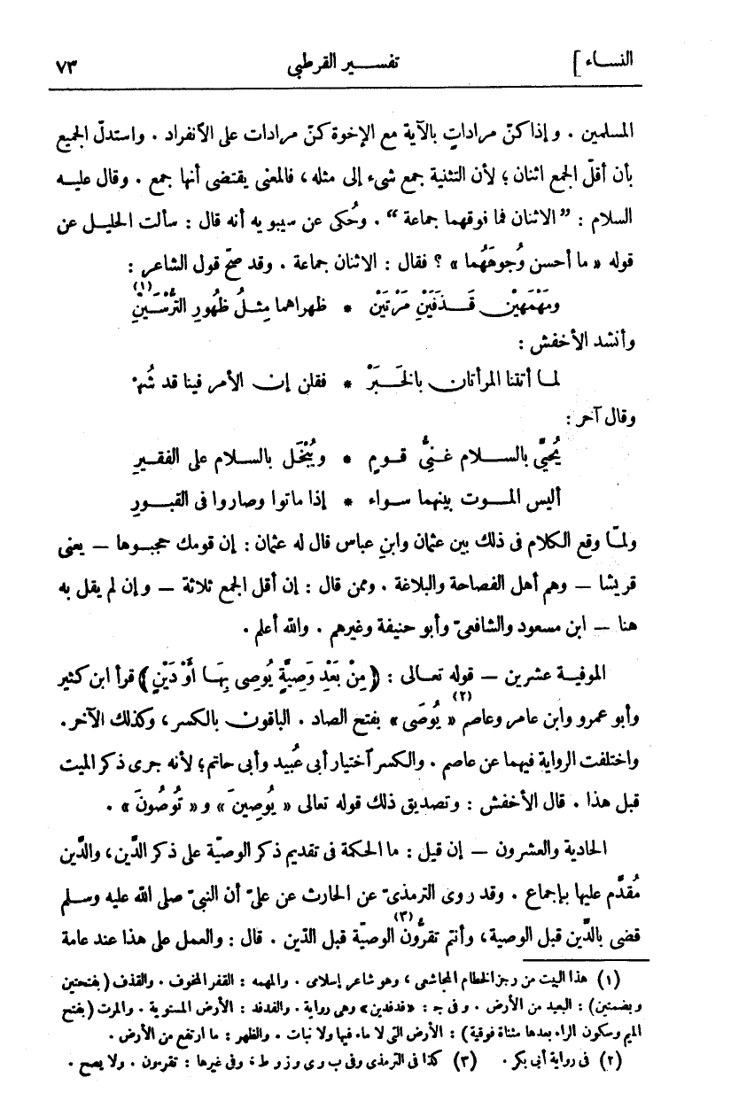 وَلَمَّا وَقَعَ الْكَلَامُ فِي ذَلِكَ بَيْنَ عُثْمَانَ وَابْنِ عَبَّاسٍ قَالَ لَهُ عُثْمَانُ: إِنَّ قَوْمَكَ حَجَبُوهَا- يَعْنِي قُرَيْشًا- وَهُمْ أَهْلُ الْفَصَاحَةِ وَالْبَلَاغَةِ. وَمِمَّنْ قَالَ: إِنَّ أَقَلَّ الْجَمْعِ ثَلَاثَةٌ- وَإِنْ لَمْ يَقُلْ بِهِ هُنَا- ابْنُ مَسْعُودٍ وَالشَّافِعِيُّ وَأَبُو حَنِيفَةَ وَغَيْرُهُمْ. وَاللَّهُ أَعْلَمُ. الْمُوَفِّيَةُ عِشْرِينَ- قَوْلُهُ تَعَالَى: (مِنْ بَعْدِ وَصِيَّةٍ يُوصِي بِها أَوْ دَيْنٍ قَرَأَ ابْنُ كَثِيرٍ وَأَبُو عَمْرٍو وَابْنُ عَامِرٍ وَعَاصِمٍ «٢») يُوصَى بِفَتْحِ الصَّادِ. الْبَاقُونَ بِالْكَسْرِ، وَكَذَلِكَ الْآخَرُ. وَاخْتَلَفَتِ الرِّوَايَةُ فِيهِمَا عَنْ عَاصِمٍ. وَالْكَسْرُ اخْتِيَارُ أَبِي عُبَيْدٍ وَأَبِي حَاتِمٍ، لِأَنَّهُ جَرَى ذِكْرُ الْمَيِّتِ قَبْلَ هَذَا. قَالَ الْأَخْفَشُ: وَتَصْدِيقُ ذَلِكَ قَوْلُهُ تَعَالَى (يُوصِينَ) و (تُوصُونَ). الْحَادِيَةُ وَالْعِشْرُونَ- إِنْ قِيلَ: مَا الْحِكْمَةُ فِي تَقْدِيمِ ذِكْرِ الْوَصِيَّةِ عَلَى ذِكْرِ الدَّيْنِ، وَالدَّيْنُ مُقَدَّمٌ عَلَيْهَا بِإِجْمَاعٍ. وَقَدْ رَوَى التِّرْمِذِيُّ عَنِ الْحَارِثِ عَنْ عَلِيٍّ أَنَّ النَّبِيَّ صَلَّى اللَّهُ عَلَيْهِ وَسَلَّمَ قَضَى بِالدَّيْنِ قَبْلَ الْوَصِيَّةِ، وَأَنْتُمْ تُقِرُّونَ «٣» الْوَصِيَّةَ قَبْلَ الدَّيْنِ. قَالَ: وَالْعَمَلُ عَلَى هذا عند عامة