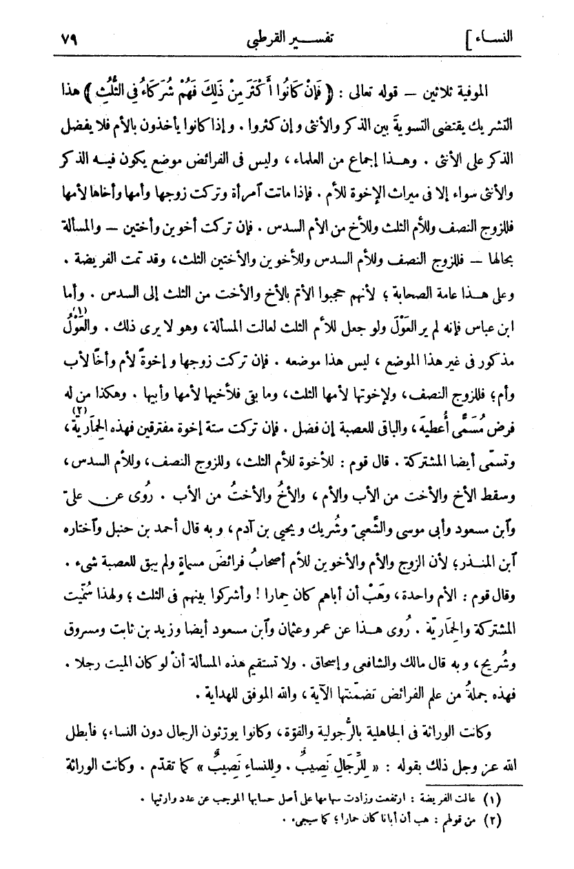 الموفية ثلاثين- قَوْلُهُ تَعَالَى: (فَإِنْ كانُوا أَكْثَرَ مِنْ ذلِكَ فَهُمْ شُرَكاءُ فِي الثُّلُثِ) هَذَا التَّشْرِيكُ يَقْتَضِي التَّسْوِيَةَ بَيْنَ الذَّكَرِ وَالْأُنْثَى وَإِنْ كَثُرُوا. وَإِذَا كَانُوا يَأْخُذُونَ بِالْأُمِّ فَلَا يُفَضَّلُ الذَّكَرُ عَلَى الْأُنْثَى. وَهَذَا إِجْمَاعٌ مِنَ الْعُلَمَاءِ، وَلَيْسَ فِي الْفَرَائِضِ مَوْضِعٌ يَكُونُ فِيهِ الذَّكَرُ وَالْأُنْثَى سَوَاءً إِلَّا فِي مِيرَاثِ الْإِخْوَةِ لِلْأُمِّ. فَإِذَا مَاتَتِ امْرَأَةٌ وَتَرَكَتْ زَوْجَهَا وَأُمَّهَا وَأَخَاهَا لِأُمِّهَا فَلِلزَّوْجِ النِّصْفُ وَلِلْأُمِّ الثُّلُثُ وَلِلْأَخِ مِنَ الْأُمِّ السُّدُسُ. فَإِنْ تَرَكَتْ أَخَوَيْنِ وَأُخْتَيْنِ- وَالْمَسْأَلَةَ بِحَالِهَا- فَلِلزَّوْجِ النِّصْفُ وَلِلْأُمِّ السُّدُسُ وَلِلْأَخَوَيْنِ وَالْأُخْتَيْنِ الثُّلُثُ، وَقَدْ تَمَّتِ الْفَرِيضَةُ. وَعَلَى هَذَا عَامَّةُ الصَّحَابَةِ، لِأَنَّهُمْ حَجَبُوا الْأُمَّ بِالْأَخِ وَالْأُخْتِ مِنَ الثُّلُثِ إِلَى السُّدُسِ. وَأَمَّا ابْنُ عَبَّاسٍ فَإِنَّهُ لَمْ يَرَ الْعَوْلَ وَلَوْ جَعَلَ لِلْأُمِّ الثُّلُثَ لَعَالَتِ الْمَسْأَلَةُ، وَهُوَ لَا يَرَى ذَلِكَ. وَالْعَوْلُ «١» مَذْكُورٌ فِي غَيْرِ هَذَا الْمَوْضِعِ، لَيْسَ هَذَا مَوْضِعُهُ. فَإِنْ تَرَكَتْ زَوْجَهَا وَإِخْوَةً لِأُمٍّ وَأَخًا لِأَبٍ وَأُمٍّ، فَلِلزَّوْجِ النِّصْفُ، وَلِإِخْوَتِهَا لِأُمِّهَا الثُّلُثُ، وَمَا بَقِيَ فَلِأَخِيهَا لِأُمِّهَا وَأَبِيهَا. وَهَكَذَا مَنْ لَهُ فَرْضٌ مُسَمًّى أُعْطِيَهُ، وَالْبَاقِي لِلْعَصَبَةِ إِنْ فَضَلَ. فَإِنْ تَرَكَتْ سِتَّةَ إِخْوَةٍ مُفْتَرِقِينَ فَهَذِهِ الْحِمَارِيَّةُ «٢»، وَتُسَمَّى أَيْضًا الْمُشْتَرَكَةُ. قَالَ قَوْمٌ: لِلْإِخْوَةِ لِلْأُمِّ الثُّلُثُ، وَلِلزَّوْجِ النِّصْفُ، وَلِلْأُمِّ السُّدُسُ، وَسَقَطَ الْأَخُ وَالْأُخْتُ مِنَ الْأَبِ وَالْأُمِّ، وَالْأَخِ وَالْأُخْتِ مِنَ الْأَبِ. رُوِيَ عَنْ عَلِيٍّ وَابْنِ مَسْعُودٍ وَأَبِي مُوسَى وَالشَّعْبِيِّ وَشَرِيكٍ وَيَحْيَى بْنِ آدَمَ، وَبِهِ قَالَ أَحْمَدُ بْنُ حَنْبَلٍ وَاخْتَارَهُ ابْنُ الْمُنْذِرِ، لِأَنَّ الزَّوْجَ وَالْأُمَّ وَالْأَخَوَيْنِ لِلْأُمِّ أَصْحَابُ فَرَائِضَ مُسَمَّاةٍ ولم يبق للعصبة شي. وَقَالَ قَوْمٌ: الْأُمُّ وَاحِدَةٌ، وَهَبْ أَنَّ أَبَاهُمْ كَانَ حِمَارًا! وَأَشْرَكُوا بَيْنَهُمْ فِي الثُّلُثِ، وَلِهَذَا سُمِّيَتِ الْمُشْتَرَكَةُ وَالْحِمَارِيَّةُ. رُوِيَ هَذَا عَنْ عُمَرَ وَعُثْمَانَ وَابْنِ مَسْعُودٍ أَيْضًا وَزَيْدِ بْنِ ثَابِتٍ وَمَسْرُوقٍ وَشُرَيْحٍ، وَبِهِ قَالَ مَالِكٌ وَالشَّافِعِيُّ وَإِسْحَاقُ. وَلَا تَسْتَقِيمُ هَذِهِ الْمَسْأَلَةُ أَنْ لَوْ كَانَ الْمَيِّتُ رَجُلًا. فَهَذِهِ جُمْلَةٌ مِنْ عِلْمِ الْفَرَائِضِ تَضَمَّنَتْهَا الْآيَةُ، وَاللَّهُ الْمُوَفِّقُ لِلْهِدَايَةِ. وَكَانَتِ الْوِرَاثَةُ فِي الْجَاهِلِيَّةِ بِالرُّجُولِيَّةِ وَالْقُوَّةِ، وَكَانُوا يُوَرِّثُونَ الرِّجَالَ دُونَ النِّسَاءِ، فَأَبْطَلَ اللَّهُ عَزَّ وَجَلَّ ذَلِكَ بِقَوْلِهِ: (لِلرِّجالِ نَصِيبٌ مِمَّا اكْتَسَبُوا وَلِلنِّساءِ نَصِيبٌ) كما تقدم. وكانت الوراثة