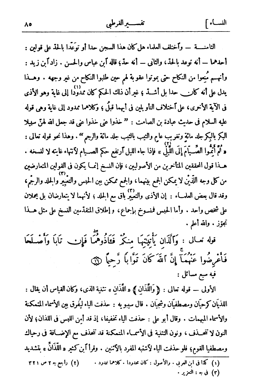 الثَّامِنَةُ- وَاخْتَلَفَ الْعُلَمَاءُ هَلْ كَانَ هَذَا السِّجْنُ حَدًّا أَوْ تَوَعُّدًا بِالْحَدِّ عَلَى قَوْلَيْنِ: أَحَدُهُمَا- أَنَّهُ تَوَعُّدٌ بِالْحَدِّ، وَالثَّانِي- أَنَّهُ حَدٌّ، قَالَهُ ابْنُ عَبَّاسٍ وَالْحَسَنُ. زَادَ ابْنُ زَيْدٍ: وَأَنَّهُمْ مُنِعُوا مِنَ النِّكَاحِ حَتَّى يَمُوتُوا عُقُوبَةً لَهُمْ حِينَ طَلَبُوا النِّكَاحَ مِنْ غَيْرِ وَجْهِهِ. وَهَذَا يَدُلُّ عَلَى أَنَّهُ كَانَ حَدًّا بَلْ أَشَدُّ، غَيْرَ أَنَّ ذَلِكَ الْحُكْمَ كَانَ مَمْدُودًا «١» إِلَى غَايَةٍ وَهُوَ الْأَذَى فِي الْآيَةِ الْأُخْرَى، عَلَى اخْتِلَافِ التَّأْوِيلَيْنِ فِي أَيِّهِمَا قَبْلُ، وَكِلَاهُمَا مَمْدُودٌ إِلَى غَايَةٍ وَهِيَ قَوْلُهُ عَلَيْهِ السَّلَامُ فِي حَدِيثِ عُبَادَةَ بْنِ الصَّامِتِ: (خُذُوا عَنِّي خُذُوا عَنِّي قَدْ جَعَلَ اللَّهُ لَهُنَّ سَبِيلًا الْبِكْرُ بِالْبِكْرِ جَلْدُ مِائَةٍ وَتَغْرِيبُ عَامٍ وَالثَّيِّبُ بِالثَّيِّبِ جَلْدُ مِائَةٍ وَالرَّجْمُ (. وَهَذَا نَحْوُ قَوْلُهُ تَعَالَى:) ثُمَّ أَتِمُّوا الصِّيامَ إِلَى اللَّيْلِ «٢» (فَإِذَا جَاءَ اللَّيْلُ ارْتَفَعَ حُكْمُ الصِّيَامِ لِانْتِهَاءِ غَايَتِهِ لَا لِنَسْخِهِ هَذَا قَوْلُ الْمُحَقِّقِينَ الْمُتَأَخِّرِينَ مِنَ الْأُصُولِيِّينَ، فَإِنَّ النَّسْخَ إِنَّمَا يَكُونُ فِي الْقَوْلَيْنِ الْمُتَعَارِضَيْنَ مِنْ كُلِّ وَجْهٍ اللَّذَيْنِ لَا يُمْكِنُ الْجَمْعُ بَيْنَهُمَا، وَالْجَمْعُ مُمْكِنٌ بَيْنَ الْحَبْسِ وَالتَّعْيِيرِ «٣» وَالْجَلْدِ وَالرَّجْمِ، وَقَدْ قَالَ بَعْضُ الْعُلَمَاءِ: إِنَّ الْأَذَى وَالتَّعْيِيرَ «٤» بَاقٍ مَعَ الْجَلْدِ، لِأَنَّهُمَا لَا يَتَعَارَضَانِ بَلْ يُحْمَلَانِ عَلَى شَخْصٍ وَاحِدٍ. وَأَمَّا الْحَبْسُ فَمَنْسُوخٌ بِإِجْمَاعٍ، وَإِطْلَاقُ الْمُتَقَدِّمِينَ النَّسْخَ عَلَى مِثْلِ هذا تجوز. والله أعلم.