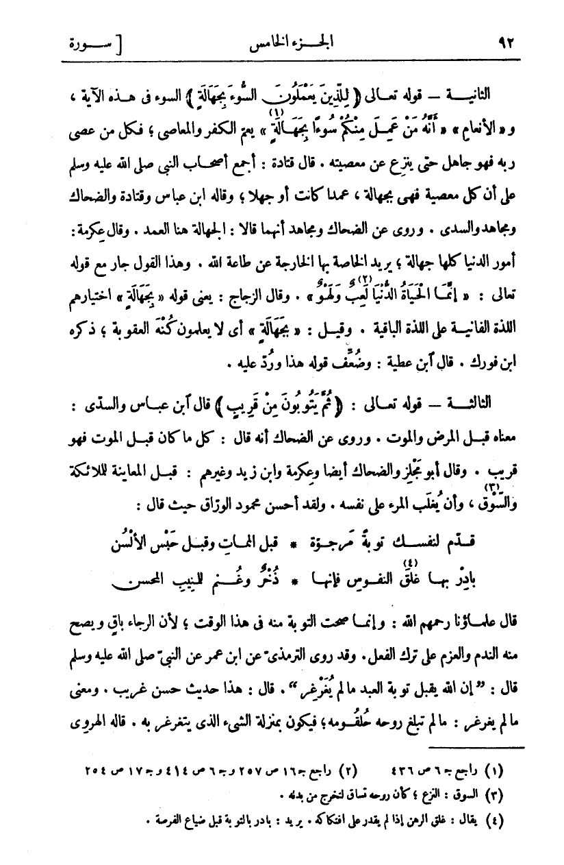 الثَّانِيةُ- قَوْلُهُ تَعَالَى (لِلَّذِينَ يَعْمَلُونَ السُّوءَ بِجَهالَةٍ) السُّوءُ فِي هَذِهِ الْآيَةِ، وَ (الْأَنْعَامِ) (أَنَّهُ مَنْ عَمِلَ مِنْكُمْ سُوءاً بِجَهالَةٍ «١») يَعُمُّ الْكُفْرَ وَالْمَعَاصِيَ، فَكُلُّ مَنْ عَصَى رَبَّهُ فَهُوَ جَاهِلٌ حَتَّى يَنْزِعَ عَنْ مَعْصِيَتِهِ. قَالَ قَتَادَةُ: أَجْمَعَ أَصْحَابُ النَّبِيِّ صَلَّى اللَّهُ عَلَيْهِ وَسَلَّمَ عَلَى أَنَّ كُلَّ مَعْصِيَةٍ فَهِيَ بِجَهَالَةٍ، عَمْدًا كَانَتْ أَوْ جَهْلًا، وَقَالَ ابْنُ عَبَّاسٍ وَقَتَادَةُ وَالضَّحَّاكُ وَمُجَاهِدٌ وَالسُّدِّيُّ. وَرُوِيَ عَنِ الضَّحَّاكِ وَمُجَاهِدٍ أَنَّهُمَا قَالَا: الْجَهَالَةُ هُنَا الْعَمْدُ. وَقَالَ عِكْرِمَةُ: أُمُورُ الدُّنْيَا كُلُّهَا جَهَالَةٌ، يُرِيدُ الْخَاصَّةَ بِهَا الْخَارِجَةَ عَنْ طَاعَةِ اللَّهِ. وَهَذَا الْقَوْلُ جَارٍ مَعَ قَوْلِهِ تَعَالَى: (إِنَّمَا الْحَياةُ الدُّنْيا «٢» لَعِبٌ وَلَهْوٌ). وَقَالَ الزَّجَّاجُ: يَعْنِي قَوْلَهُ (بِجَهالَةٍ) اخْتِيَارَهُمُ اللَّذَّةَ الْفَانِيَةَ عَلَى اللَّذَّةِ الْبَاقِيَةِ. وَقِيلَ: (بِجَهالَةٍ) أَيْ لَا يَعْلَمُونَ كُنْهَ الْعُقُوبَةِ، ذَكَرَهُ ابْنُ فُورَكَ. قَالَ ابْنُ عَطِيَّةَ: وَضُعِّفَ قَوْلُهُ هَذَا وَرُدَّ عَلَيْهِ. الثَّالِثَةُ- قَوْلُهُ تَعَالَى: (ثُمَّ يَتُوبُونَ مِنْ قَرِيبٍ) قَالَ ابْنُ عَبَّاسٍ وَالسُّدِّيُّ: مَعْنَاهُ قَبْلَ الْمَرَضِ وَالْمَوْتِ. وَرُوِيَ عَنِ الضَّحَّاكِ أَنَّهُ قَالَ: كُلُّ مَا كَانَ قَبْلَ الْمَوْتِ فَهُوَ قَرِيبٌ. وَقَالَ أَبُو مِجْلَزٍ وَالضَّحَّاكُ أَيْضًا وَعِكْرِمَةُ وَابْنُ زَيْدٍ وَغَيْرُهُمْ: قَبْلَ الْمُعَايَنَةِ لِلْمَلَائِكَةِ وَالسَّوْقِ «٣»، وَأَنْ يُغْلَبَ الْمَرْءُ عَلَى نَفْسِهِ. وَلَقَدْ أَحْسَنَ مَحْمُودٌ الْوَرَّاقُ حَيْثُ قَالَ: