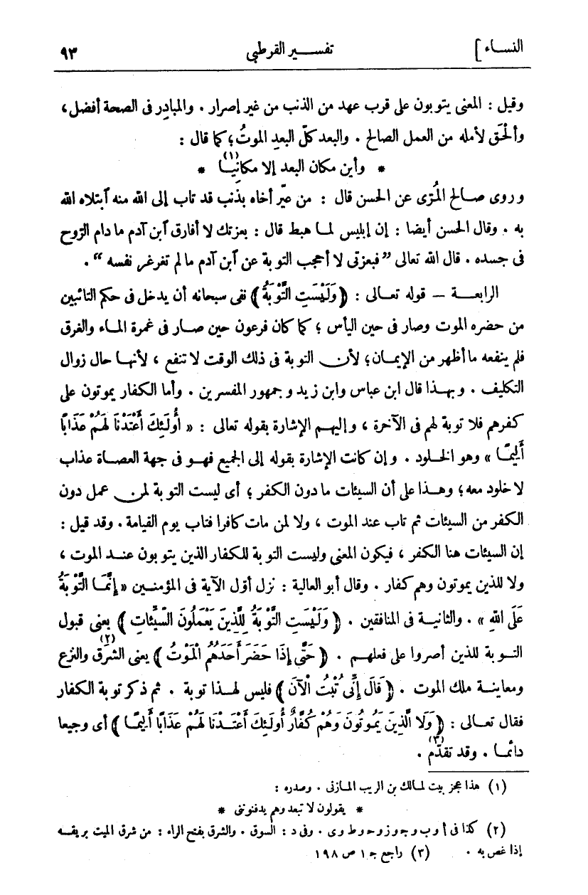 وَرَوَى صَالِحٌ الْمُرِّيُّ عَنِ الْحَسَنِ قَالَ: مَنْ عَيَّرَ أَخَاهُ بِذَنْبٍ قَدْ تَابَ إِلَى اللَّهِ مِنْهُ ابْتَلَاهُ اللَّهُ بِهِ. وَقَالَ الْحَسَنُ أَيْضًا: إِنَّ إِبْلِيسَ لَمَّا هَبَطَ قَالَ: بِعِزَّتِكَ لَا أُفَارِقُ ابْنَ آدَمَ مَا دَامَ الرُّوحُ فِي جَسَدِهِ. قَالَ اللَّهُ تَعَالَى: (فَبِعِزَّتِي لَا أَحْجُبُ التَّوْبَةَ عَنِ ابْنِ آدَمَ مَا لَمْ تُغَرْغِرْ نَفْسُهُ). الرَّابِعَةُ- قَوْلُهُ تَعَالَى: (وَلَيْسَتِ التَّوْبَةُ) نَفَى سُبْحَانَهُ أَنْ يُدْخِلَ فِي حُكْمِ التَّائِبِينَ مَنْ حَضَرَهُ الْمَوْتُ وَصَارَ فِي حِينِ الْيَأْسِ، كَمَا كَانَ فِرْعَوْنُ حِينَ صَارَ فِي غَمْرَةِ الْمَاءِ وَالْغَرَقِ فَلَمْ يَنْفَعْهُ مَا أَظْهَرَ مِنَ الْإِيمَانِ، لِأَنَّ التَّوْبَةَ فِي ذَلِكَ الْوَقْتِ لَا تَنْفَعُ، لِأَنَّهَا حَالُ زَوَالِ التَّكْلِيفِ. وَبِهَذَا قَالَ ابْنُ عَبَّاسٍ وَابْنُ زَيْدٍ وَجُمْهُورُ الْمُفَسِّرِينَ. وَأَمَّا الْكُفَّارُ يَمُوتُونَ عَلَى كُفْرِهِمْ فَلَا تَوْبَةَ لَهُمْ فِي الْآخِرَةِ، وَإِلَيْهِمُ الْإِشَارَةُ بِقَوْلِهِ تَعَالَى: (أُولئِكَ أَعْتَدْنا لَهُمْ عَذاباً أَلِيماً) وَهُوَ الْخُلُودُ. وَإِنْ كَانَتِ الْإِشَارَةُ بِقَوْلِهِ إِلَى الْجَمِيعِ فَهُوَ فِي جِهَةِ الْعُصَاةِ عَذَابٌ لَا خُلُودَ مَعَهُ، وَهَذَا عَلَى أَنَّ السَّيِّئَاتِ مَا دُونَ الْكُفْرِ، أَيْ لَيْسَتِ التَّوْبَةُ لِمَنْ عَمِلَ دُونَ الْكُفْرِ مِنَ السَّيِّئَاتِ ثُمَّ تَابَ عِنْدَ الْمَوْتِ، وَلَا لِمَنْ مَاتَ كَافِرًا فَتَابَ يَوْمَ الْقِيَامَةِ. وَقَدْ قِيلَ: إِنَّ السَّيِّئَاتِ هُنَا الْكُفْرُ، فَيَكُونُ الْمَعْنَى وَلَيْسَتِ التَّوْبَةُ لِلْكُفَّارِ الَّذِينَ يَتُوبُونَ عِنْدَ الْمَوْتِ، وَلَا لِلَّذِينَ يَمُوتُونَ وَهُمْ كُفَّارٌ. وَقَالَ أَبُو الْعَالِيَةِ: نَزَلَ أَوَّلُ الْآيَةِ فِي الْمُؤْمِنِينَ (إِنَّمَا التَّوْبَةُ عَلَى اللَّهِ). وَالثَّانِيةُ فِي الْمُنَافِقِينَ. (وَلَيْسَتِ التَّوْبَةُ لِلَّذِينَ يَعْمَلُونَ السَّيِّئاتِ) يَعْنِي قَبُولَ التَّوْبَةِ لِلَّذِينَ أَصَرُّوا عَلَى فِعْلِهِمْ. (حَتَّى إِذا حَضَرَ أَحَدَهُمُ الْمَوْتُ) يَعْنِي الشَّرَقَ «٢» وَالنَّزْعَ وَمُعَايَنَةَ مَلَكِ الْمَوْتِ. (قالَ إِنِّي تُبْتُ الْآنَ) فَلَيْسَ لِهَذَا تَوْبَةٌ. ثُمَّ ذَكَرَ تَوْبَةَ الْكُفَّارِ فَقَالَ تَعَالَى: (وَلَا الَّذِينَ يَمُوتُونَ وَهُمْ كُفَّارٌ أُولئِكَ أَعْتَدْنا لَهُمْ عَذاباً أَلِيماً) أَيْ وجيعا دائما. وقد تقدم «٣».