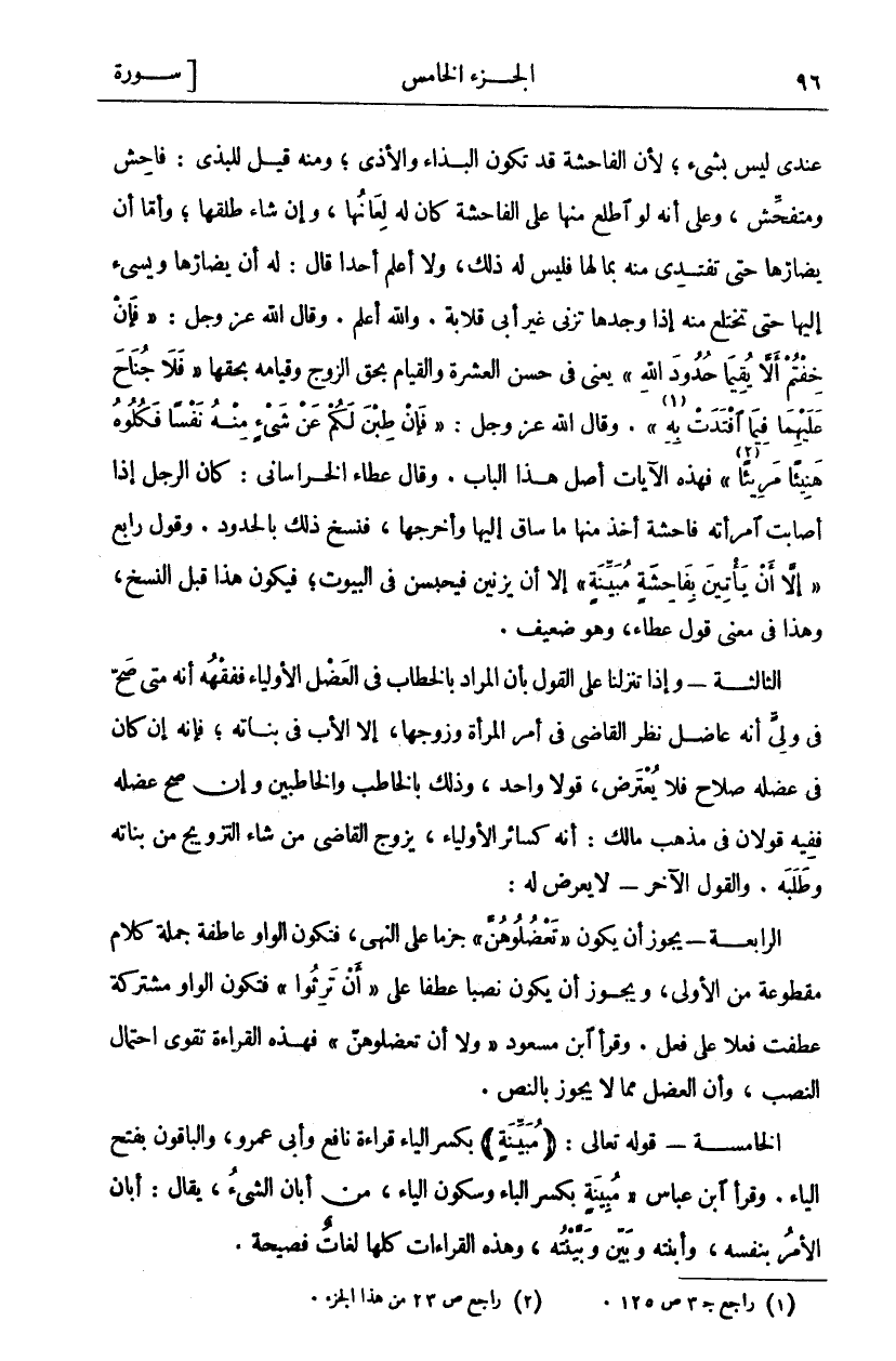 عِنْدِي لَيْسَ بِشَيْءٍ، لِأَنَّ الْفَاحِشَةَ قَدْ تَكُونُ البذاء والأذى، ومنه قيل للبذي: فَاحِشٌ وَمُتَفَحِّشٌ، وَعَلَى أَنَّهُ لَوِ اطَّلَعَ مِنْهَا عَلَى الْفَاحِشَةِ كَانَ لَهُ لِعَانُهَا، وَإِنْ شَاءَ طَلَّقَهَا، وَأَمَّا أَنْ يُضَارَّهَا حَتَّى تَفْتَدِيَ مِنْهُ بِمَالِهَا فَلَيْسَ لَهُ ذَلِكَ، وَلَا أَعْلَمُ أَحَدًا قَالَ: لَهُ أَنْ يُضَارَّهَا وَيُسِيءَ إِلَيْهَا حَتَّى تَخْتَلِعَ مِنْهُ إِذَا وَجَدَهَا تَزْنِي غَيْرَ أَبِي قِلَابَةَ. وَاللَّهُ أَعْلَمُ. وَقَالَ اللَّهُ عَزَّ وَجَلَّ: (فَإِنْ خِفْتُمْ أَلَّا يُقِيما حُدُودَ اللَّهِ) يَعْنِي فِي حُسْنِ الْعِشْرَةِ وَالْقِيَامِ بِحَقِّ الزَّوْجِ وَقِيَامِهِ بِحَقِّهَا (فَلا جُناحَ عَلَيْهِما فِيمَا افْتَدَتْ بِهِ «١»). وَقَالَ اللَّهُ عَزَّ وَجَلَّ: (فَإِنْ طِبْنَ لَكُمْ عَنْ شَيْءٍ مِنْهُ نَفْساً فَكُلُوهُ هَنِيئاً مَرِيئاً «٢») فهذه الآيات أصل هذا الباب. وقال عطاء الخراساني: كان الرجل إذا أصابت امرأته فاحشة أخذ منها ما ساق إليها وأخرجها، فنسخ ذلك بالحدود. وَقَوْلٌ رَابِعٌ (إِلَّا أَنْ يَأْتِينَ بِفاحِشَةٍ مُبَيِّنَةٍ) إِلَّا أَنْ يَزْنِينَ فَيُحْبَسْنَ فِي الْبُيُوتِ، فَيَكُونُ هَذَا قَبْلَ النَّسْخِ، وَهَذَا فِي مَعْنَى قَوْلِ عَطَاءٍ، وَهُوَ ضَعِيفٌ. الثَّالِثَةُ- وَإِذَا تَنَزَّلْنَا عَلَى الْقَوْلِ بِأَنَّ الْمُرَادَ بِالْخِطَابِ فِي الْعَضْلِ الْأَوْلِيَاءُ فَفِقْهُهُ أَنَّهُ مَتَى صَحَّ فِي وَلِيٍّ أَنَّهُ عَاضِلٌ نَظَرَ الْقَاضِي فِي أَمْرِ الْمَرْأَةِ وَزَوْجِهَا، إِلَّا الْأَبَ فِي بَنَاتِهِ، فَإِنَّهُ إِنْ كَانَ في عضلة صلاح فلا يعترض، قولا واحد، وَذَلِكَ بِالْخَاطِبِ وَالْخَاطِبِينَ وَإِنْ صَحَّ عَضْلُهُ فَفِيهِ قَوْلَانِ فِي مَذْهَبِ مَالِكٍ: أَنَّهُ كَسَائِرِ الْأَوْلِيَاءِ، يُزَوِّجُ الْقَاضِي مَنْ شَاءَ التَّزْوِيجَ مِنْ بَنَاتِهِ وَطَلَبَهُ. وَالْقَوْلُ الْآخَرُ- لَا يَعْرِضُ لَهُ: الرَّابِعَةُ- يجور أَنْ يَكُونَ (تَعْضُلُوهُنَّ) جَزْمًا عَلَى النَّهْيِ، فَتَكُونُ الْوَاوُ عَاطِفَةَ جُمْلَةِ كَلَامٍ مَقْطُوعَةً مِنَ الْأُولَى، وَيَجُوزُ أَنْ يَكُونَ نَصْبًا عَطْفًا عَلَى (أَنْ تَرِثُوا) فَتَكُونُ الْوَاوُ مُشْتَرَكَةً: عَطَفَتْ فِعْلًا عَلَى فِعْلٍ. وَقَرَأَ ابْنُ مَسْعُودٍ (وَلَا أَنْ تَعْضُلُوهُنَّ) فَهَذِهِ الْقِرَاءَةُ تُقَوِّي احْتِمَالَ النَّصْبِ، وَأَنَّ الْعَضْلَ مِمَّا لَا يَجُوزُ بِالنَّصِّ. الْخَامِسَةُ- قَوْلُهُ تَعَالَى: (مُبَيِّنَةٍ) بِكَسْرِ الْيَاءِ قِرَاءَةُ نَافِعٍ وَأَبِي عَمْرٍو، وَالْبَاقُونَ بِفَتْحِ الْيَاءِ. وَقَرَأَ ابْنُ عَبَّاسٍ (مُبِينَةٍ) بِكَسْرِ الْبَاءِ وَسُكُونِ الْيَاءِ، مِنْ أَبَانَ الشَّيْءَ، يُقَالُ: أَبَانَ الْأَمْرُ بِنَفْسِهِ، وَأَبَنْتُهُ وَبَيَّنَ وَبَيَّنْتُهُ، وهذه القراءات كلها لغات فصيحة.