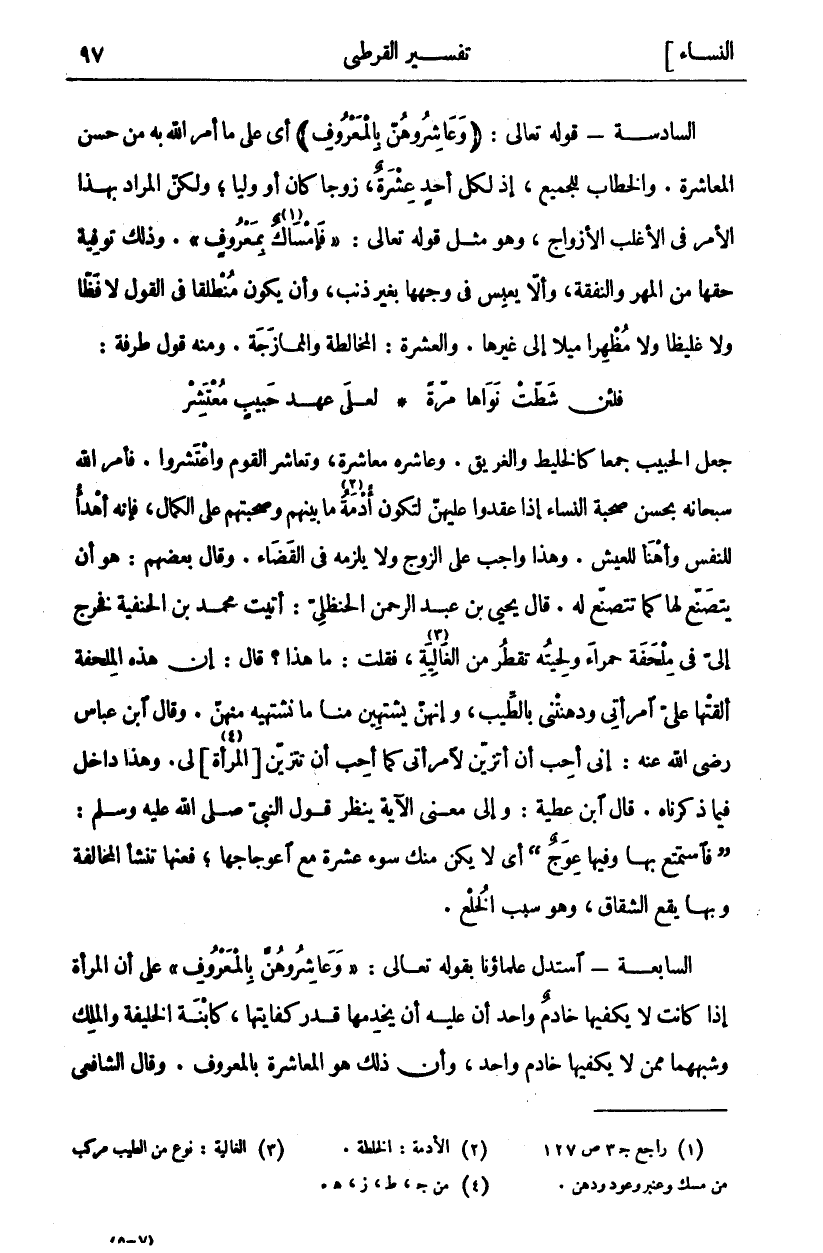 جَعَلَ الْحَبِيبَ جَمْعًا كَالْخَلِيطِ وَالْغَرِيقِ. وَعَاشَرَهُ مُعَاشَرَةً، وَتَعَاشَرَ الْقَوْمُ وَاعْتَشَرُوا. فَأَمَرَ اللَّهُ سُبْحَانَهُ بِحُسْنِ صُحْبَةِ النِّسَاءِ إِذَا عَقَدُوا عَلَيْهِنَّ لِتَكُونَ أَدَمَةُ «٢» مَا بَيْنَهُمْ وَصُحْبَتُهُمْ عَلَى الْكَمَالِ، فَإِنَّهُ أَهْدَأُ لِلنَّفْسِ وَأَهْنَأُ لِلْعَيْشِ. وَهَذَا وَاجِبٌ عَلَى الزَّوْجِ وَلَا يَلْزَمُهُ فِي الْقَضَاءِ. وَقَالَ بَعْضُهُمْ: هُوَ أن يتصنع لها كما تتصنع له. وقال يَحْيَى بْنُ عَبْدِ الرَّحْمَنِ الْحَنْظَلِيُّ: أَتَيْتُ مُحَمَّدَ ابن الْحَنَفِيَّةِ فَخَرَجَ إِلَيَّ فِي مِلْحَفَةٍ حَمْرَاءَ وَلِحْيَتُهُ تَقْطُرُ مِنَ الْغَالِيَةِ «٣»، فَقُلْتُ: مَا هَذَا؟ قَالَ: إِنَّ هَذِهِ الْمِلْحَفَةَ أَلْقَتْهَا عَلَيَّ امْرَأَتِي وَدَهَنَتْنِي بالطيب، وإنهن يشتهين مناما نَشْتَهِيهِ مِنْهُنَّ. وَقَالَ ابْنُ عَبَّاسٍ رَضِيَ اللَّهُ عَنْهُ: إِنِّي أُحِبُّ أَنْ أَتَزَيَّنَ لِامْرَأَتِي كَمَا أُحِبُّ أَنْ تَتَزَيَّنَ [الْمَرْأَةُ «٤»] لِي. وَهَذَا دَاخِلٌ فِيمَا ذَكَرْنَاهُ. قَالَ ابْنُ عَطِيَّةَ: وَإِلَى مَعْنَى الْآيَةِ يُنْظَرُ قَوْلُ النَّبِيِّ صَلَّى اللَّهُ عَلَيْهِ وَسَلَّمَ: (فَاسْتَمْتِعْ بِهَا وَفِيهَا عِوَجٌ) أَيْ لَا يَكُنْ مِنْكَ سُوءُ عِشْرَةٍ مَعَ اعْوِجَاجِهَا، فَعَنْهَا تَنْشَأُ الْمُخَالَفَةُ وَبِهَا يَقَعُ الشِّقَاقُ، وَهُوَ سَبَبُ الْخُلْعِ. السَّابِعَةُ- اسْتَدَلَّ عُلَمَاؤُنَا بِقَوْلِهِ تَعَالَى: (وَعاشِرُوهُنَّ بِالْمَعْرُوفِ) عَلَى أَنَّ الْمَرْأَةَ إِذَا كَانَتْ لَا يَكْفِيهَا خَادِمٌ وَاحِدٌ أَنَّ عَلَيْهِ أَنْ يَخْدُمَهَا قَدْرَ كِفَايَتِهَا، كَابْنَةِ الْخَلِيفَةِ وَالْمَلِكِ وَشَبَهِهِمَا مِمَّنْ لَا يَكْفِيهَا خَادِمٌ وَاحِدٌ، وَأَنَّ ذَلِكَ هُوَ المعاشرة بالمعروف. وقال الشافعي