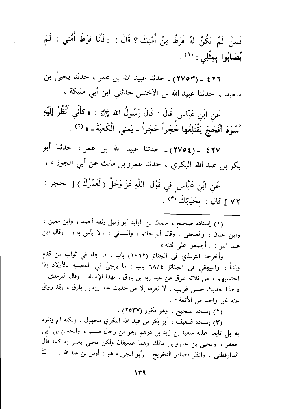 2753 - حَدَّثَنَا عُبَيْدُ اللَّهِ بْنُ عُمَرَ، حَدَّثَنَا يَحْيَى بْنُ سَعِيدٍ، حَدَّثَنَا عُبَيْدُ اللَّهِ بْنُ الْأَخْنَسِ، حَدَّثَنِي ابْنُ أَبِي مُلَيْكَةَ، عَنِ ابْنِ عَبَّاسٍ، قَالَ: قَالَ رَسُولُ اللَّهِ صَلَّى اللهُ عَلَيْهِ وَسَلَّمَ: «§كَأَنِّي أَنْظُرُ إِلَيْهِ أَسْوَدَ أَفْحَجَ يَقْتَلِعُهَا حَجَرًا حَجَرًا - يَعْنِي الْكَعْبَةَ -» Kإسناده صحيح