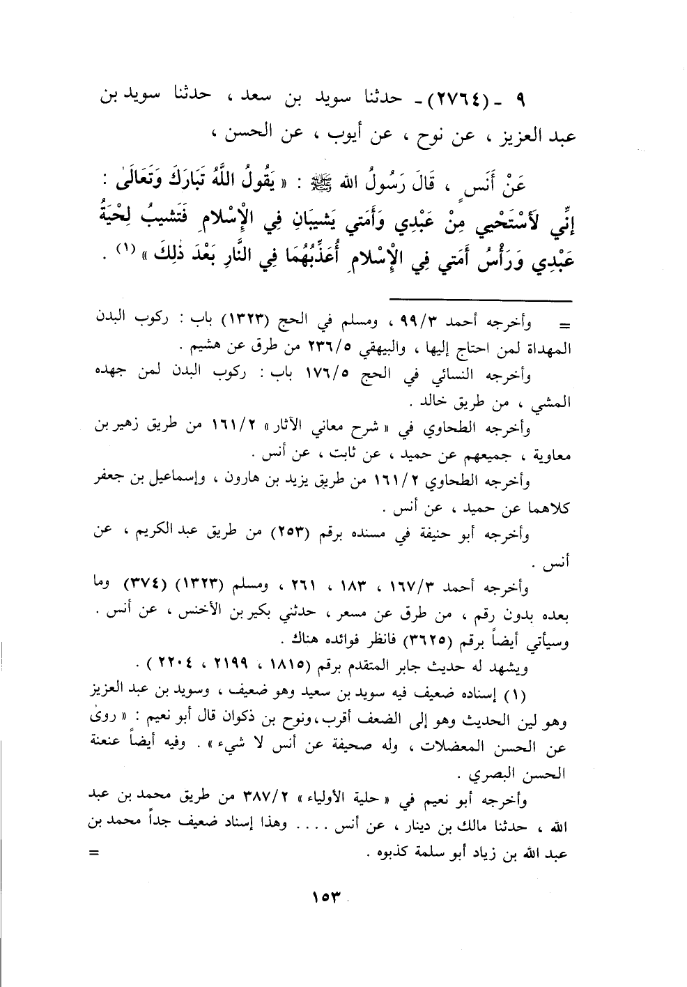 2764 - حَدَّثَنَا سُوَيْدُ بْنُ سَعِيدٍ، حَدَّثَنَا سُوَيْدُ بْنُ عَبْدِ الْعَزِيزِ، عَنْ نُوحٍ، عَنْ أَيُّوبَ، عَنِ الْحَسَنِ، عَنْ أَنَسٍ، قَالَ رَسُولُ اللَّهِ صَلَّى اللهُ عَلَيْهِ وَسَلَّمَ: " يَقُولُ اللَّهُ تَبَارَكَ وَتَعَالَى: §إِنِّي لَأَسْتَحْيِي مِنْ عَبْدِي وَأَمَتِي يَشِيبَانِ فِي الْإِسْلَامِ، فَتَشِيبُ لِحْيَةُ عَبْدِي وَرَأْسُ أَمَتِي فِي الْإِسْلَامِ أُعَذِبُهُمَا فِي النَّارِ بَعْدَ ذَلِكَ "Kإسناده ضعيف