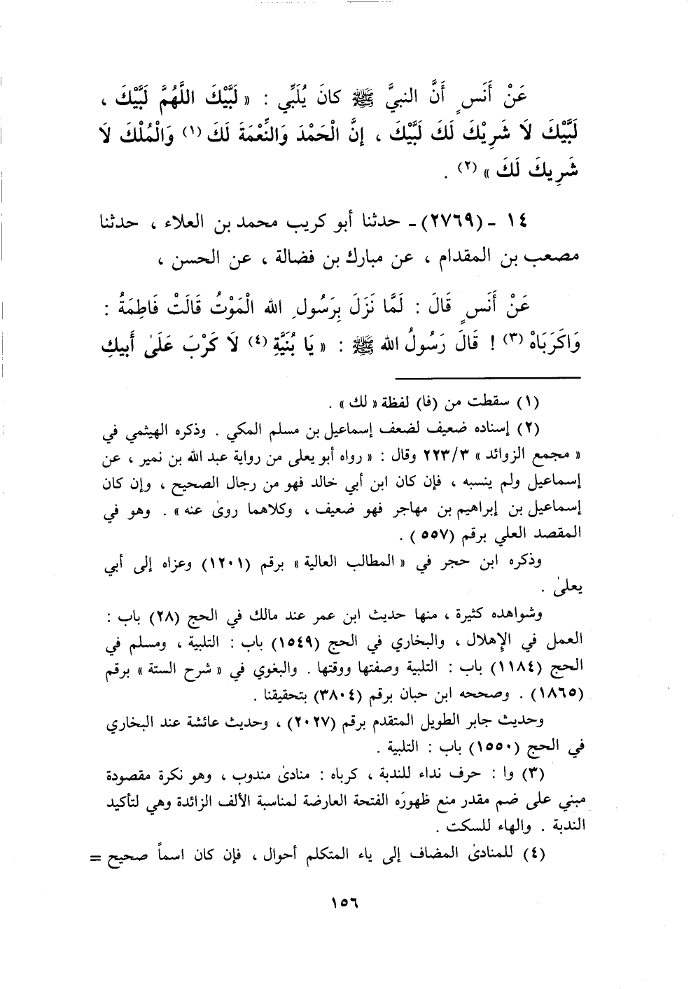 2769 - حَدَّثَنَا أَبُو كُرَيْبٍ مُحَمَّدُ بْنُ الْعَلَاءِ، حَدَّثَنَا مُصْعَبُ بْنُ الْمِقْدَامِ، عَنْ مُبَارَكِ بْنِ فَضَالَةَ، عَنِ الْحَسَنِ، عَنْ أَنَسٍ، قَالَ: لَمَّا نَزَلَ بِرَسُولِ اللَّهِ الْمَوْتُ قَالَتْ فَاطِمَةُ: وَاكَرْبَاهُ، قَالَ رَسُولُ اللَّهِ صَلَّى اللهُ عَلَيْهِ وَسَلَّمَ: «يَا بُنَيَّةُ، §لَا كَرْبَ عَلَى أَبِيكِ بَعْدَ الْيَوْمِ» Kإسناده ضعيف