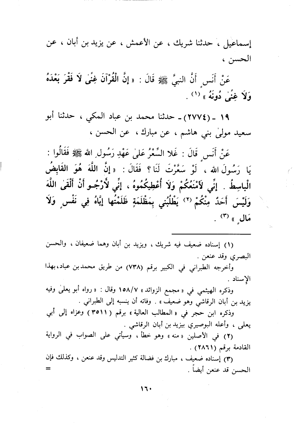 2774 - حَدَّثَنَا مُحَمَّدُ بْنُ عَبَّادٍ الْمَكِّيُّ، حَدَّثَنَا أَبُو سَعِيدٍ، مَوْلَى بَنِي هَاشِمٍ، عَنْ مُبَارَكٍ، عَنِ الْحَسَنِ، عَنْ أَنَسٍ، قَالَ: غَلَا السِّعْرُ عَلَى عَهْدِ رَسُولِ اللَّهِ صَلَّى اللهُ عَلَيْهِ وَسَلَّمَ فَقَالُوا: يَا رَسُولَ اللَّهِ، لَوْ سَعَّرْتَ لَنَا، فَقَالَ: «إِنَّ §اللَّهَ هُوَ الْقَابِضُ الْبَاسِطُ إِنِّي لَأَمْنَعُكُمْ وَلَا أُعْطِيكُمُوهُ، إِنِّي لَأَرْجُو، أَنْ أَلْقَى اللَّهَ وَلَيْسَ أَحَدٌ مِنْكُمْ يَطْلُبُنِي بِمَظْلِمَةٍ ظَلَمْتُهَا إِيَّاهُ فِي نَفْسٍ وَلَا مَالٍ» Kإسناده ضعيف